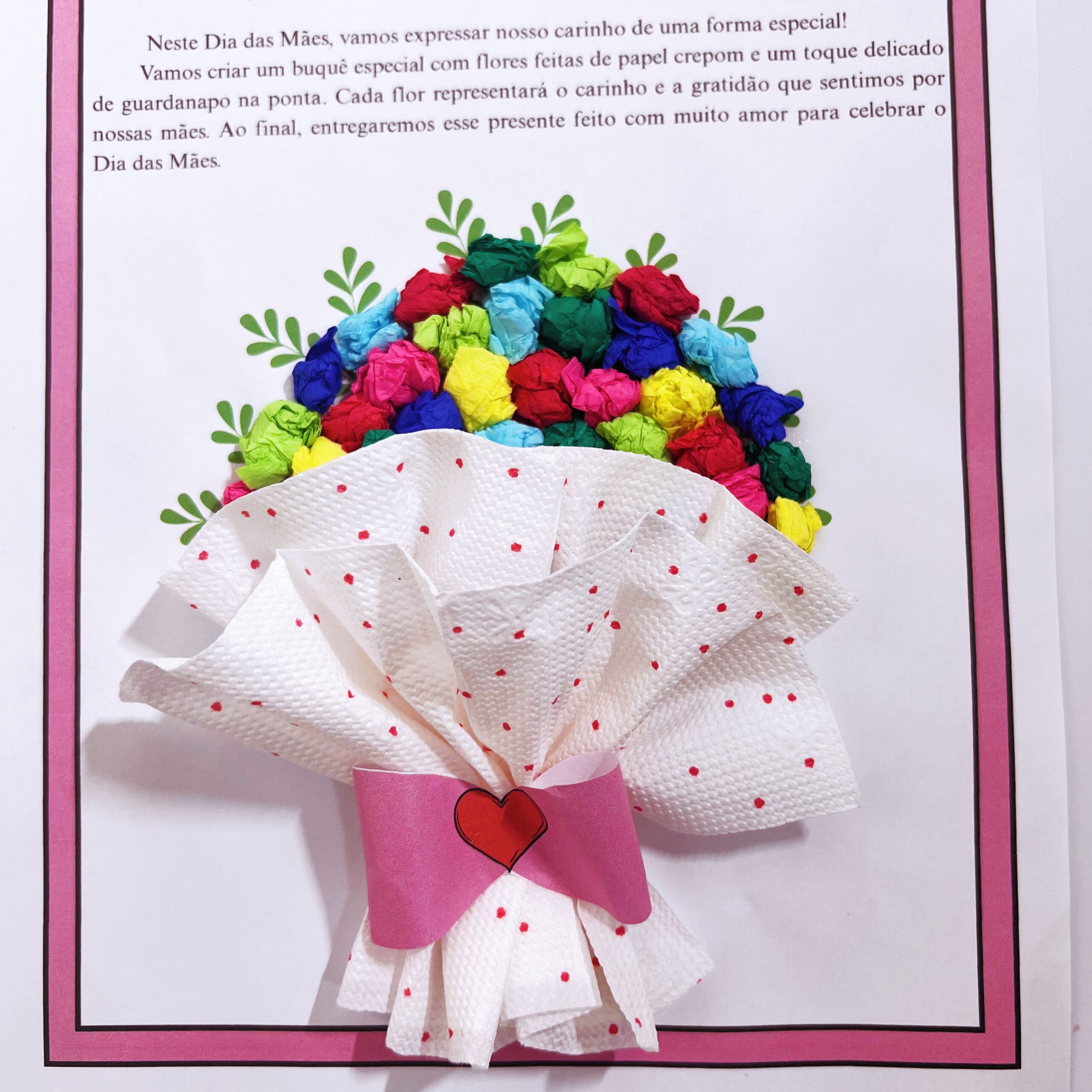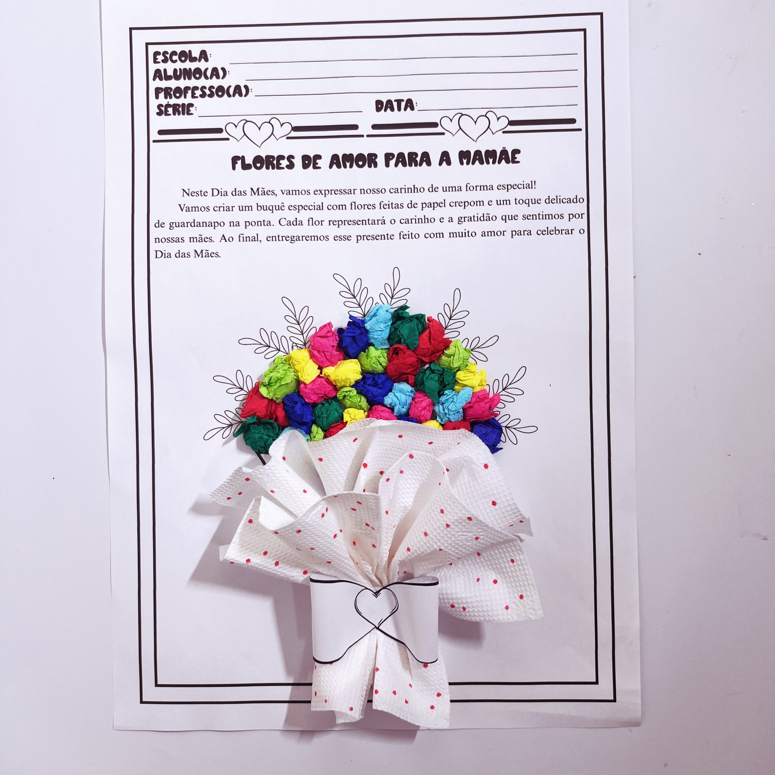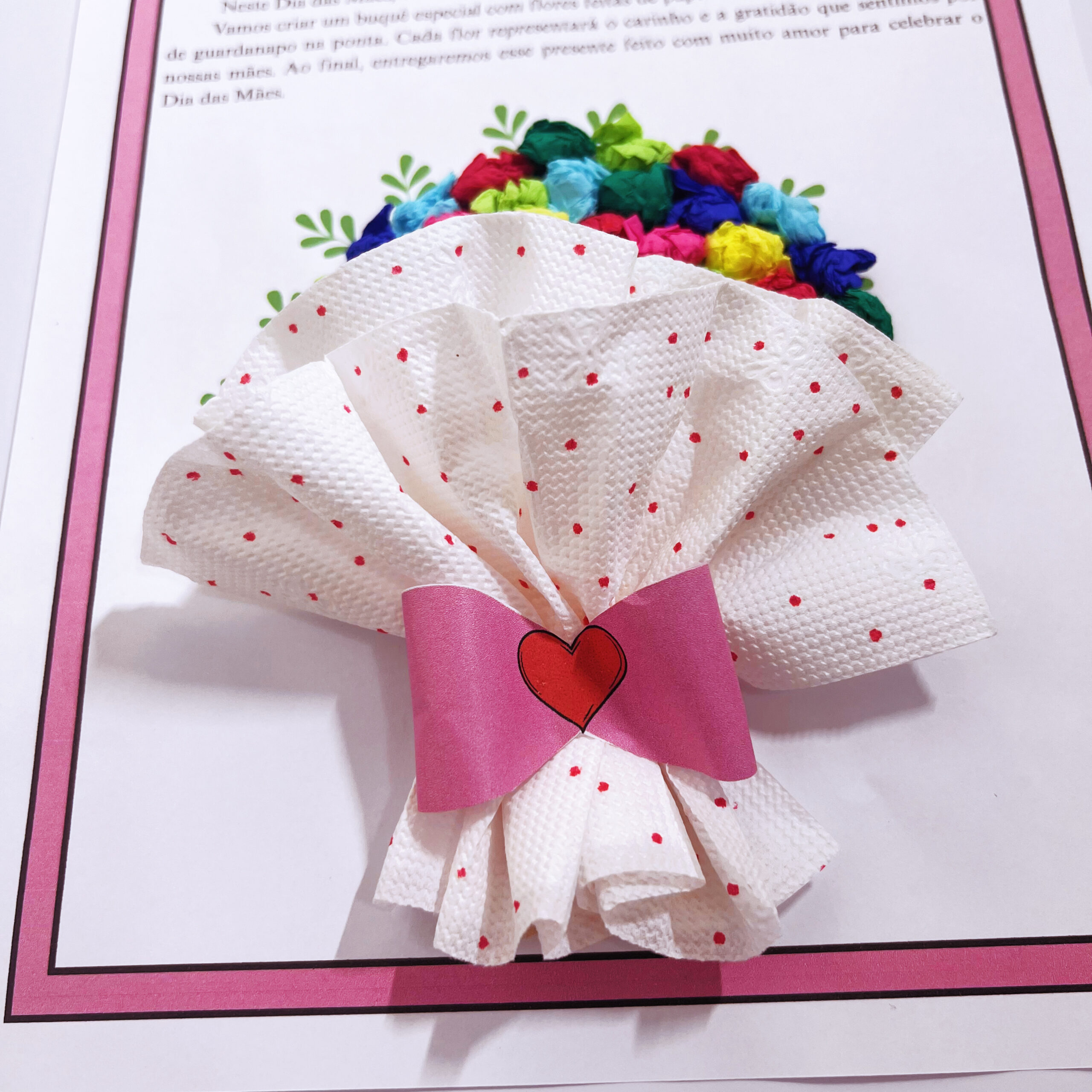 🎨 A ideia? Um lindo buquê feito com bolinhas de papel crepom e duas folhas de guardanapo, que se transformam em flores delicadas e simbólicas nas mãos dos pequenos.