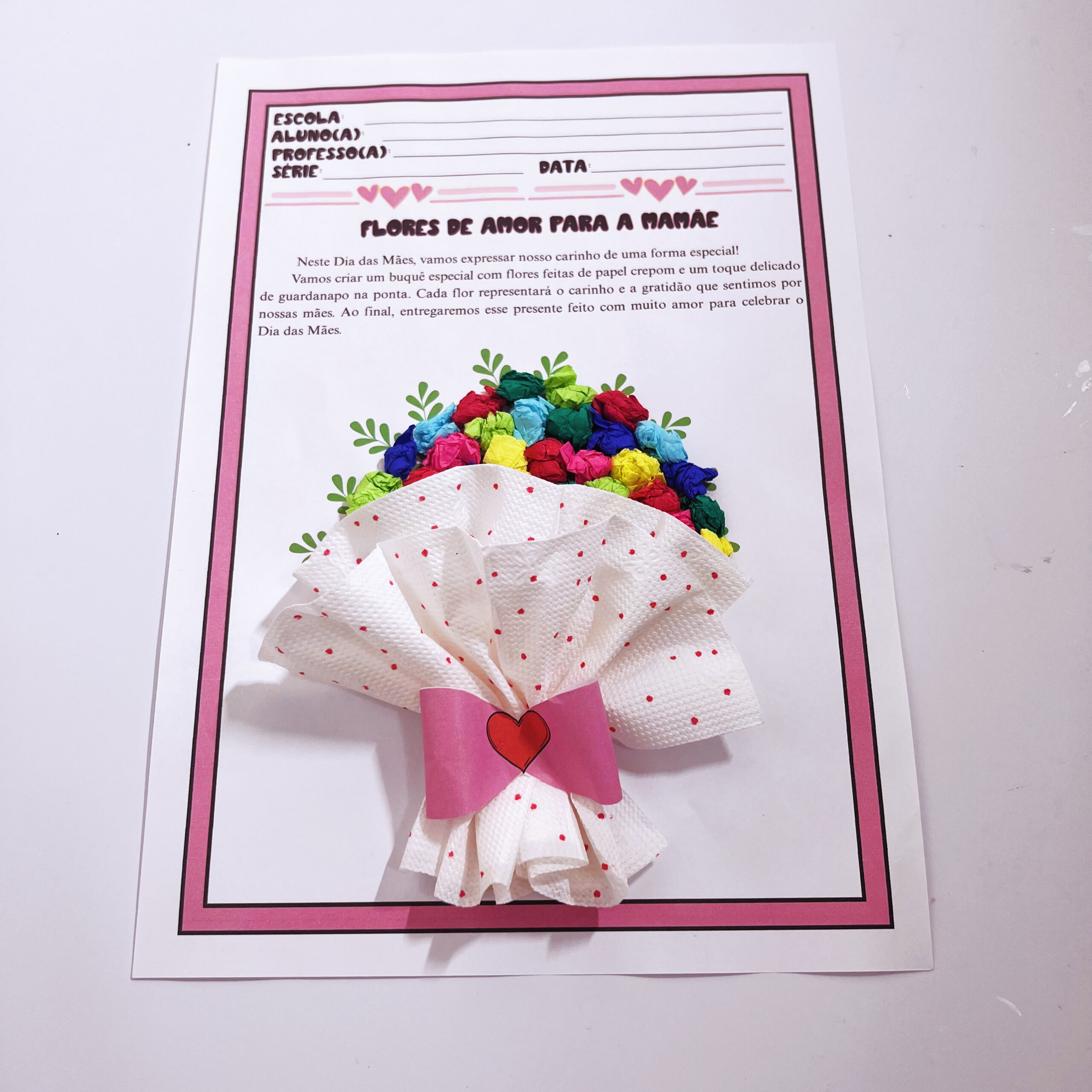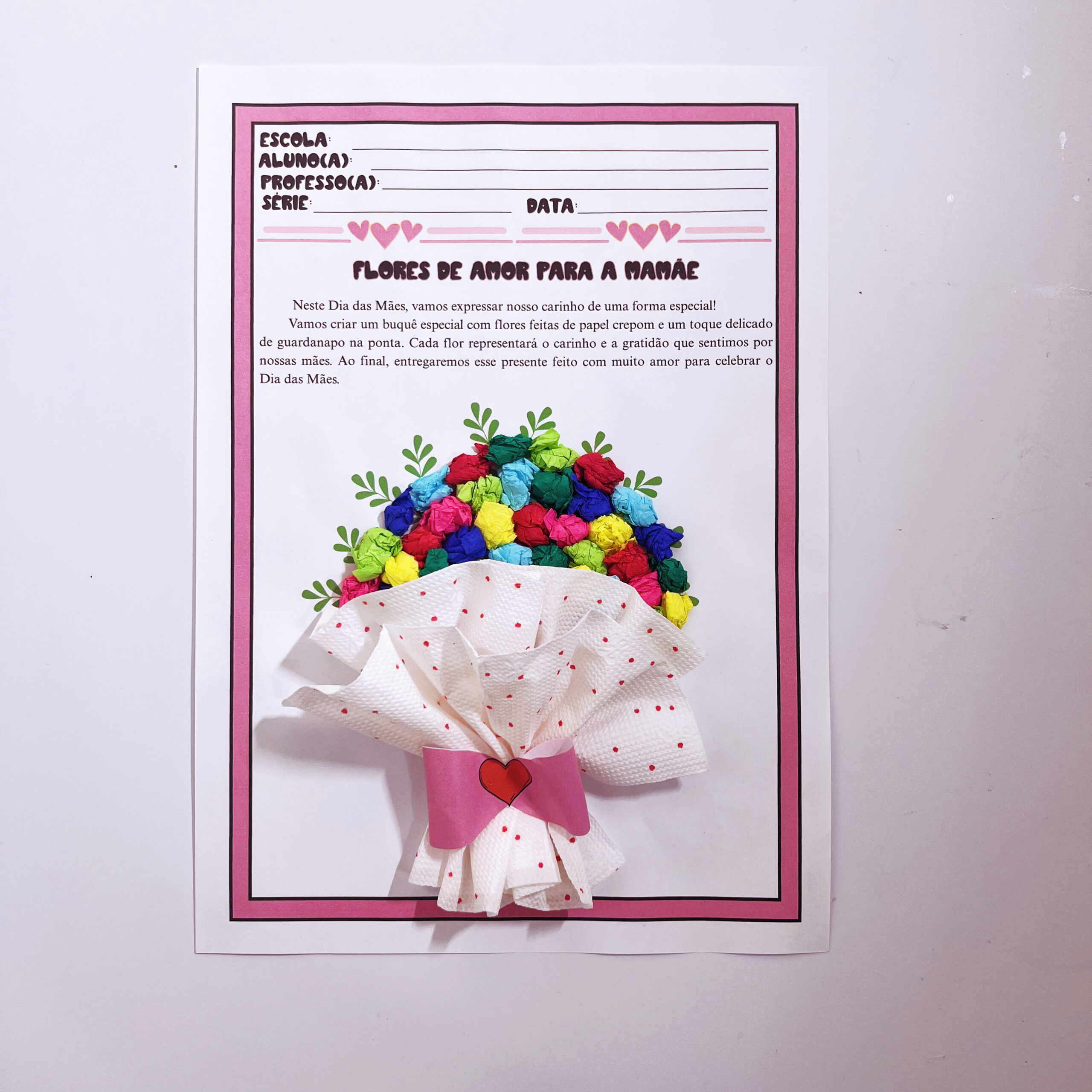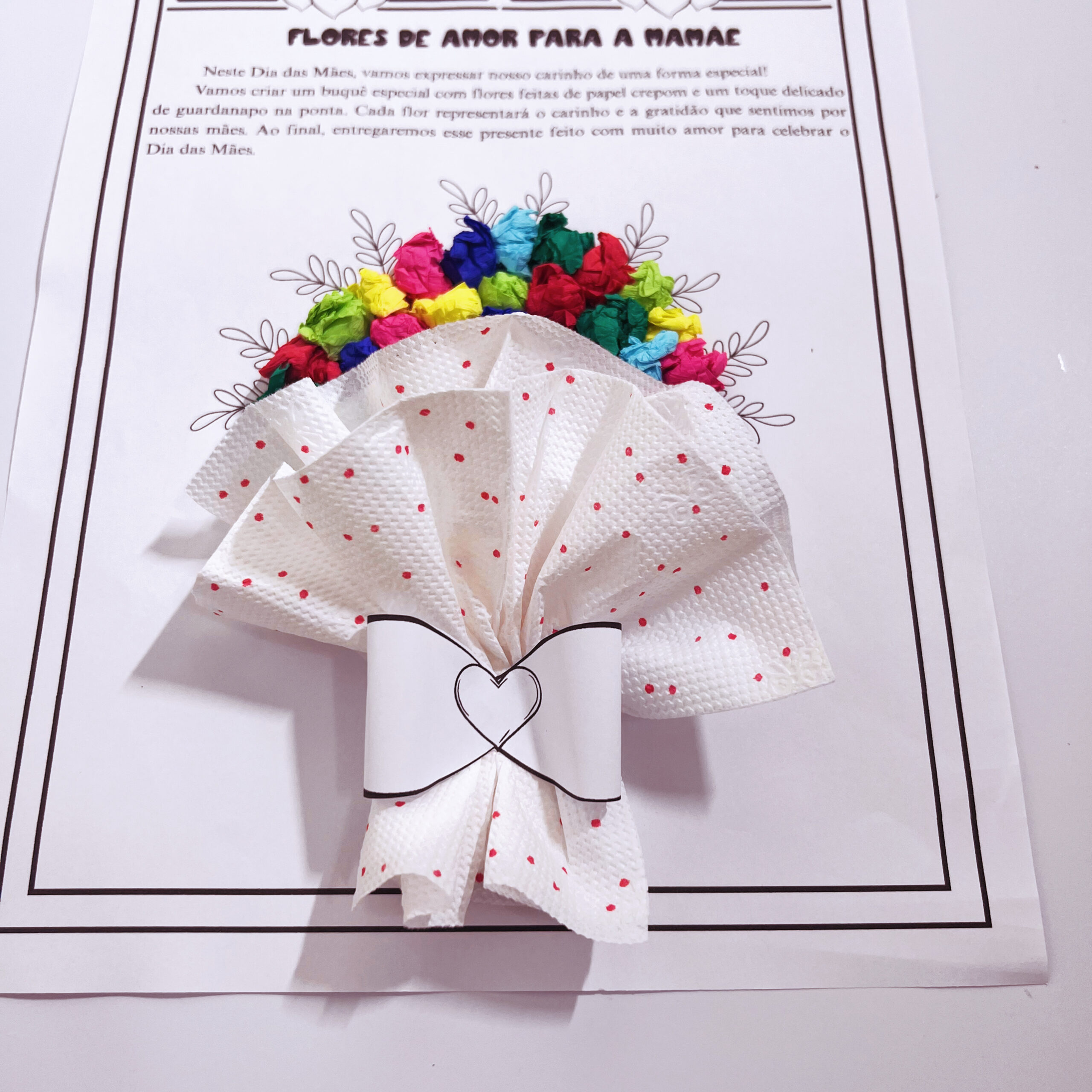 🎨 A ideia? Um lindo buquê feito com bolinhas de papel crepom e duas folhas de guardanapo, que se transformam em flores delicadas e simbólicas nas mãos dos pequenos.