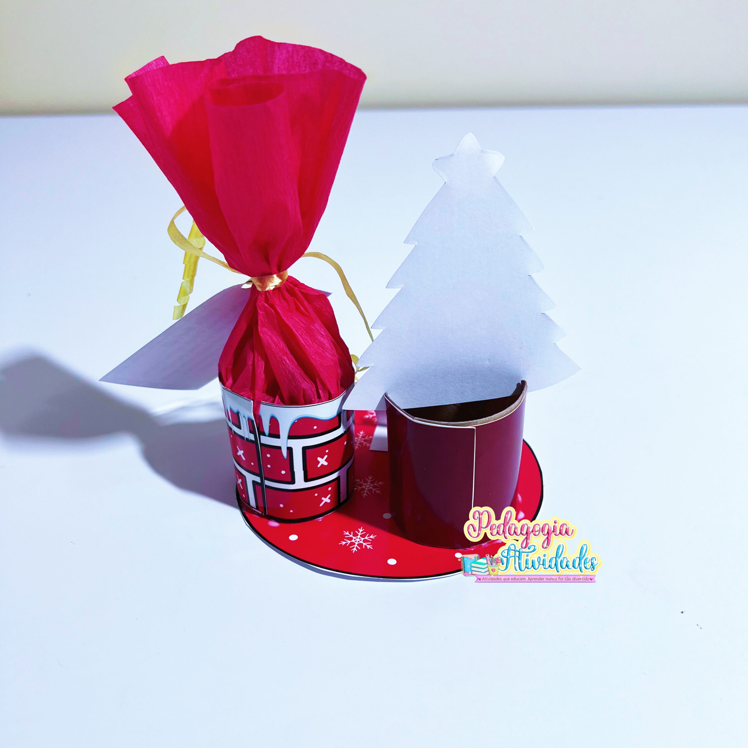 As crianças vão montar uma linda Árvore de Natal em 3D, feita com rolo de papel e decorada com papel crepom, formando uma chaminé super fofa — perfeita para guardar balinhas e pequenos doces! 🍬🎄