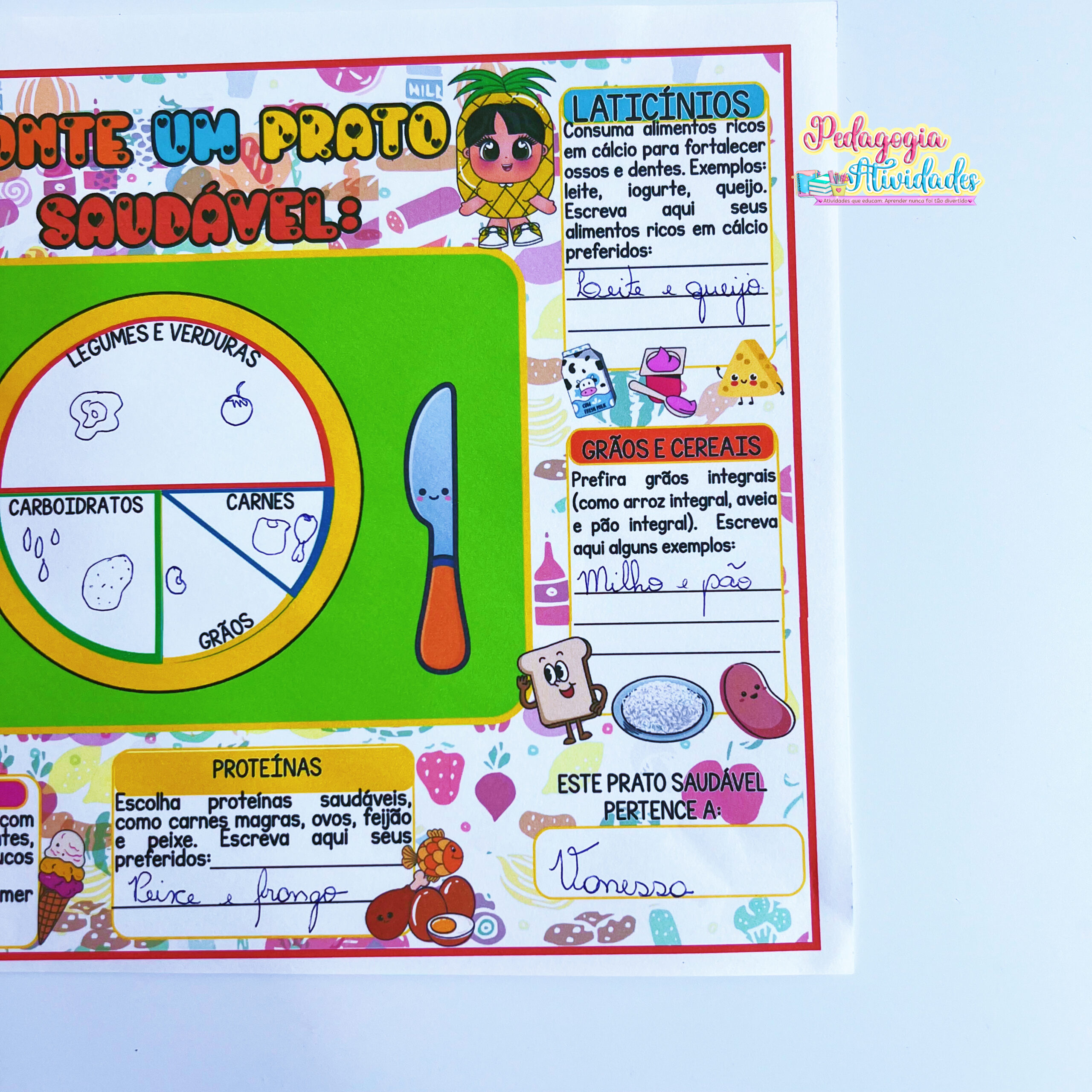 Cada espaço da folha convida à descoberta — frutas, verduras, proteínas, cereais e até as “calorias vazias” — tudo apresentado de maneira divertida e acessível para diferentes idades. 🍇🥕🍚