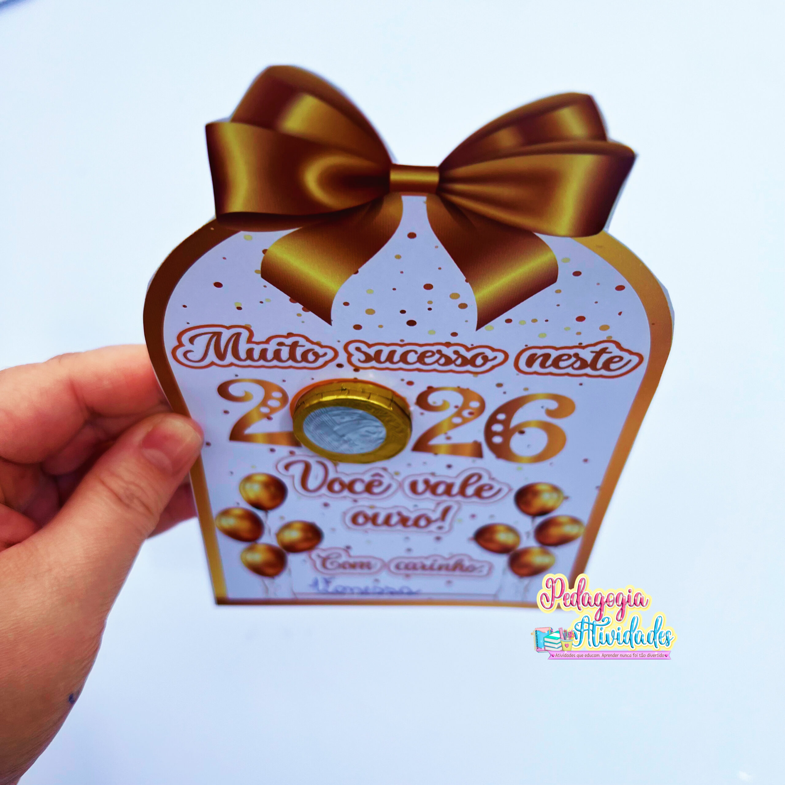 Esse cartão especial traz o número 2026, com espaço no 0 para encaixar uma moeda de chocolate, deixando o presente ainda mais divertido e significativo.