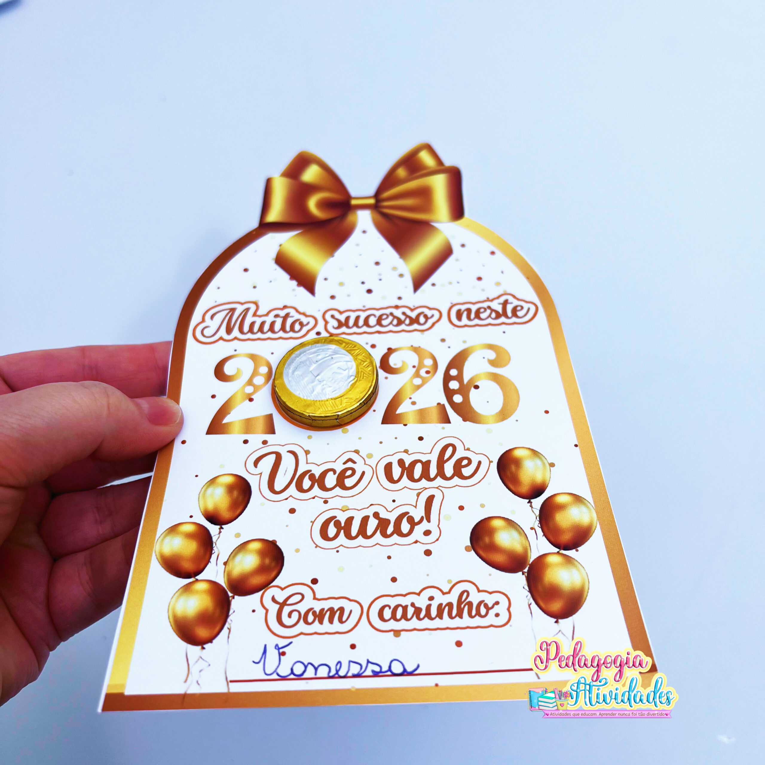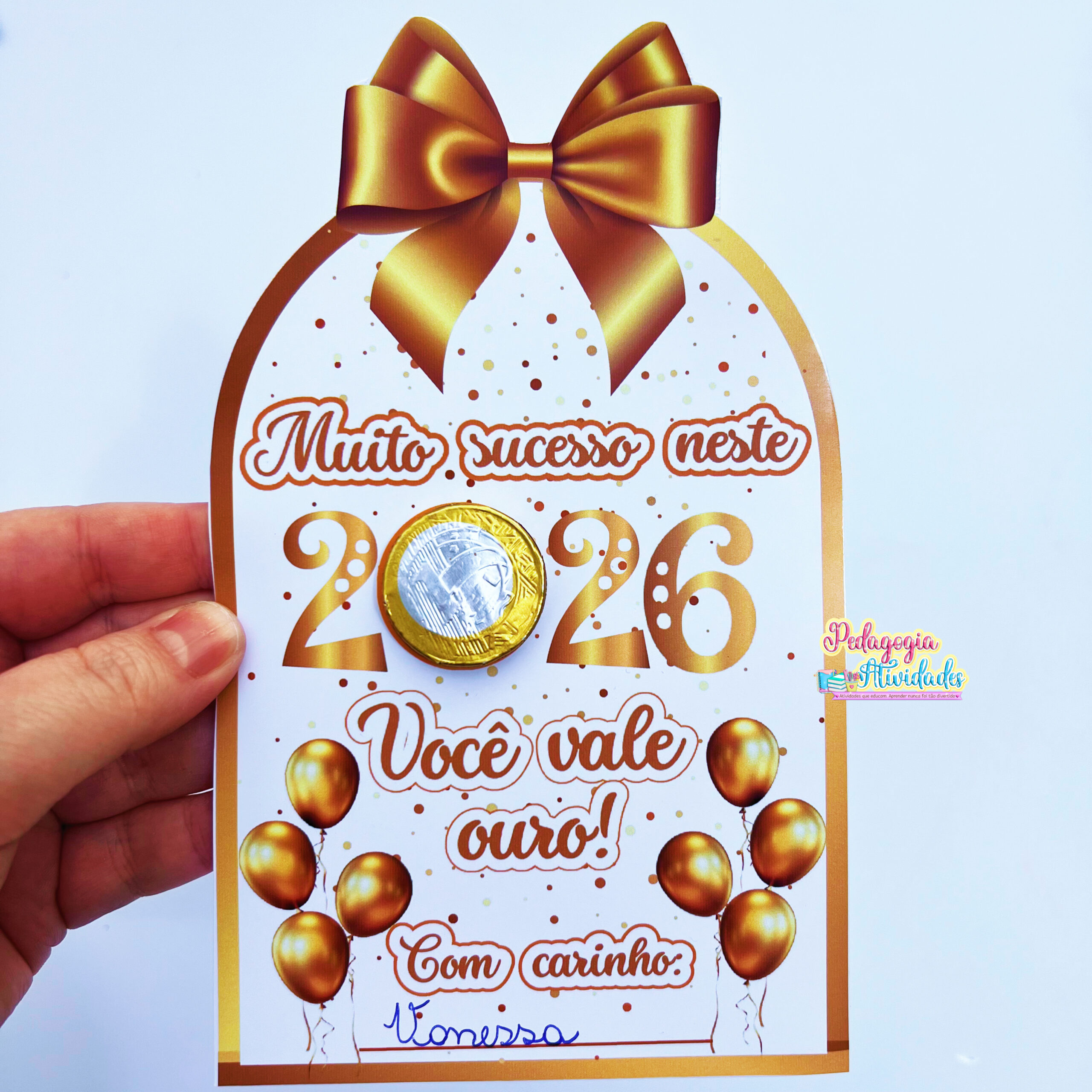 O Cartão “Muito Sucesso em 2026” é uma lembrancinha encantadora: no número “0”, a criança coloca uma moedinha de chocolate, simbolizando sorte, abundância e novos ciclos cheios de luz! ✨💛