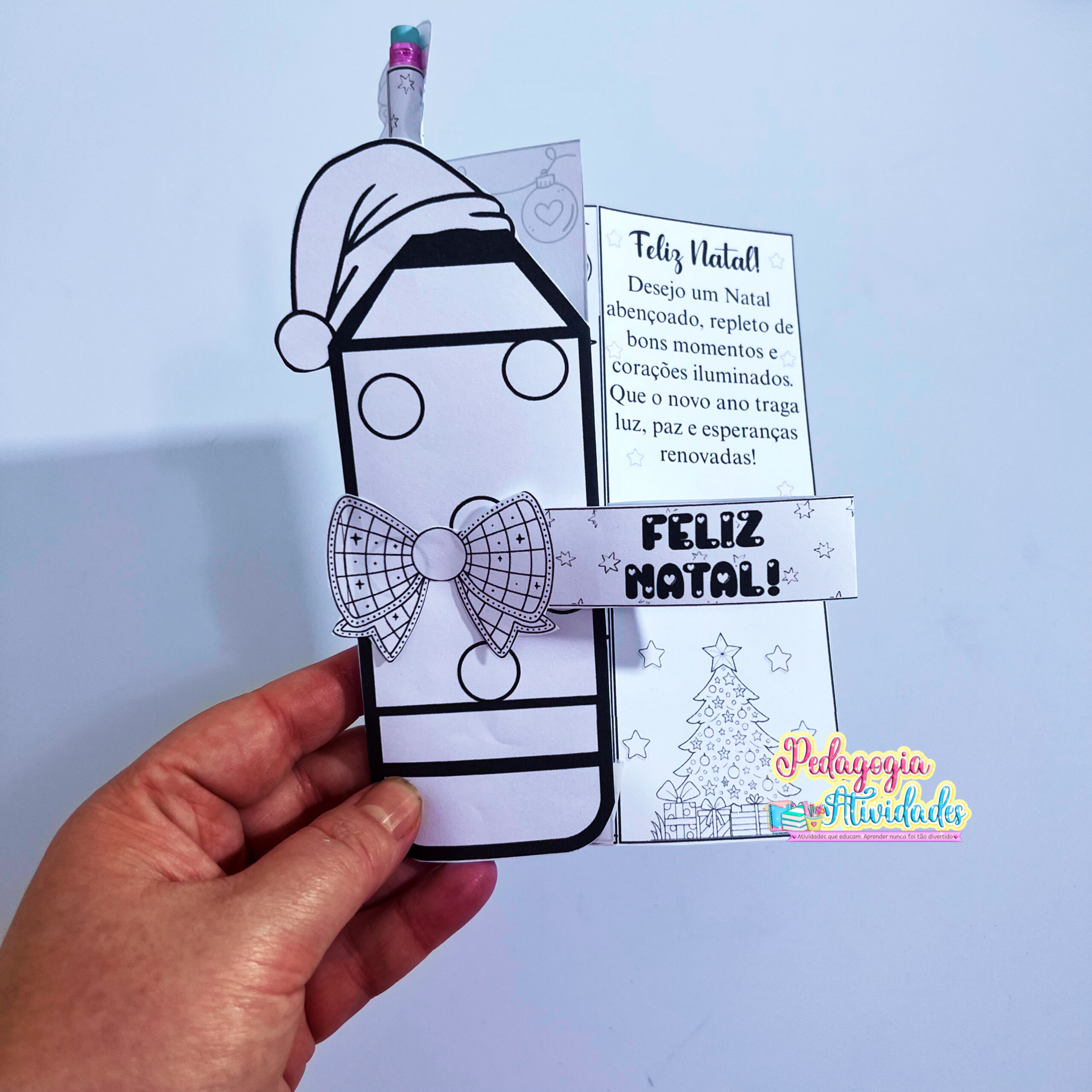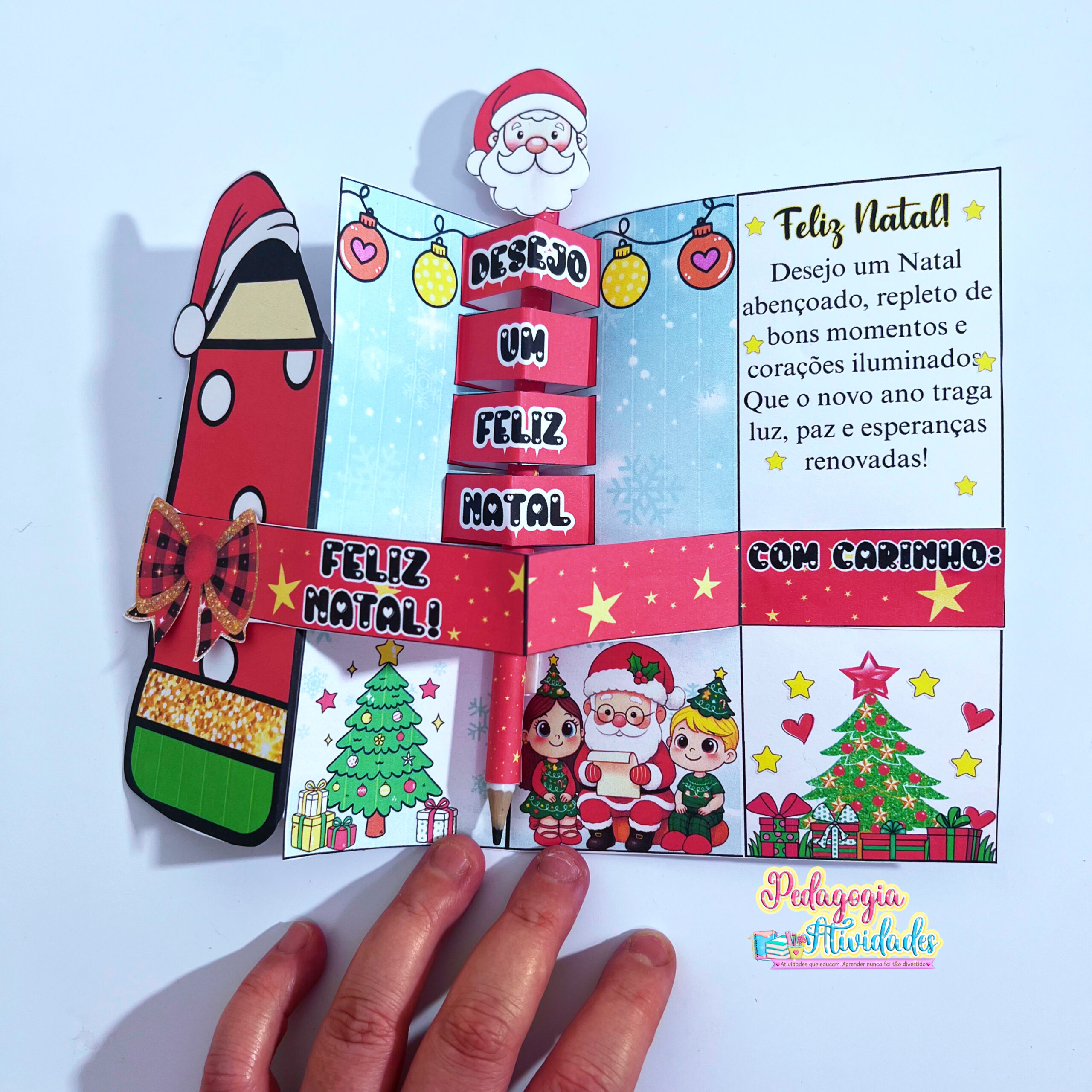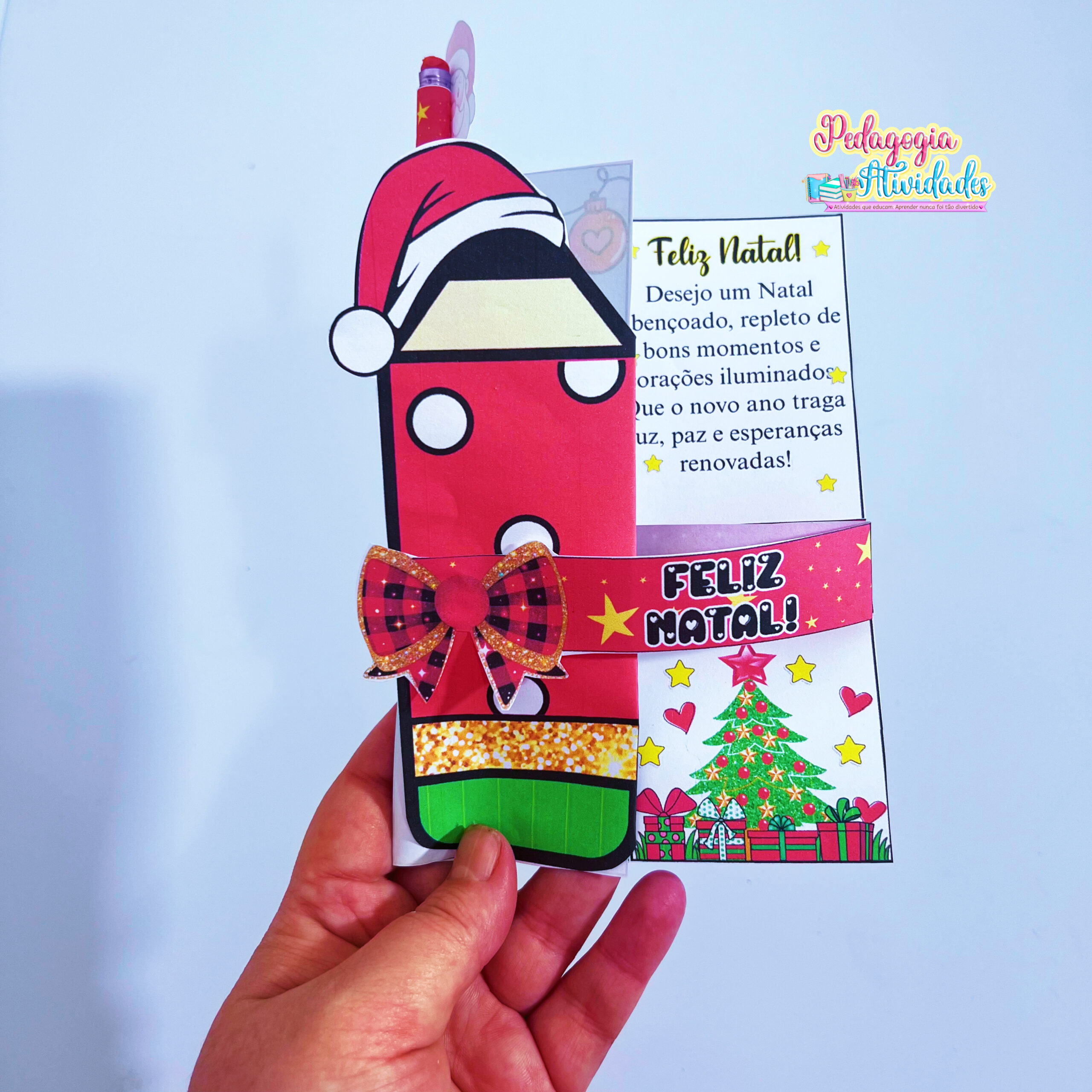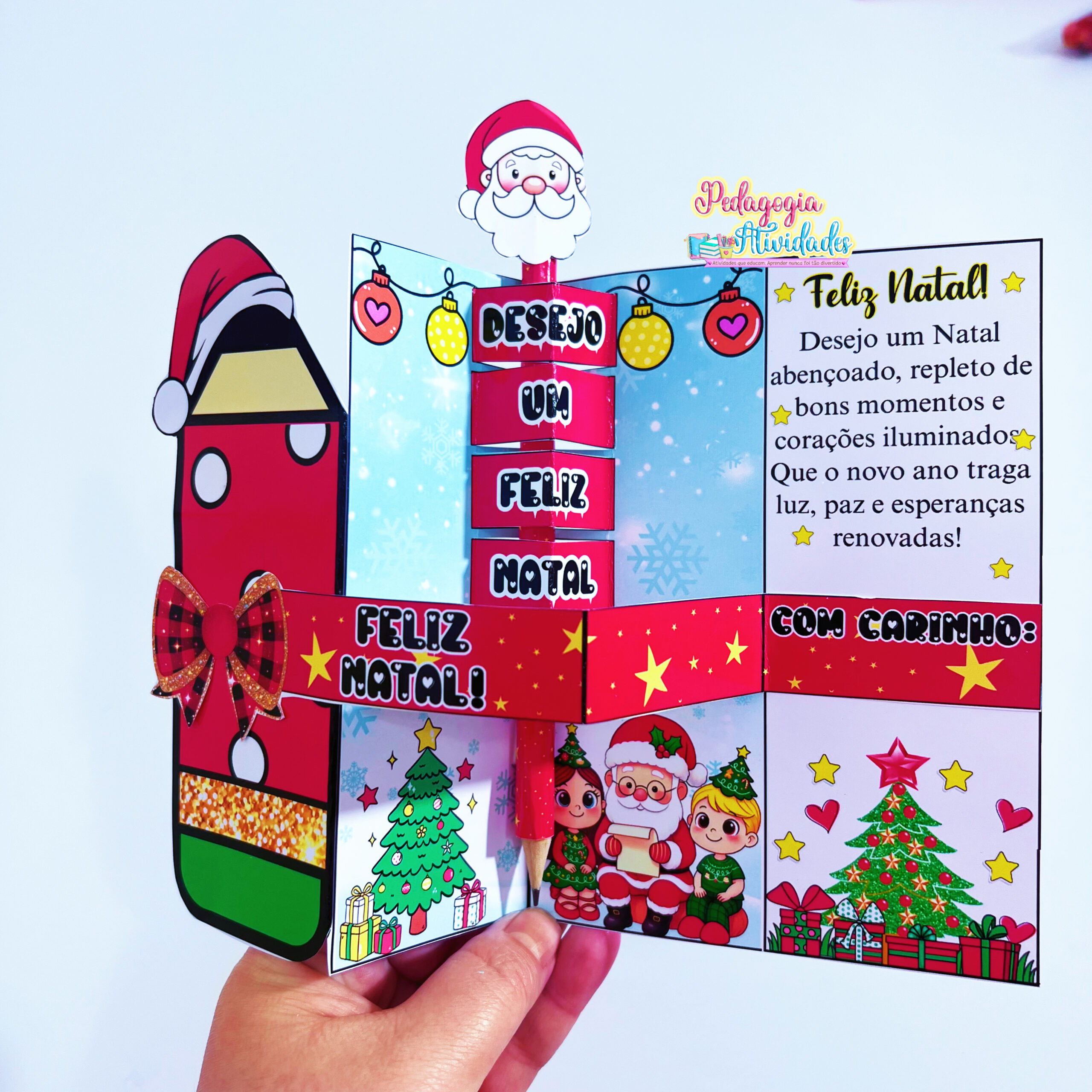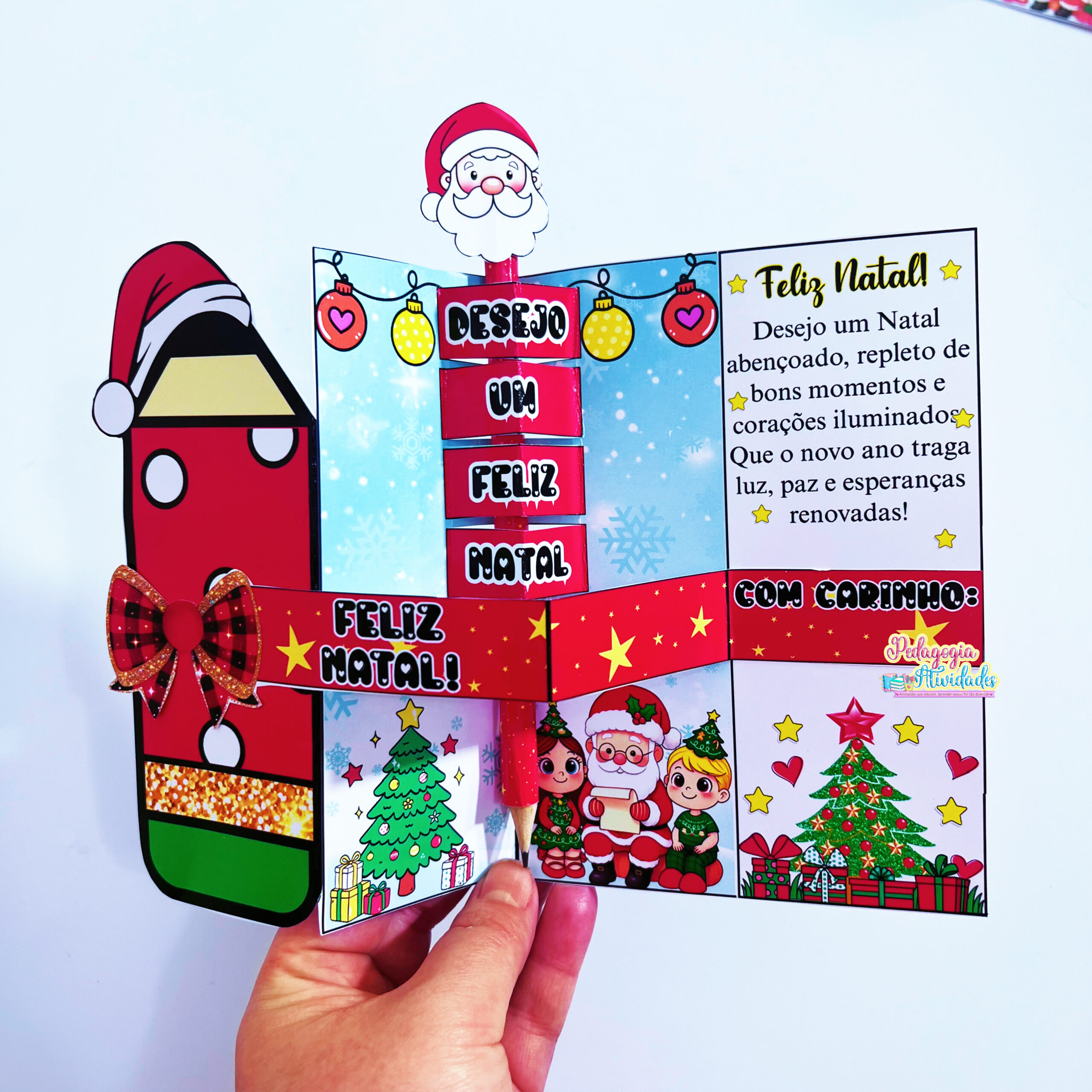 Ao abrir, uma frase salta em 3D, revelando toda a magia do Natal! E o toque final? Um lápis encapado com o rostinho do Papai Noel na ponta, que transforma o presente em um mimo inesquecível! ❤️