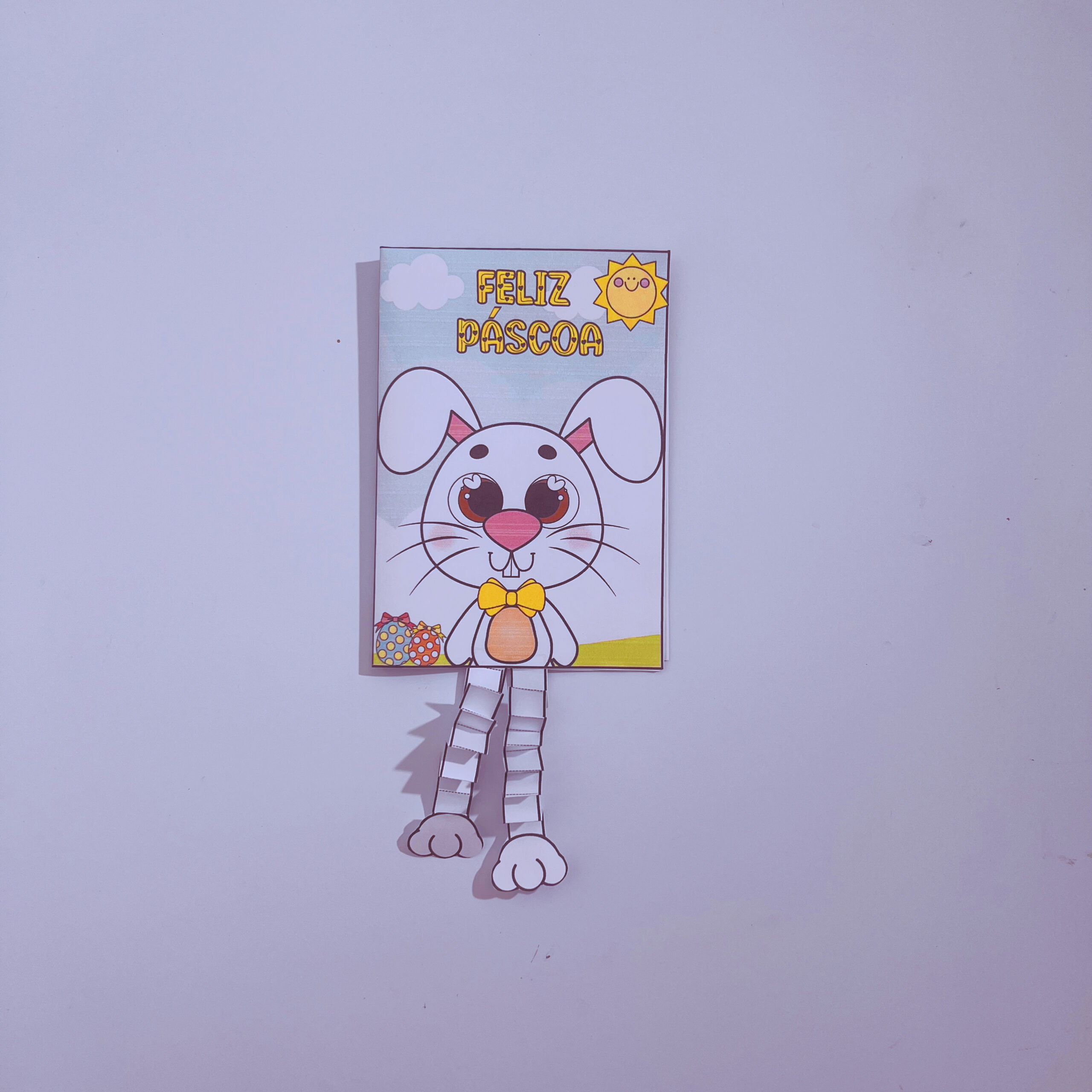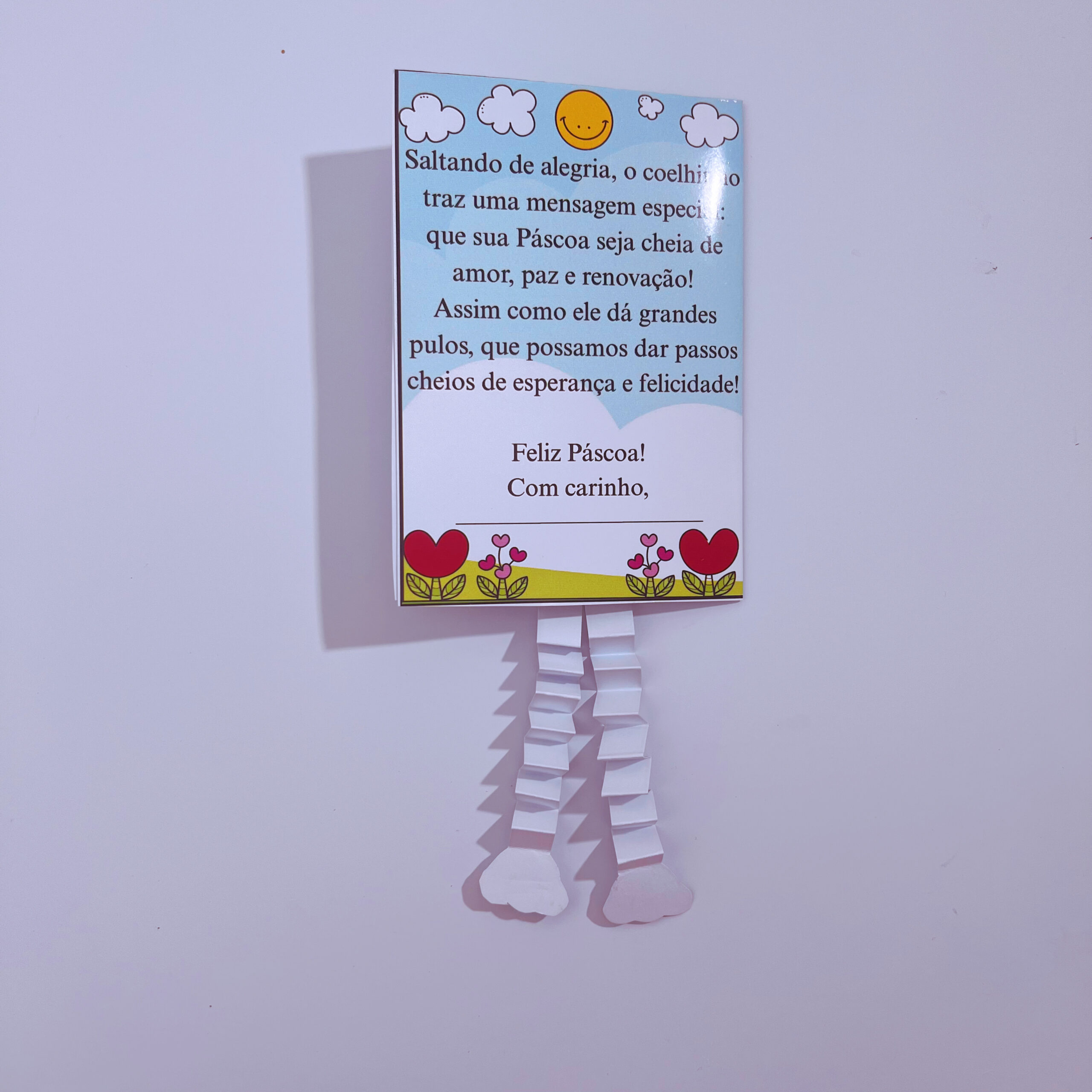 ✔️ Cartão de Páscoa com um coelhinho de pernas sanfonadas, trazendo um toque lúdico e divertido;