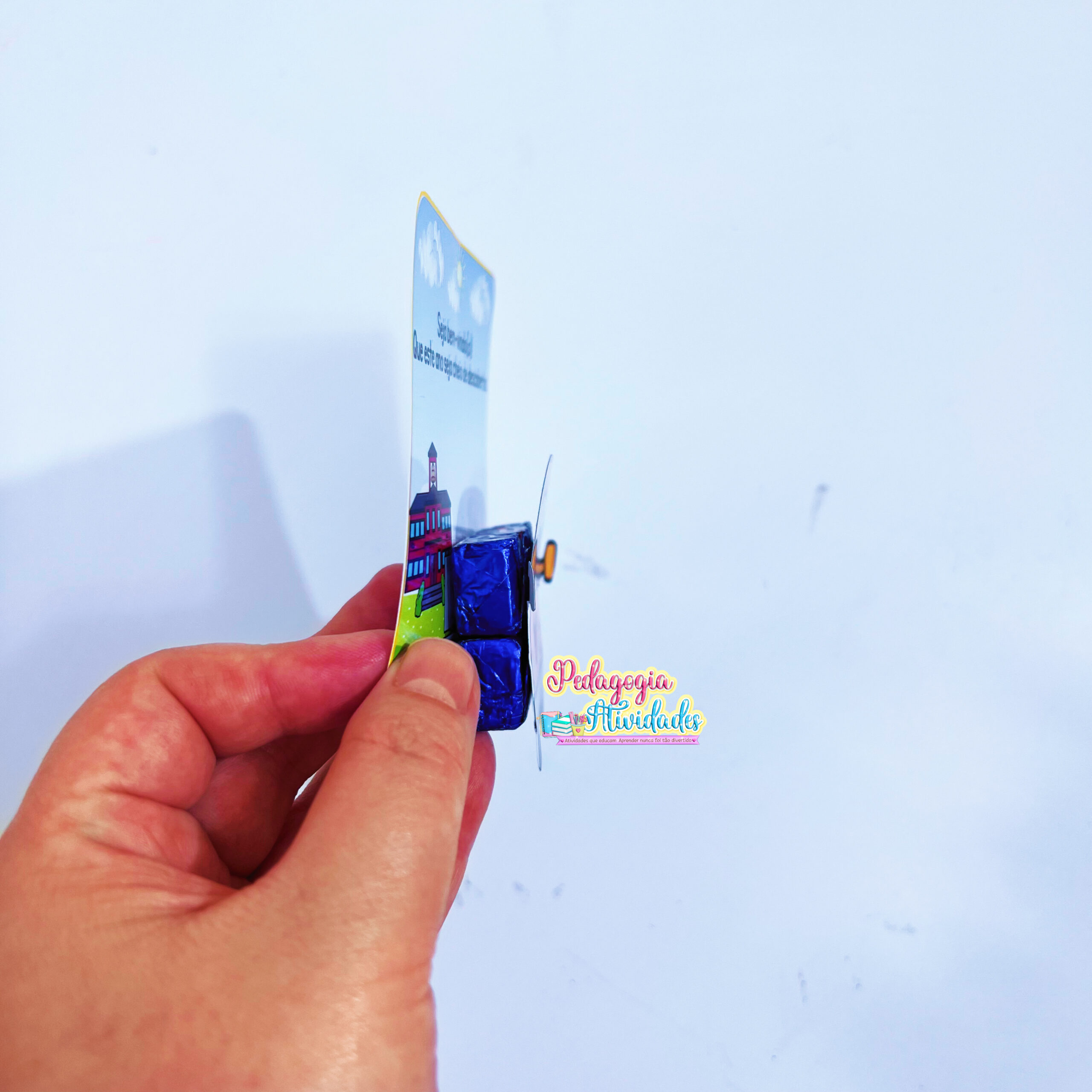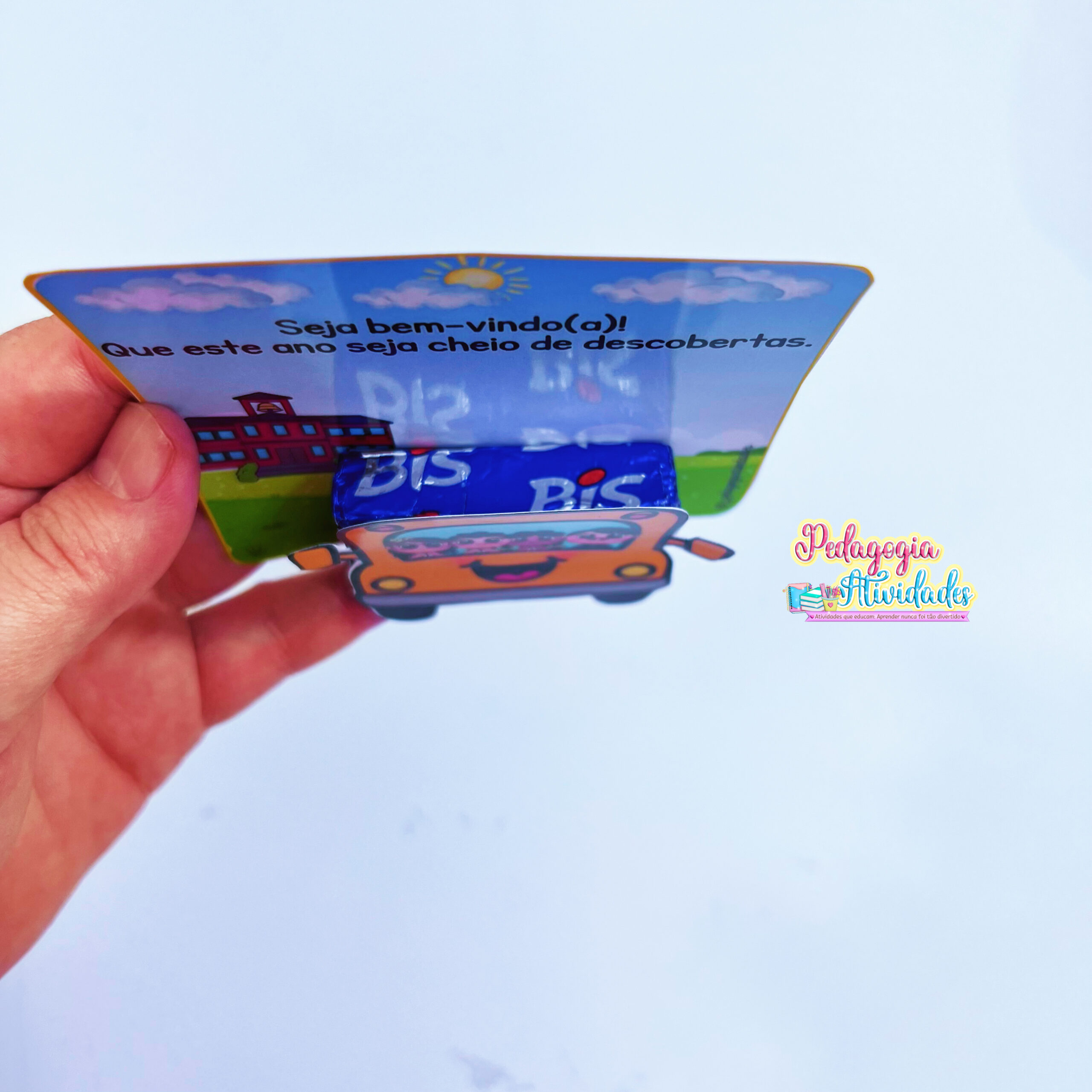 Com uma ilustração colorida e encantadora de um ônibus cheio de crianças, o cartão possui espaço especial para colar 2 Bis 🍫, tornando a lembrancinha ainda mais especial e cheia de significado.