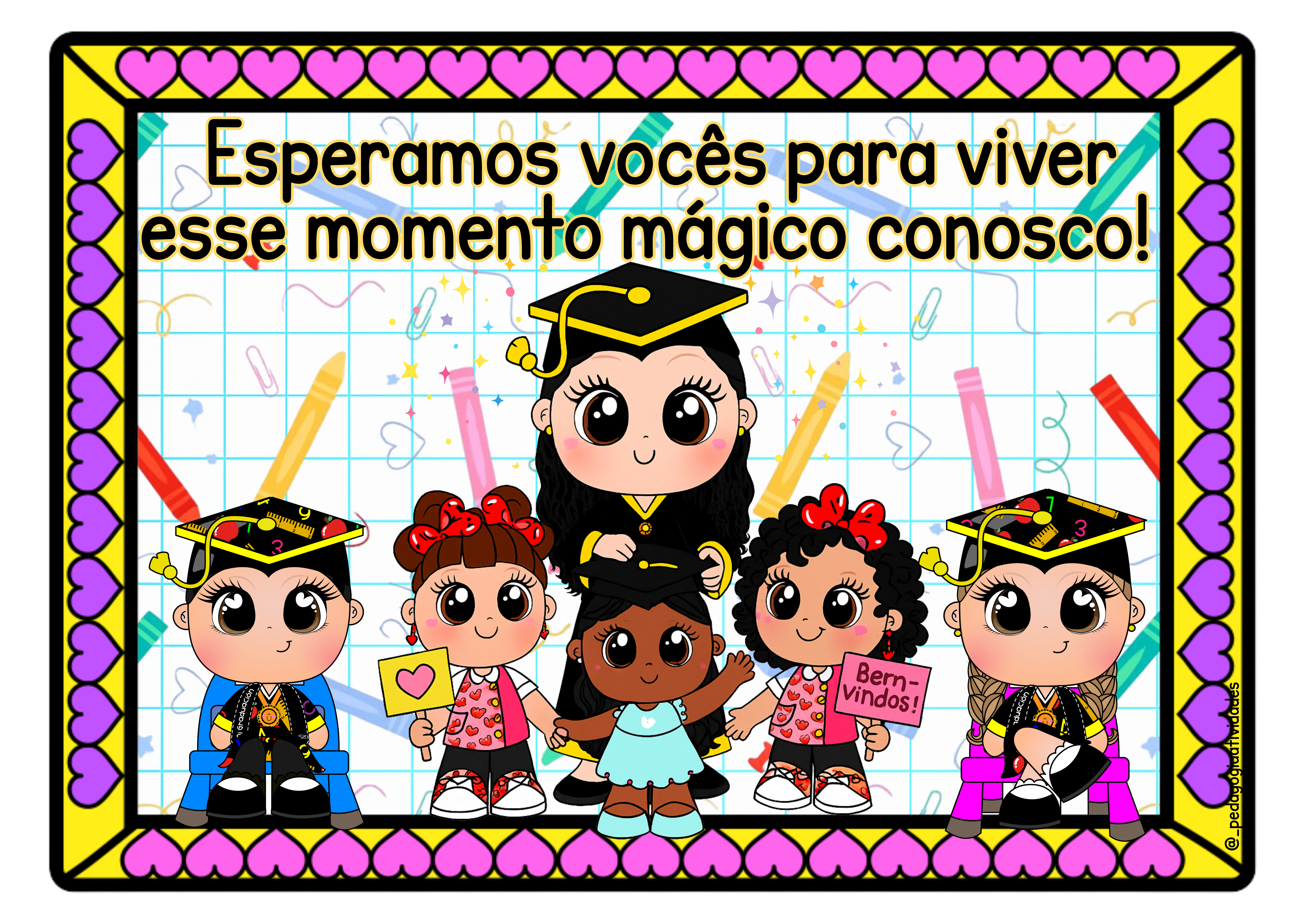 Prepare-se para celebrar com um material que transforma o momento em uma lembrança eterna — 22 placas de formatura no formato de convite para as famílias, com frases tocantes e desenhos que derretem corações. 💫