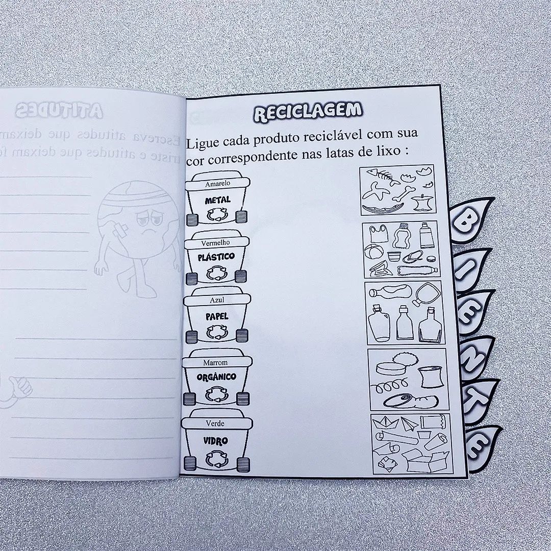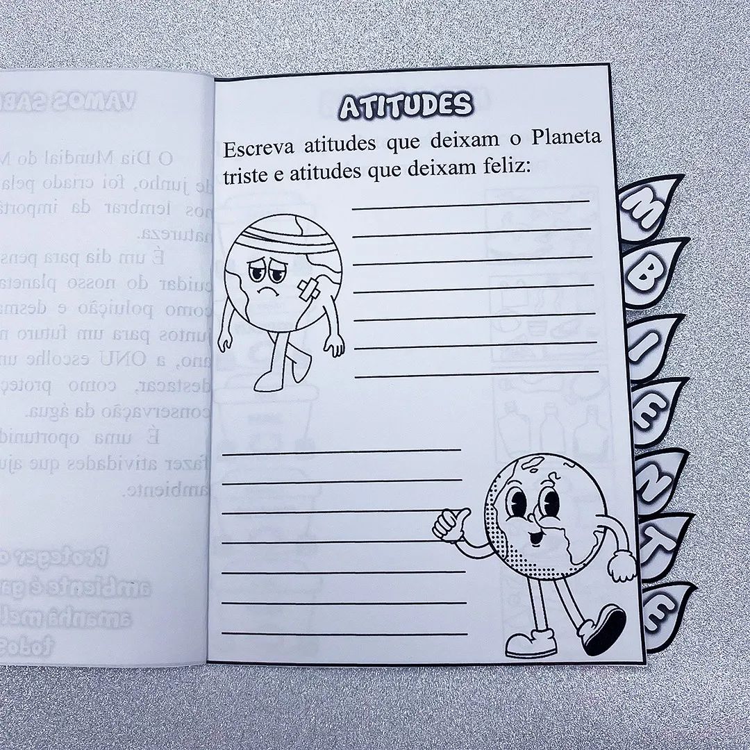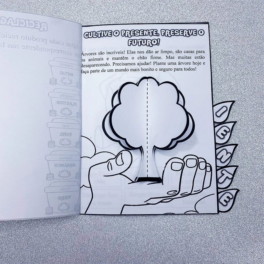 • 🌳 6 folhas com 9 atividades interativas sobre o meio ambiente, abordando temas como reciclagem, conservação da água e flora e fauna;