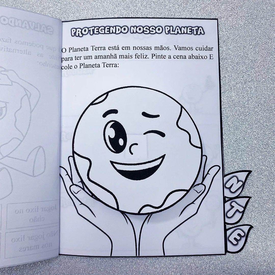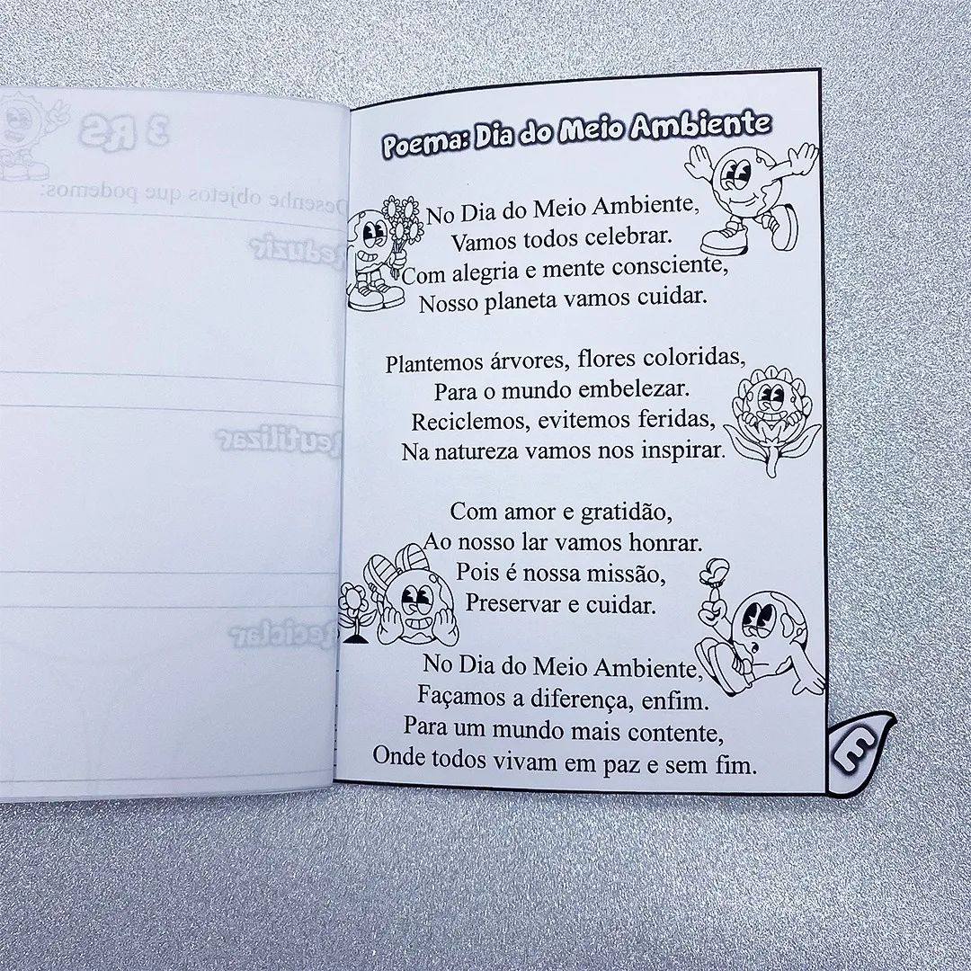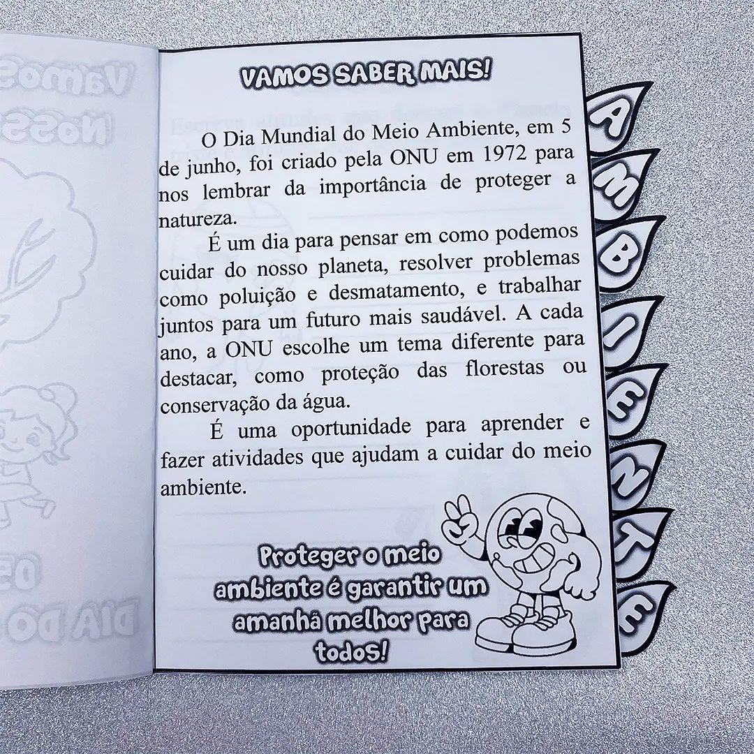 • 🌳 6 folhas com 9 atividades interativas sobre o meio ambiente, abordando temas como reciclagem, conservação da água e flora e fauna;