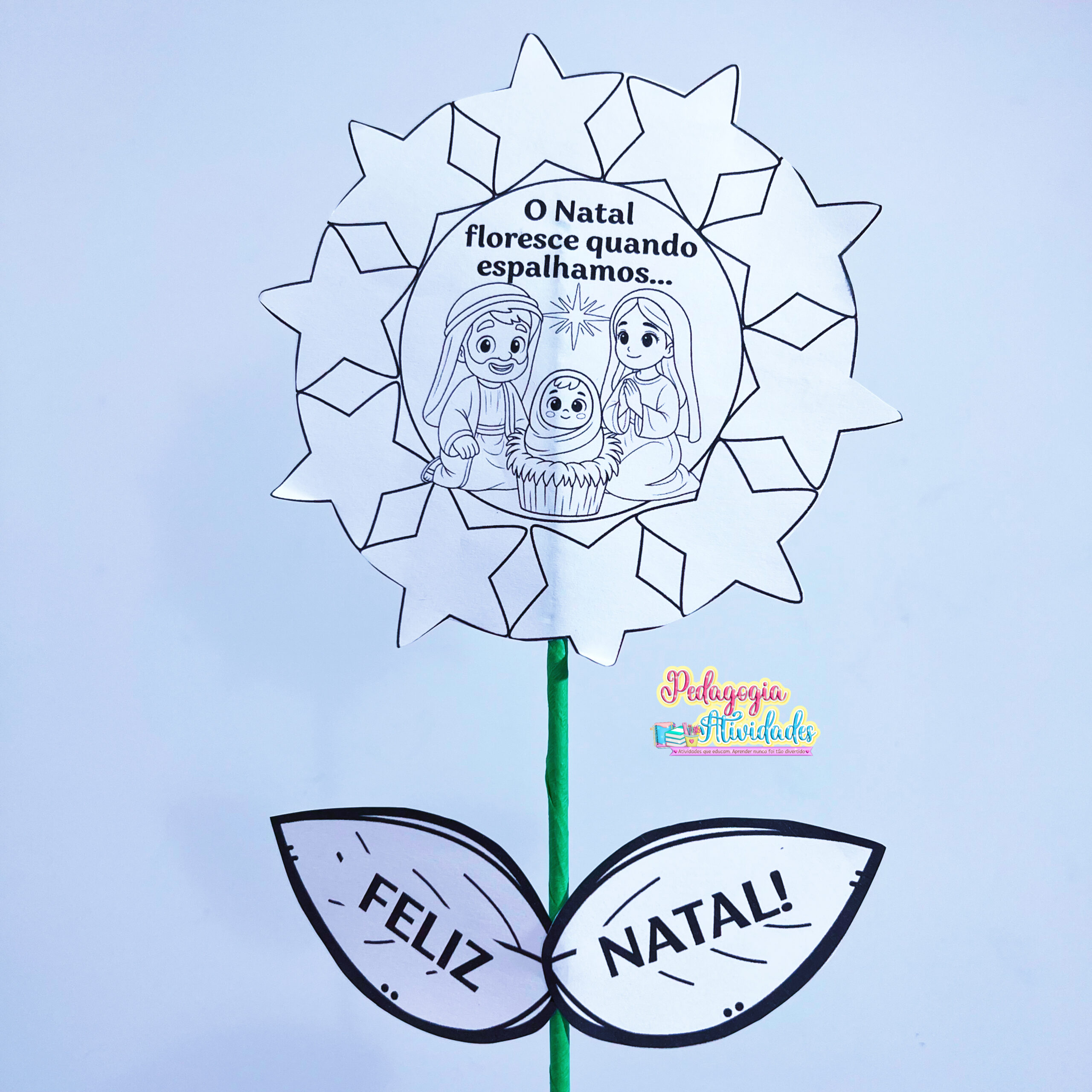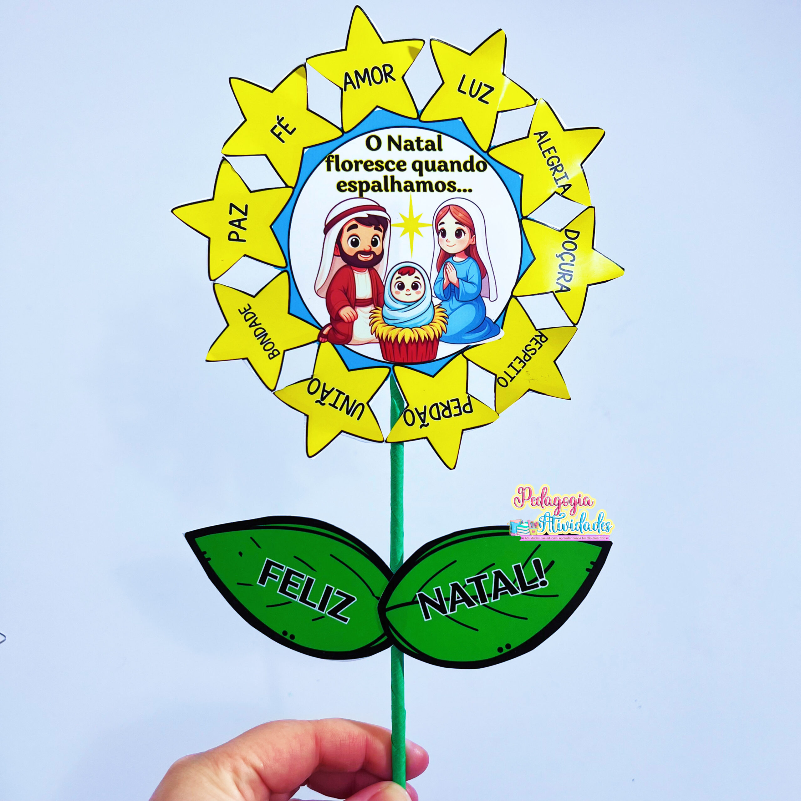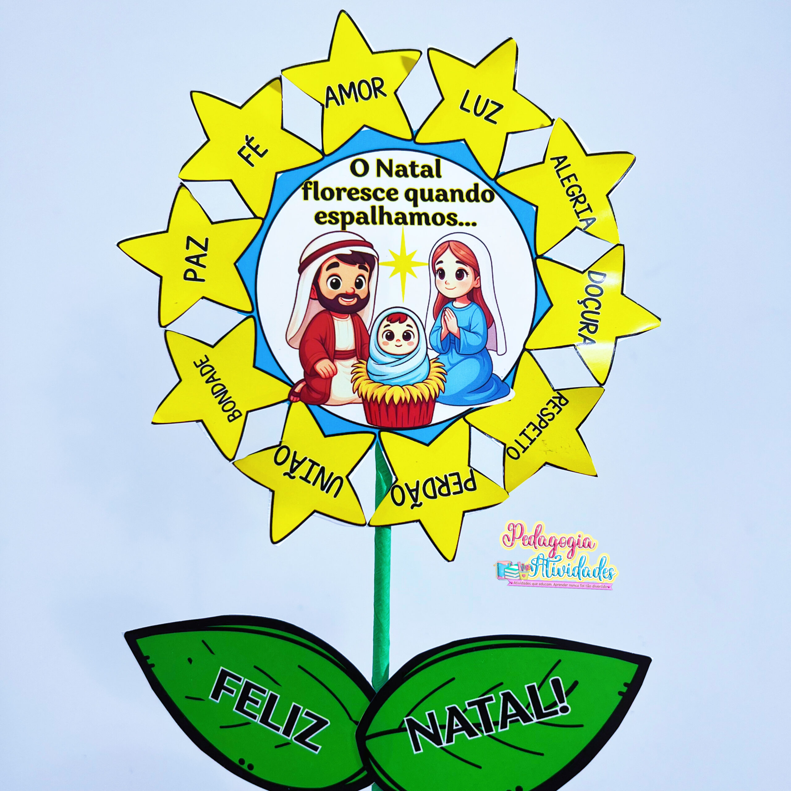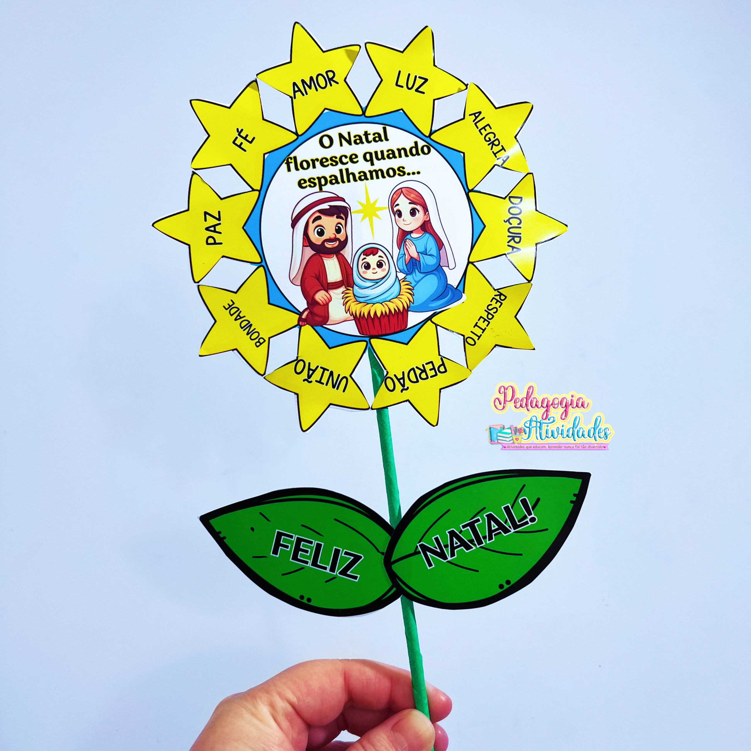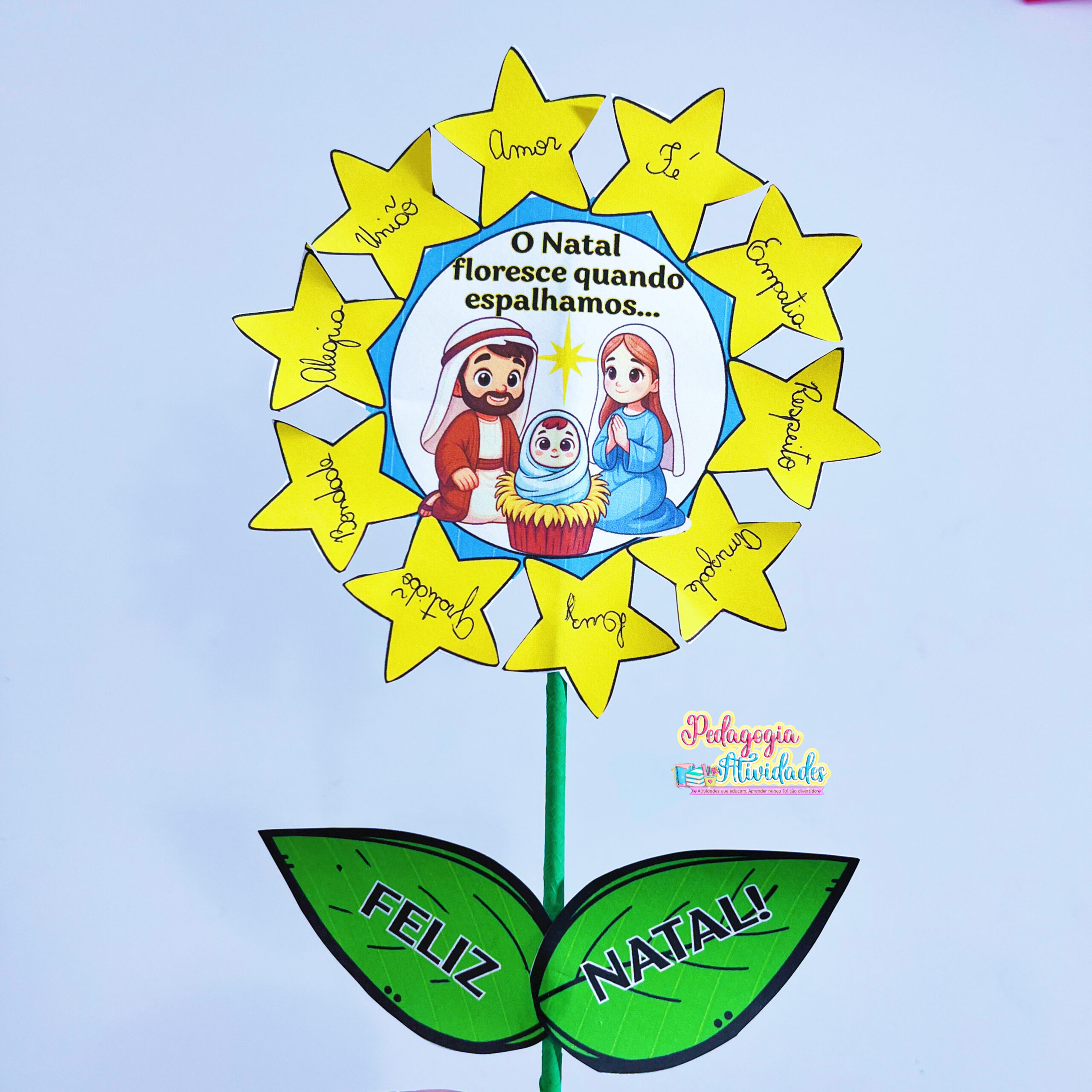 Cada pétala representa um valor natalino (amor, fé, empatia, gratidão…) e, ao montar, as crianças descobrem que o verdadeiro Natal está em espalhar sentimentos bons! 💖