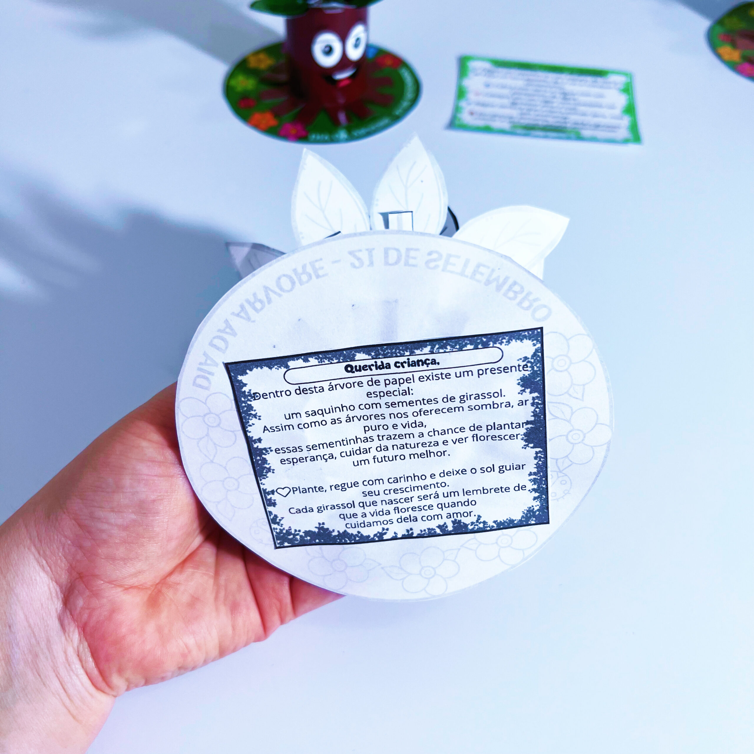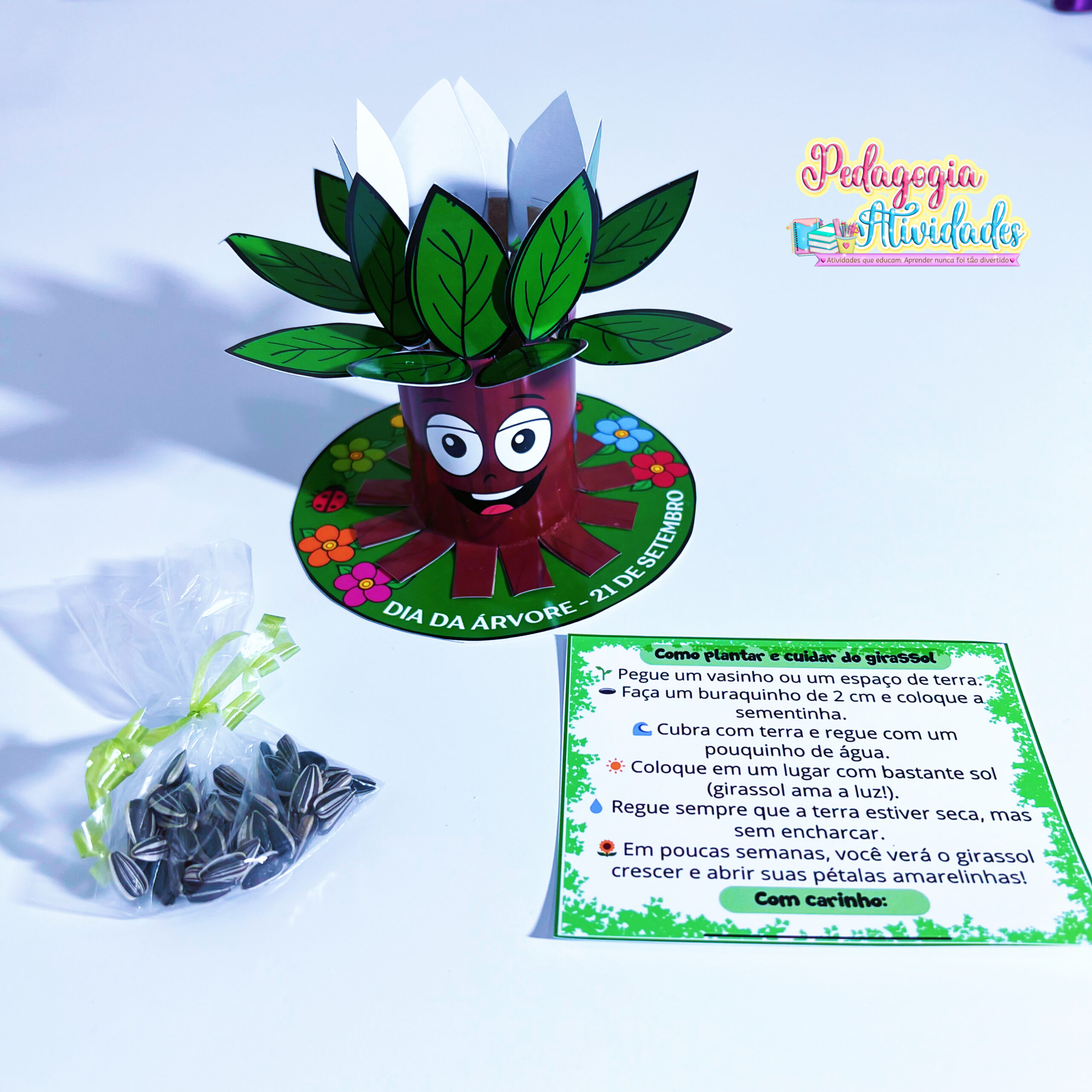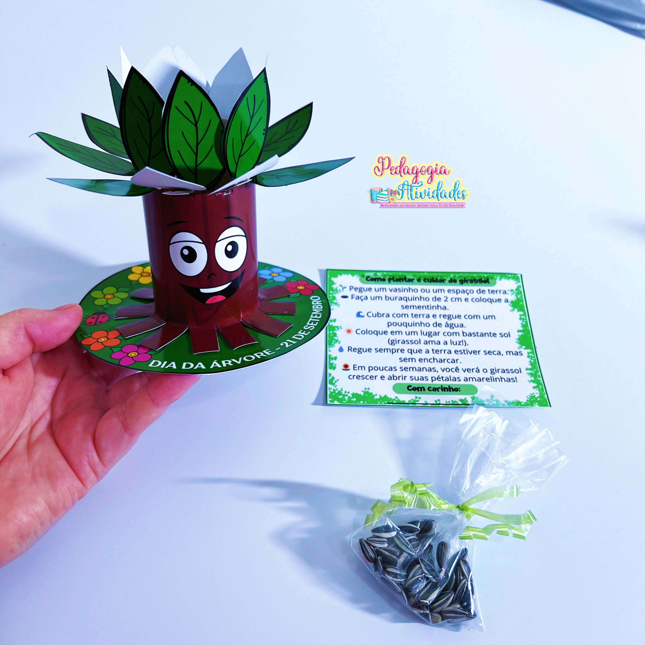 A lembrancinha é feita com rolinho de papel higiênico em formato de árvore e acompanha sementes de girassol 🌻 com instruções de plantio e cuidado.