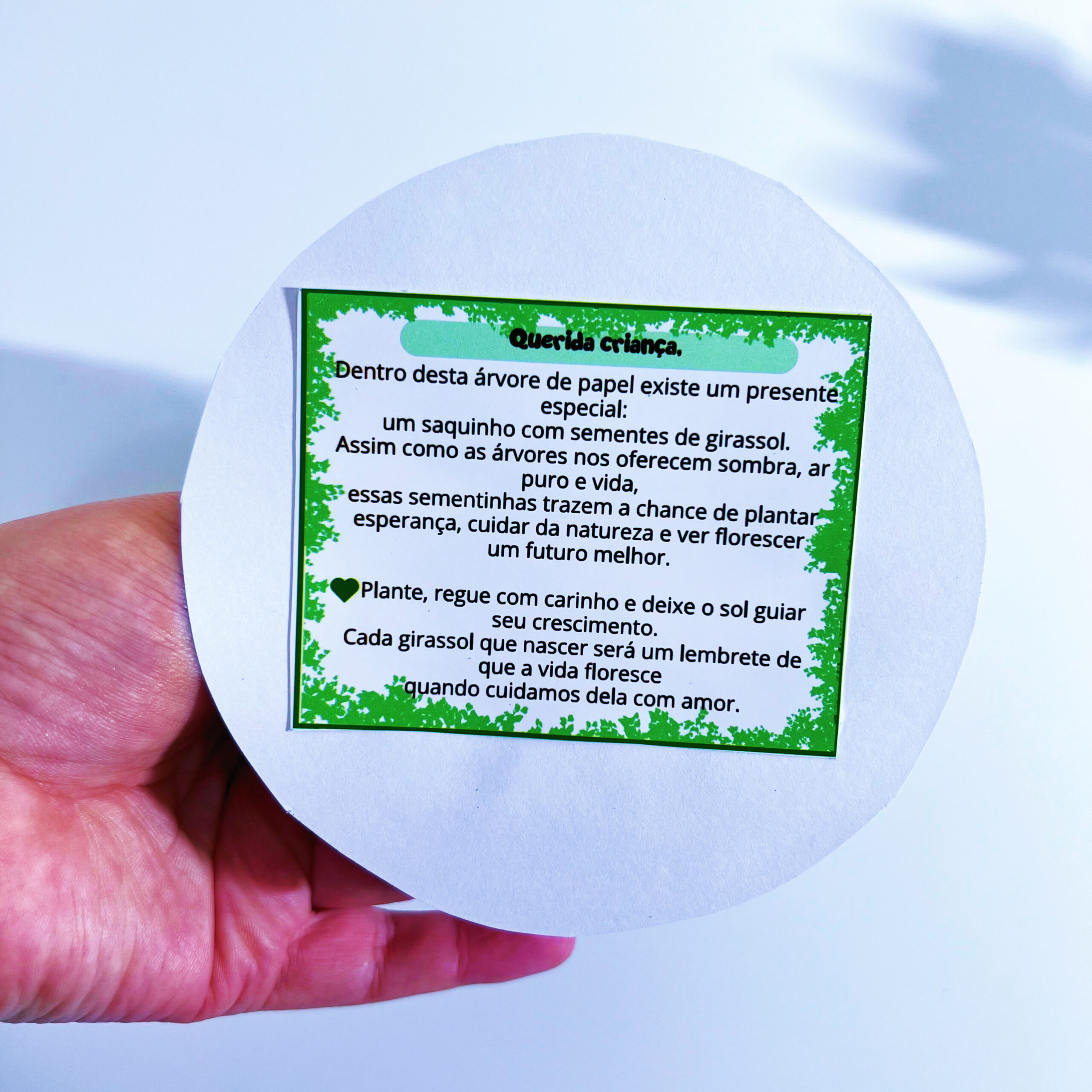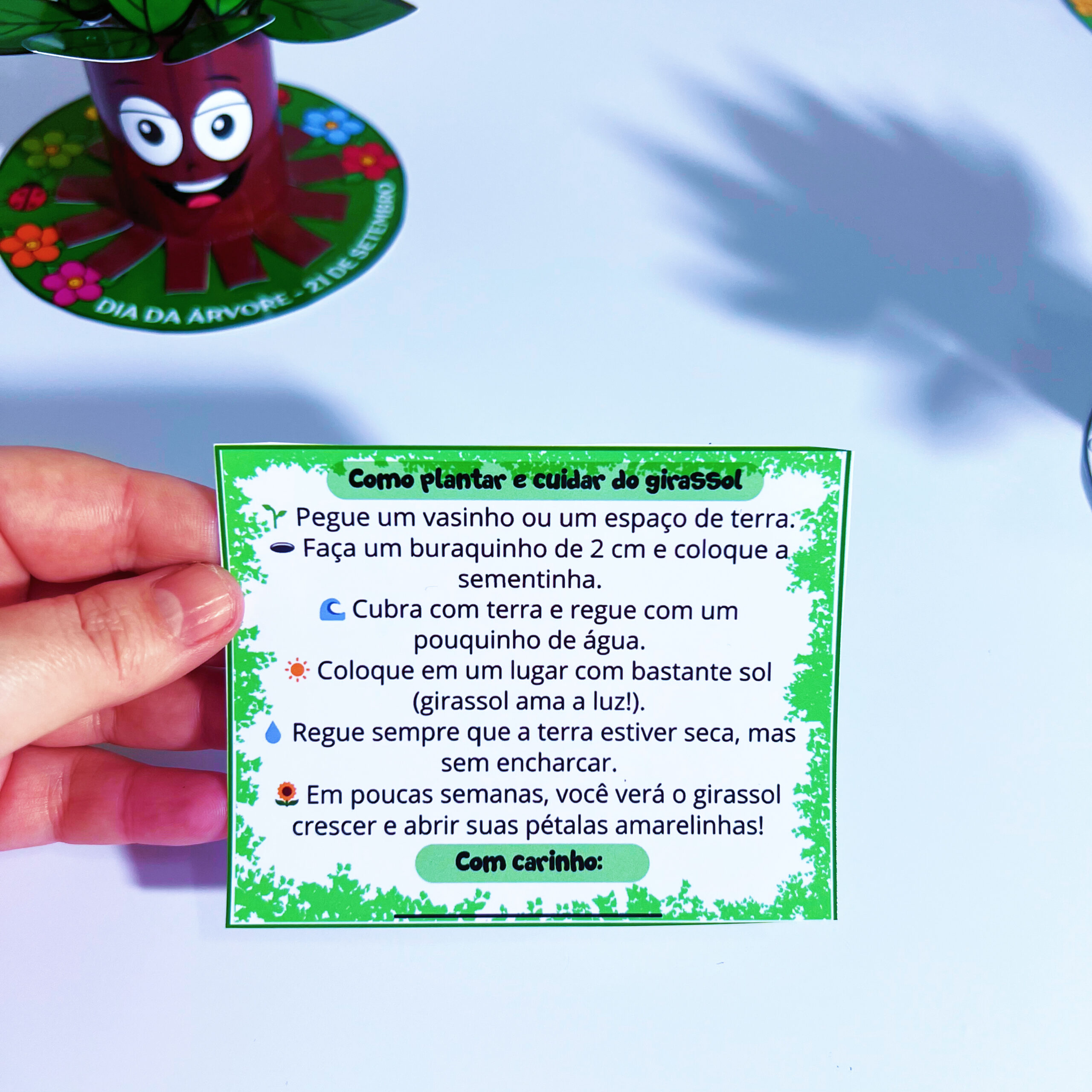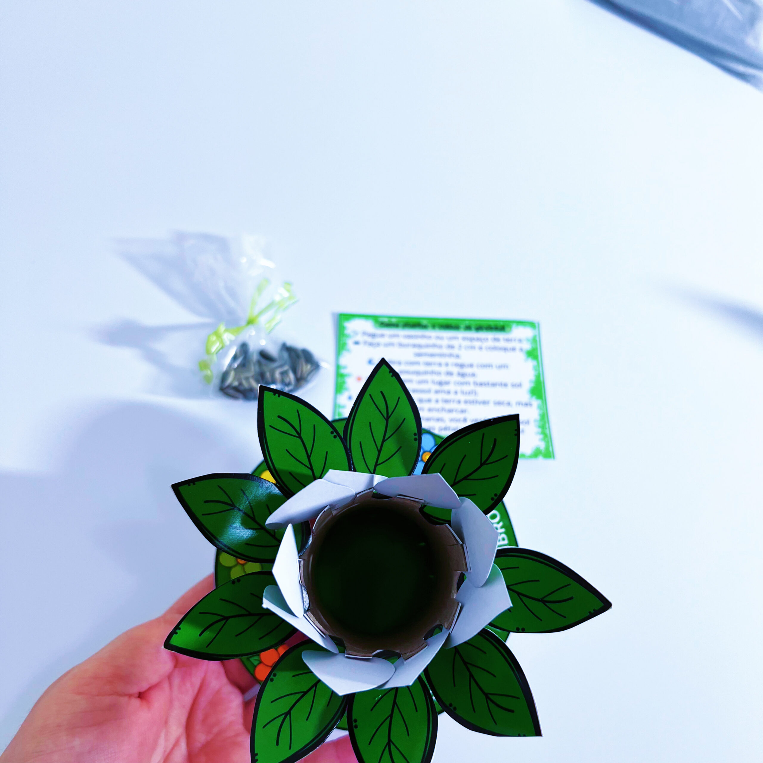 A lembrancinha é feita com rolinho de papel higiênico em formato de árvore e acompanha sementes de girassol 🌻 com instruções de plantio e cuidado.