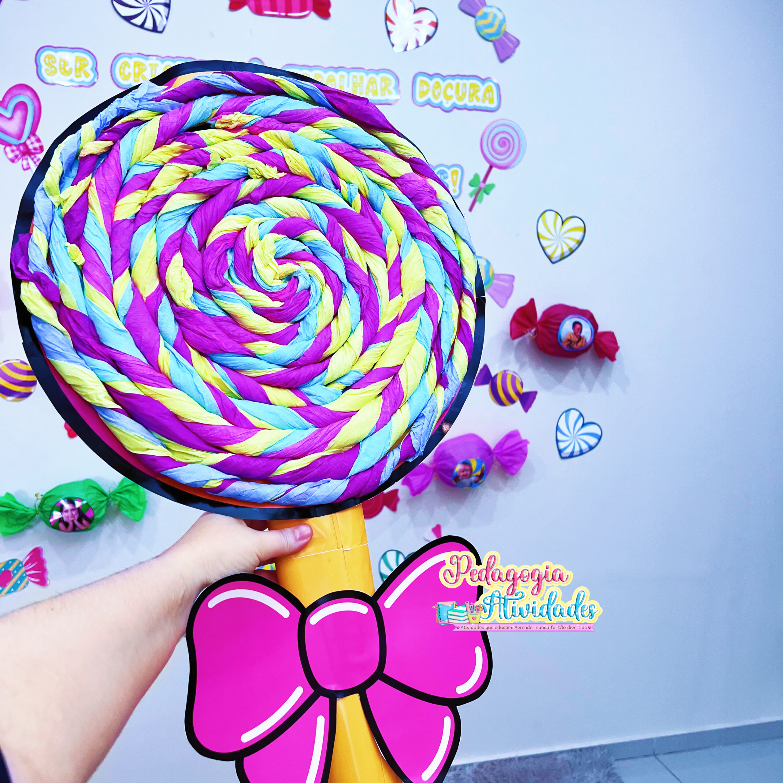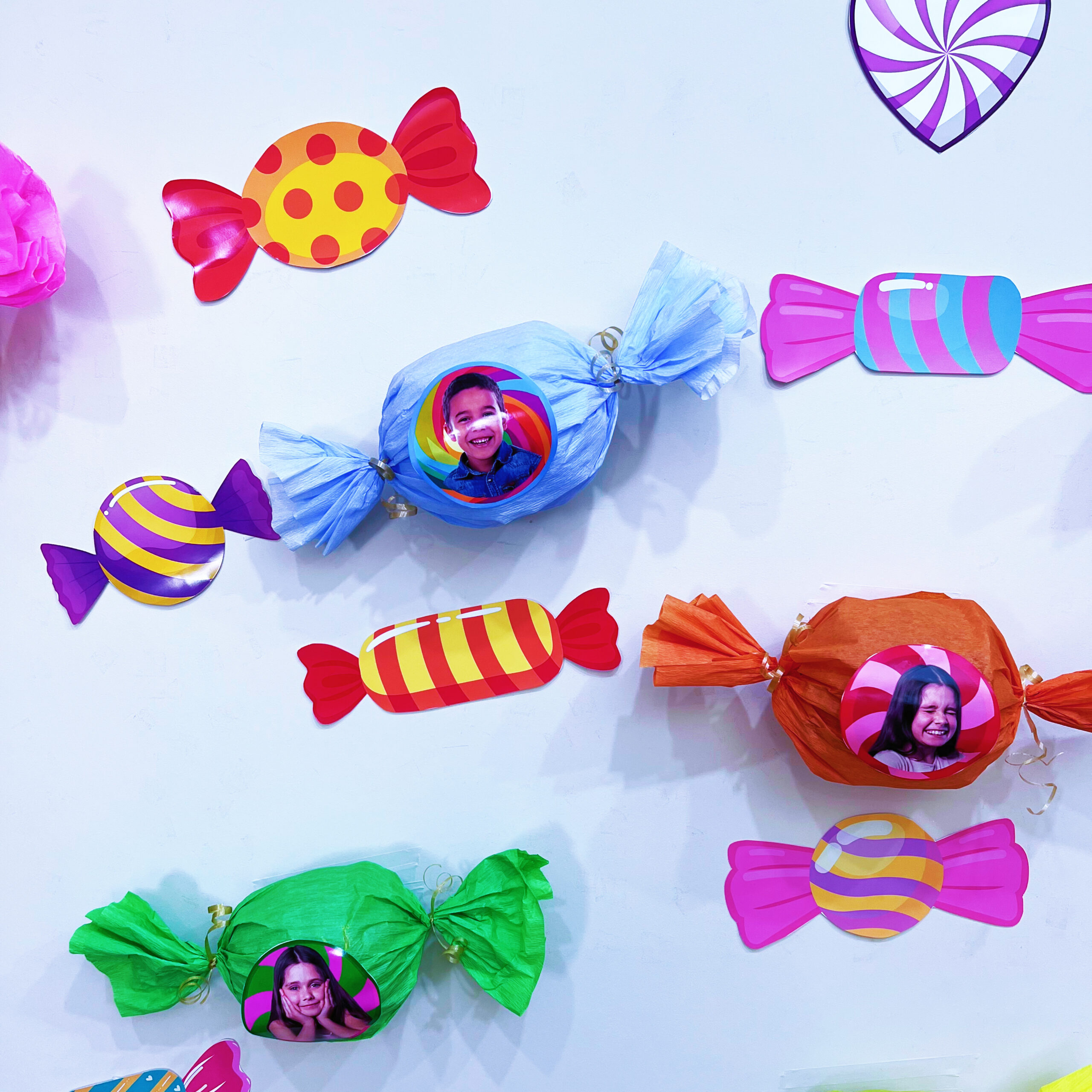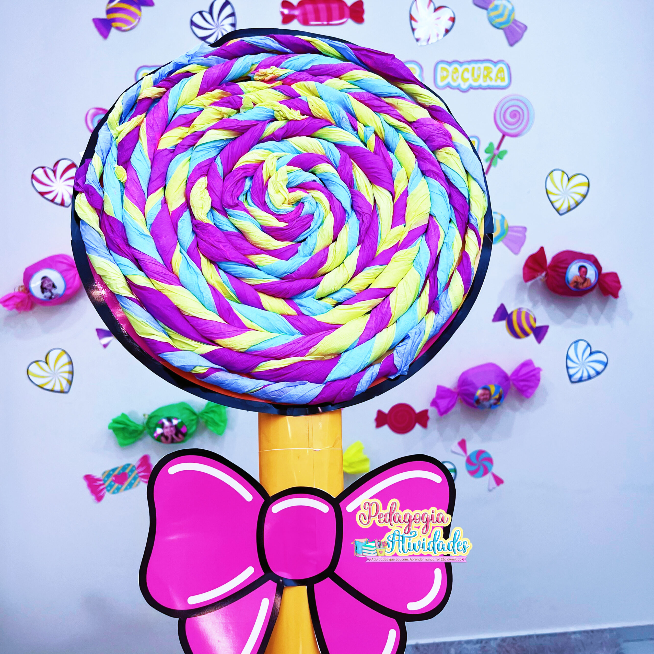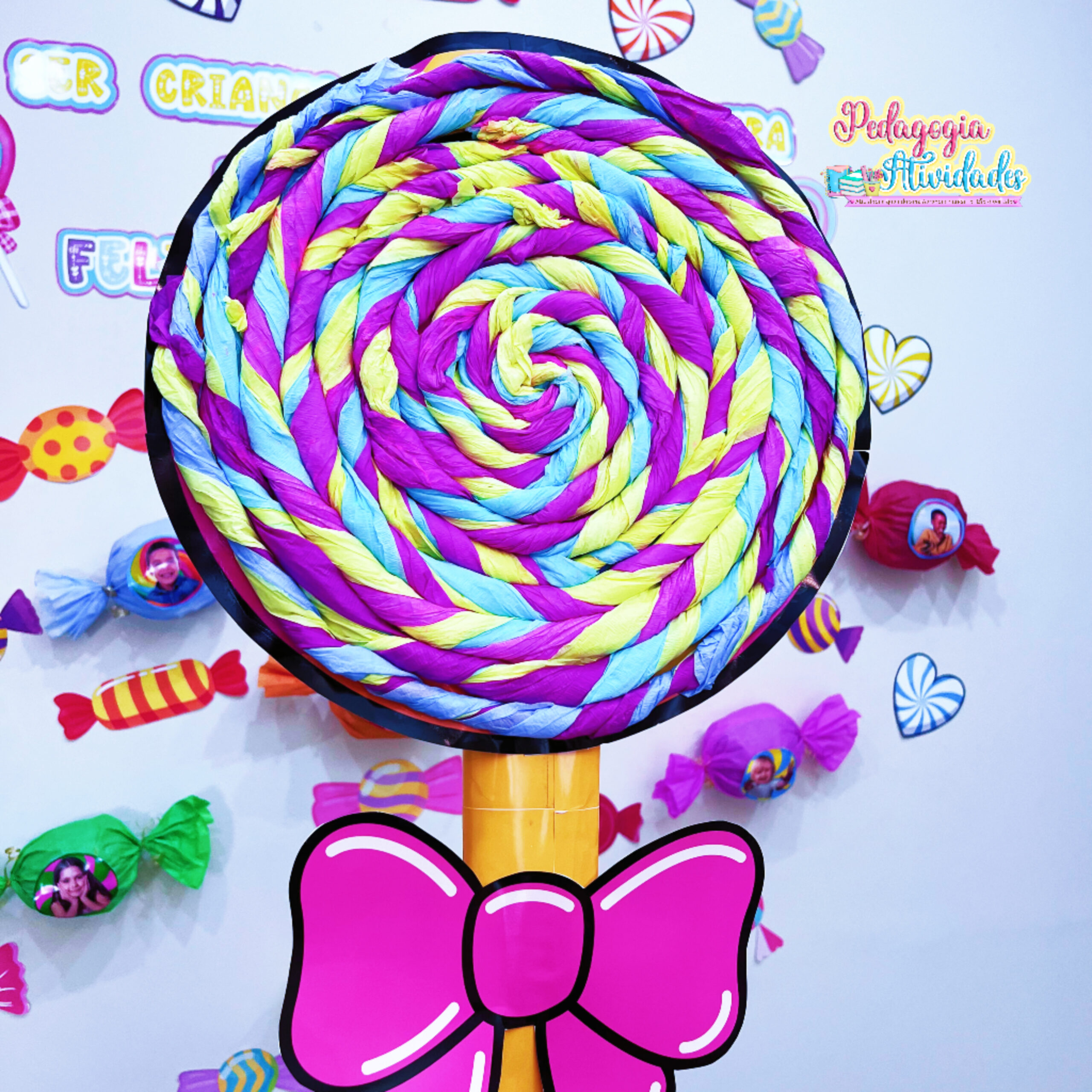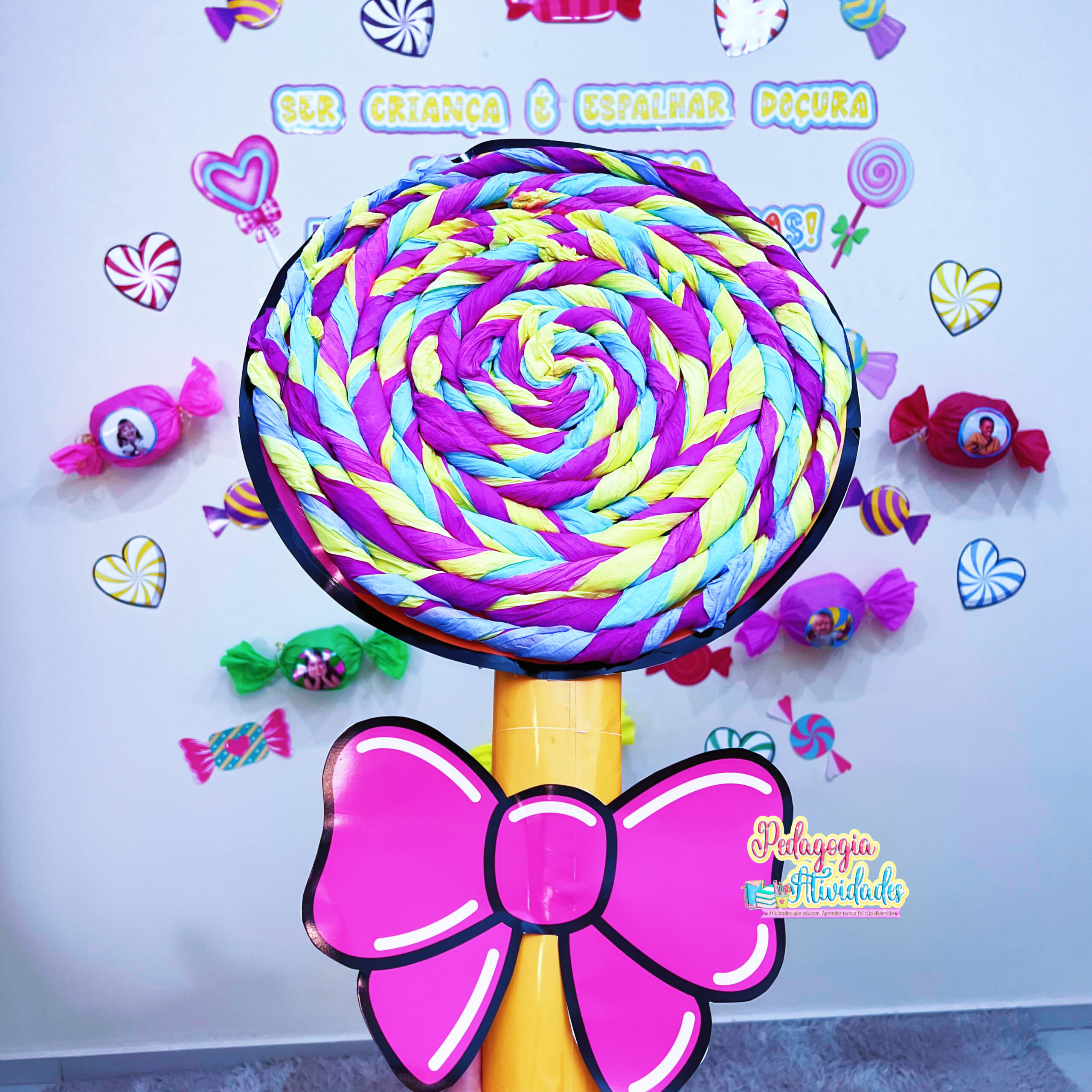 O painel traz elementos em 3D, balinhas feitas de bexiga com papel crepom 🎈 e um big pirulito gigante para a criançada tirar fotos incríveis 📸.