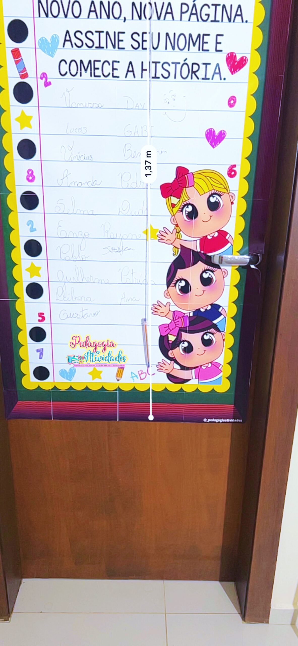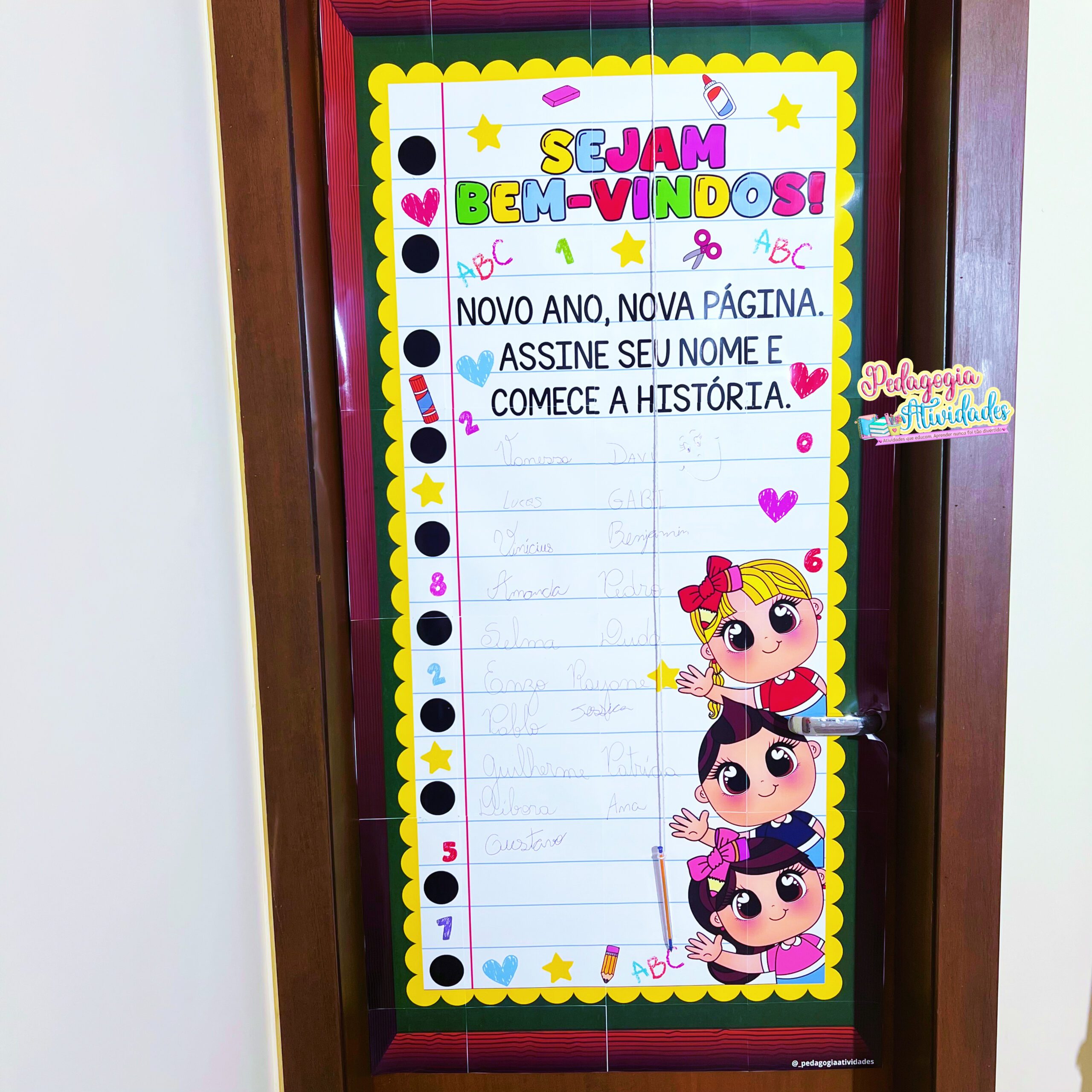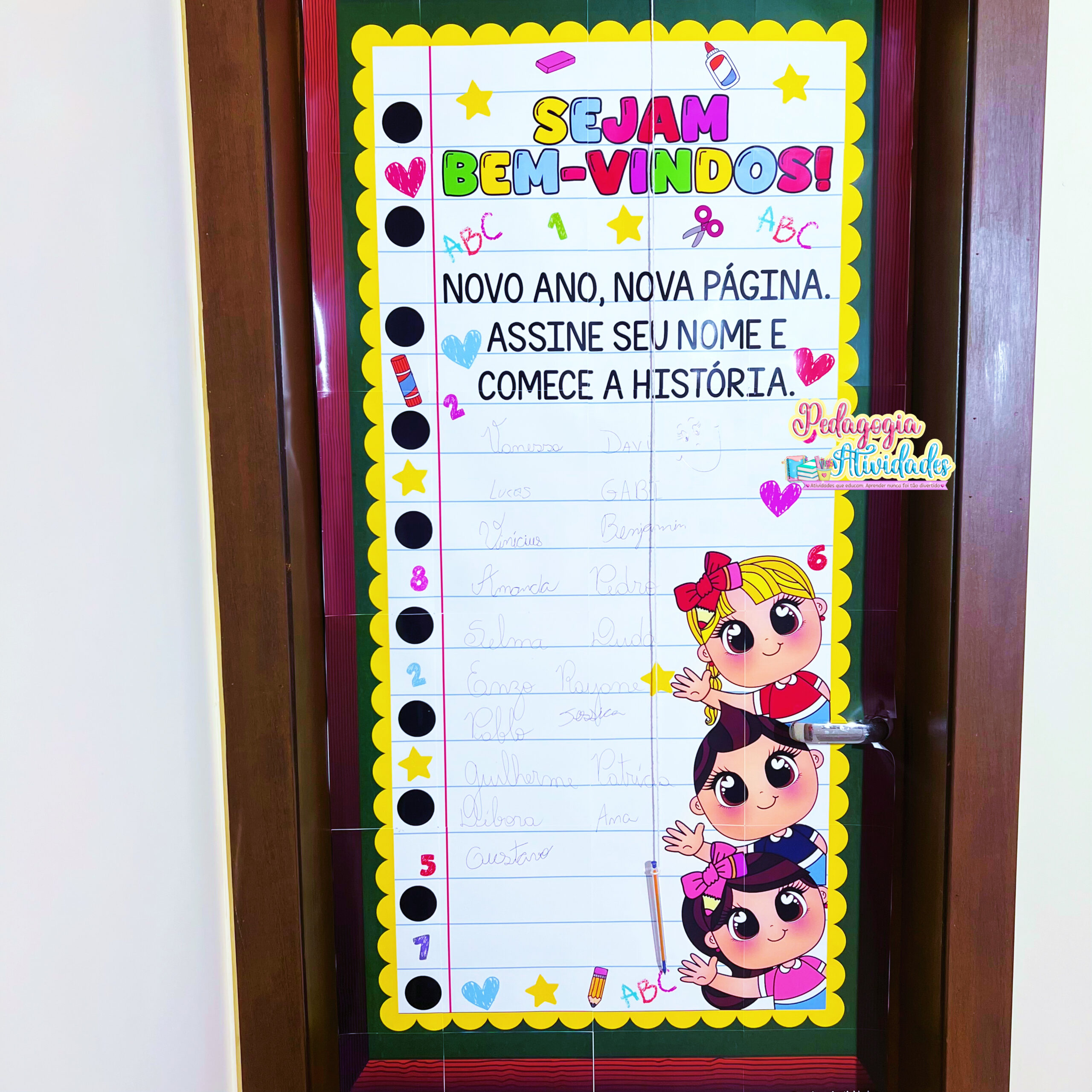 O Painel de Porta – Volta às Aulas transforma a recepção em um verdadeiro ritual de começo: a criança assina o próprio nome e dá o primeiro passo de uma nova história escolar 💛✍️