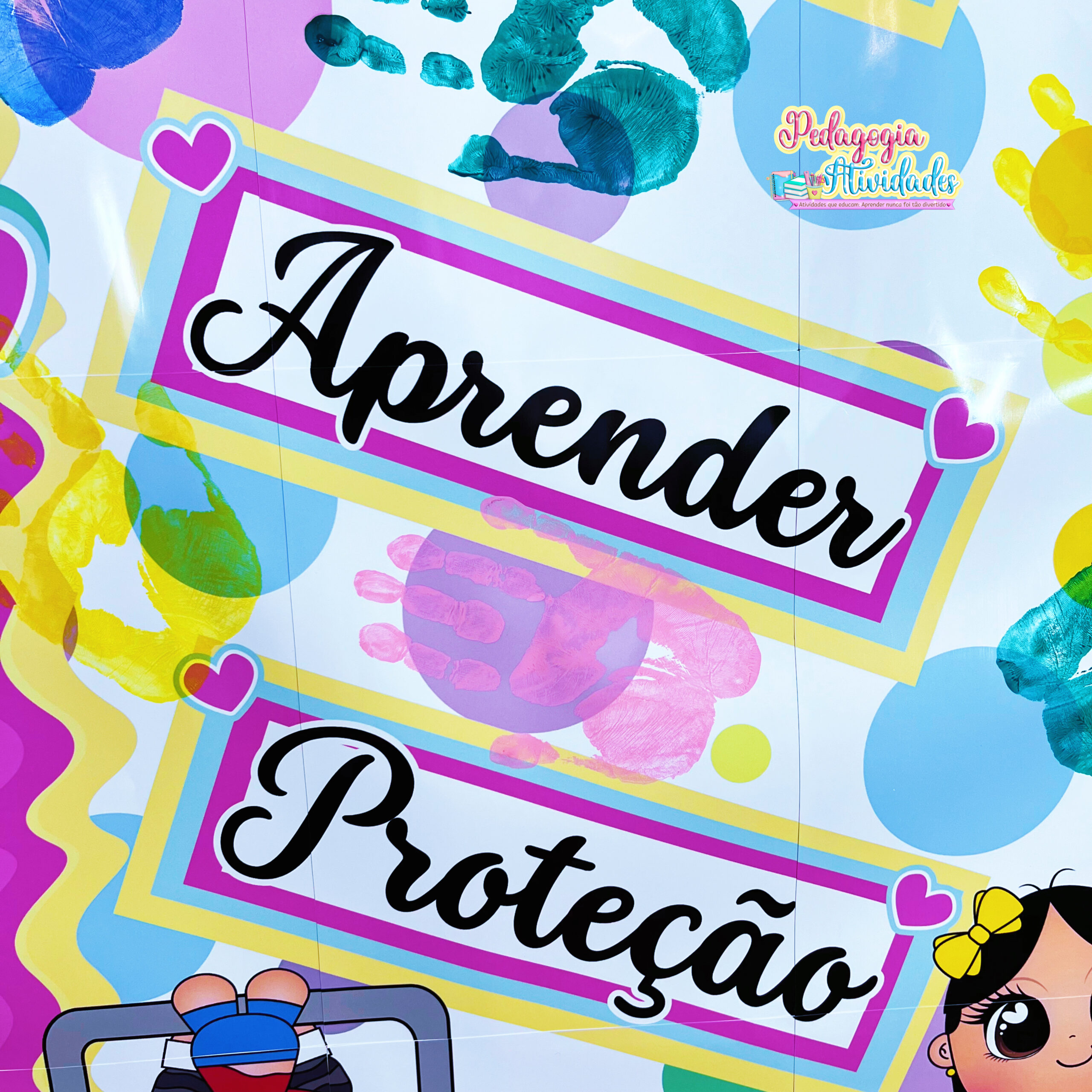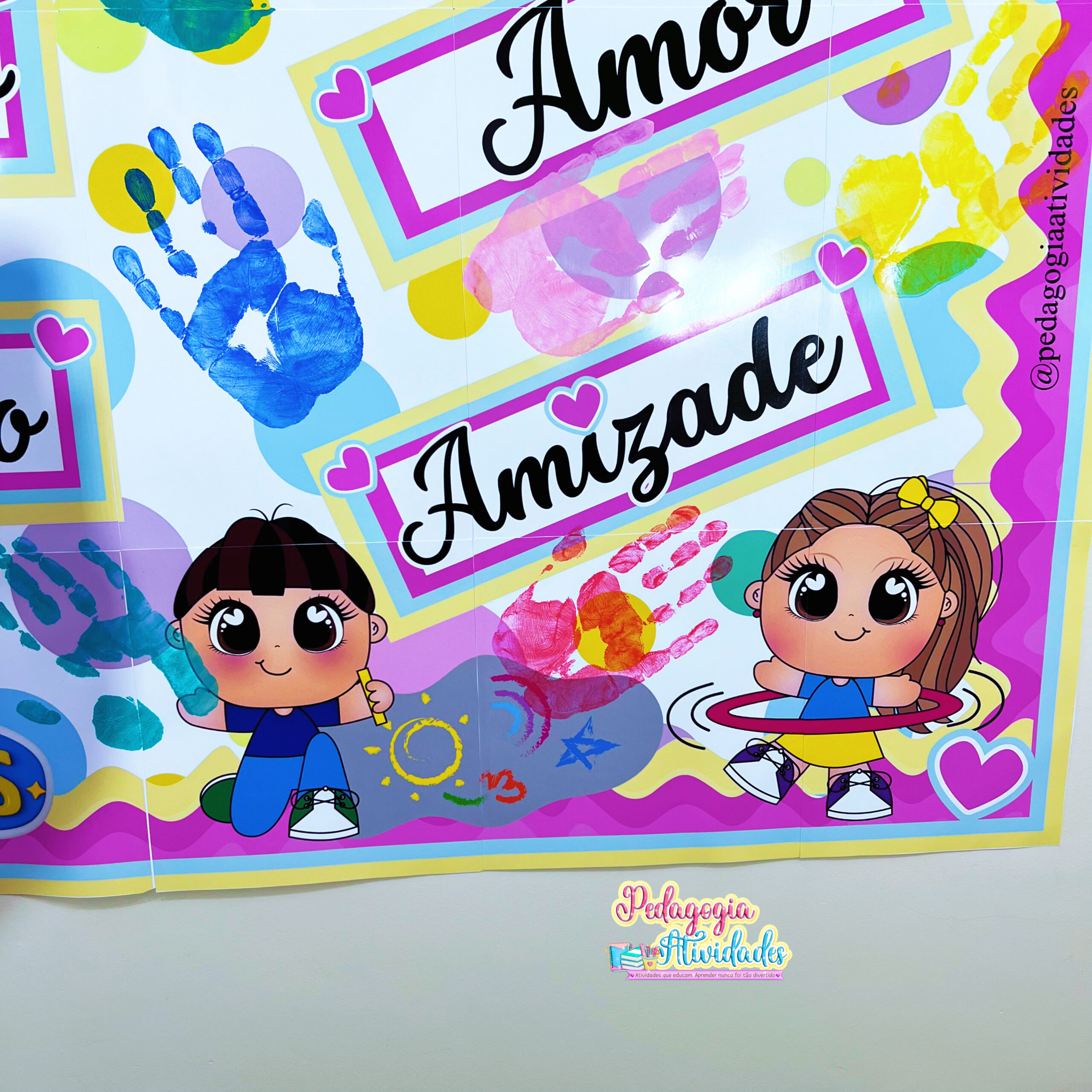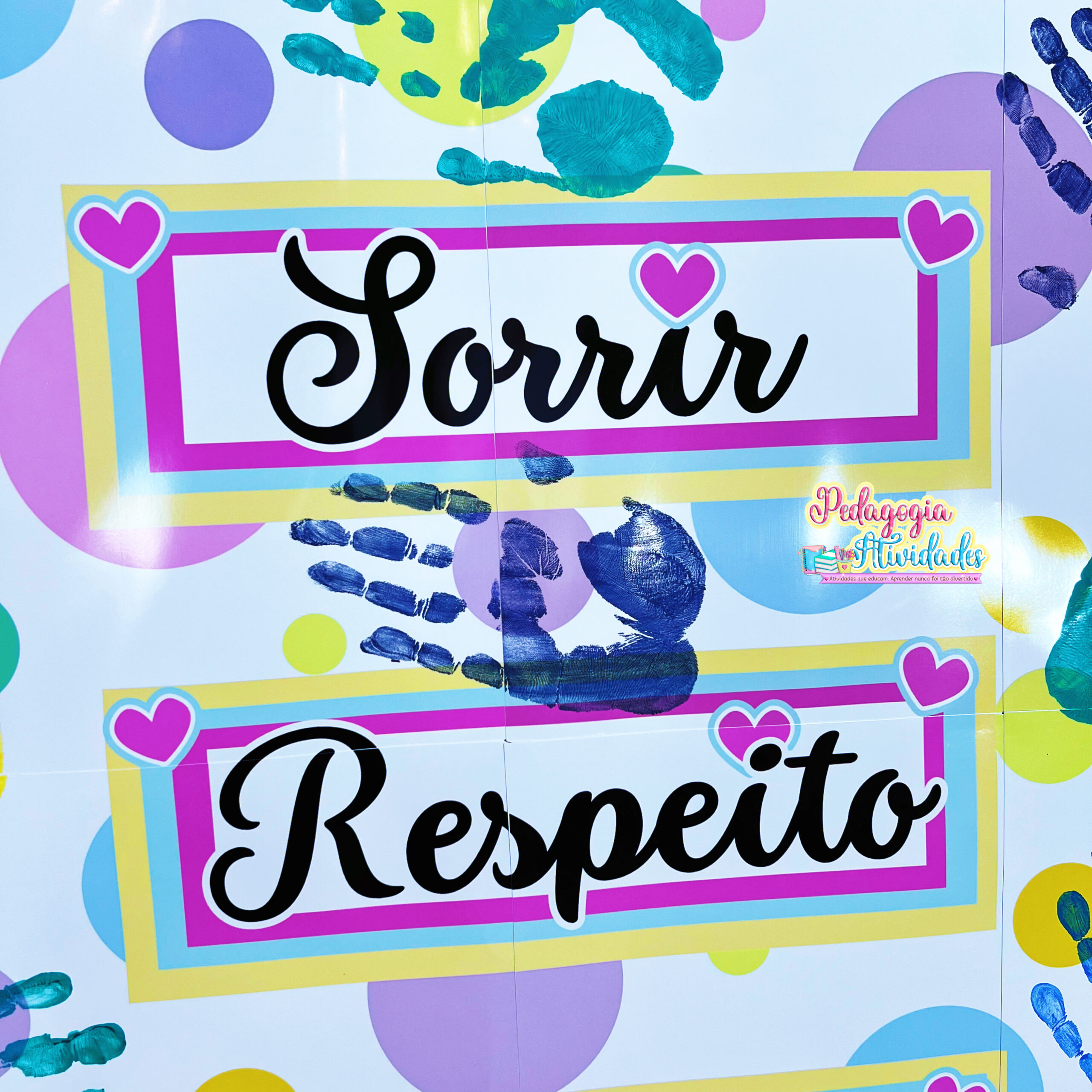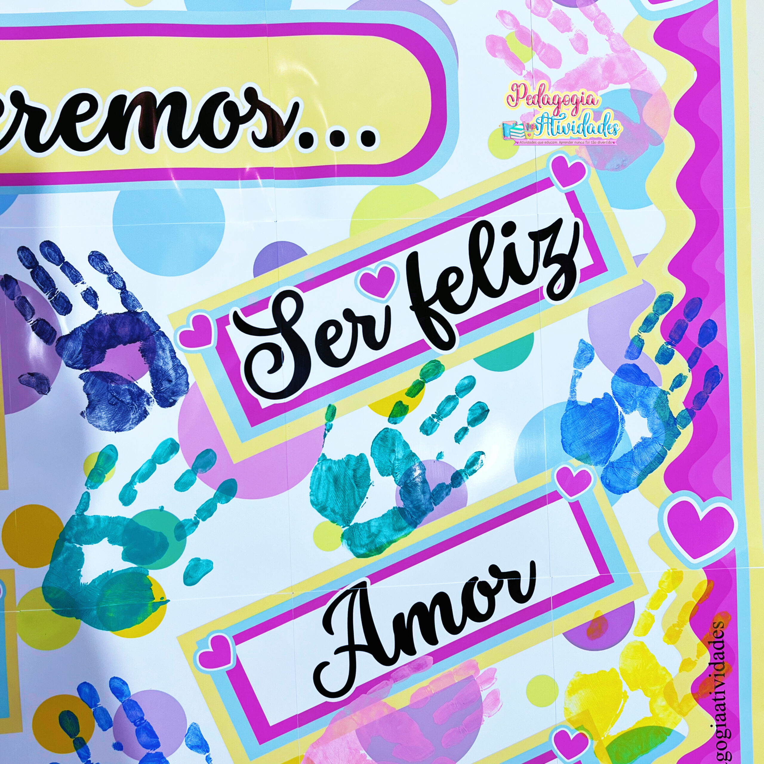 🖐️ Basta imprimir em tamanho ampliado, fixar no espaço desejado e deixar que as crianças carimbem suas mãos com tinta guache ao redor das palavras — criando um painel cheio de cor, significado e participação.