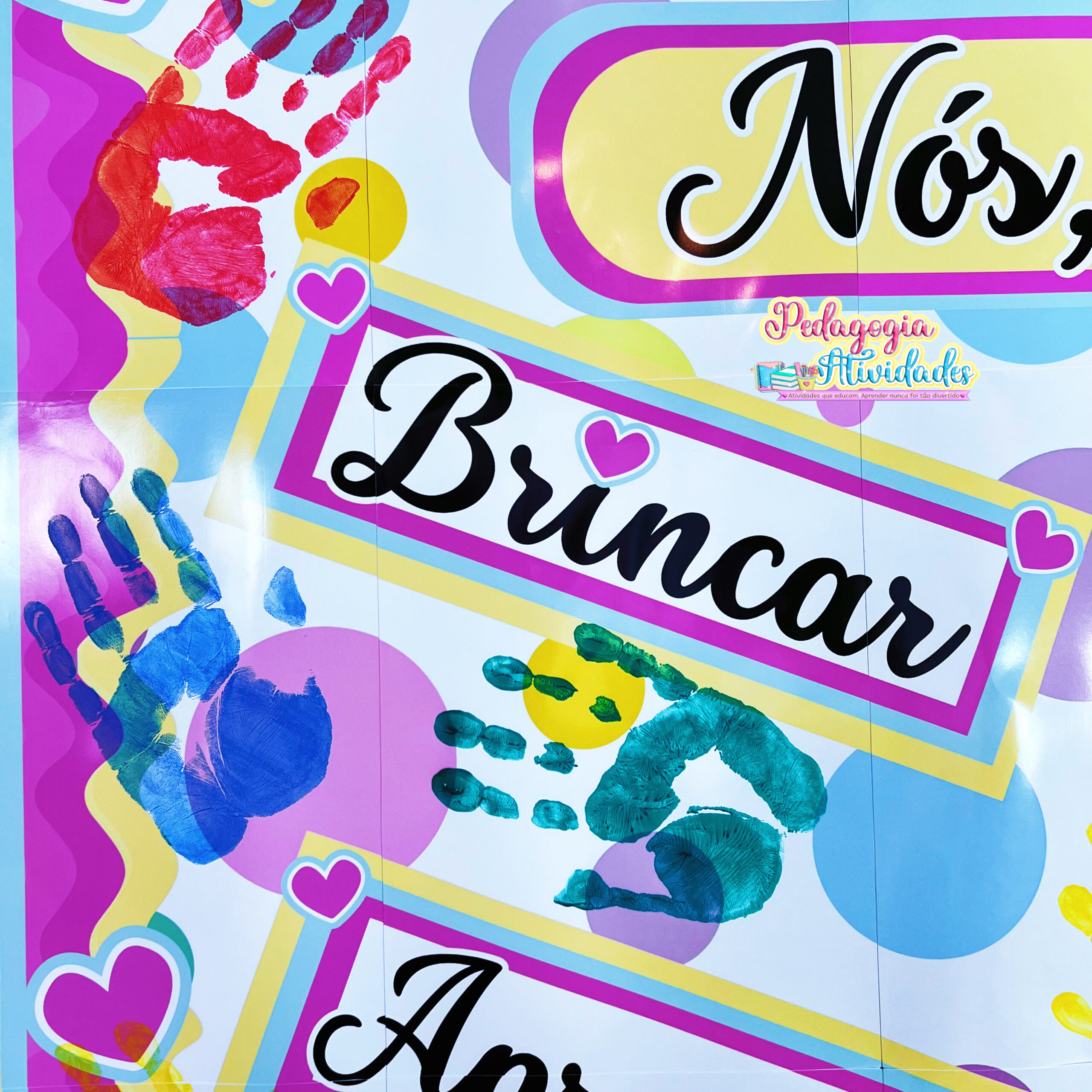 🎉 Esse Banner Interativo traz a frase “Nós, crianças, queremos…” junto com palavras como amor, proteção, brincar e aprender, e as crianças vão carimbar suas mãos com tinta guache ao redor, tornando o momento participativo e inesquecível!