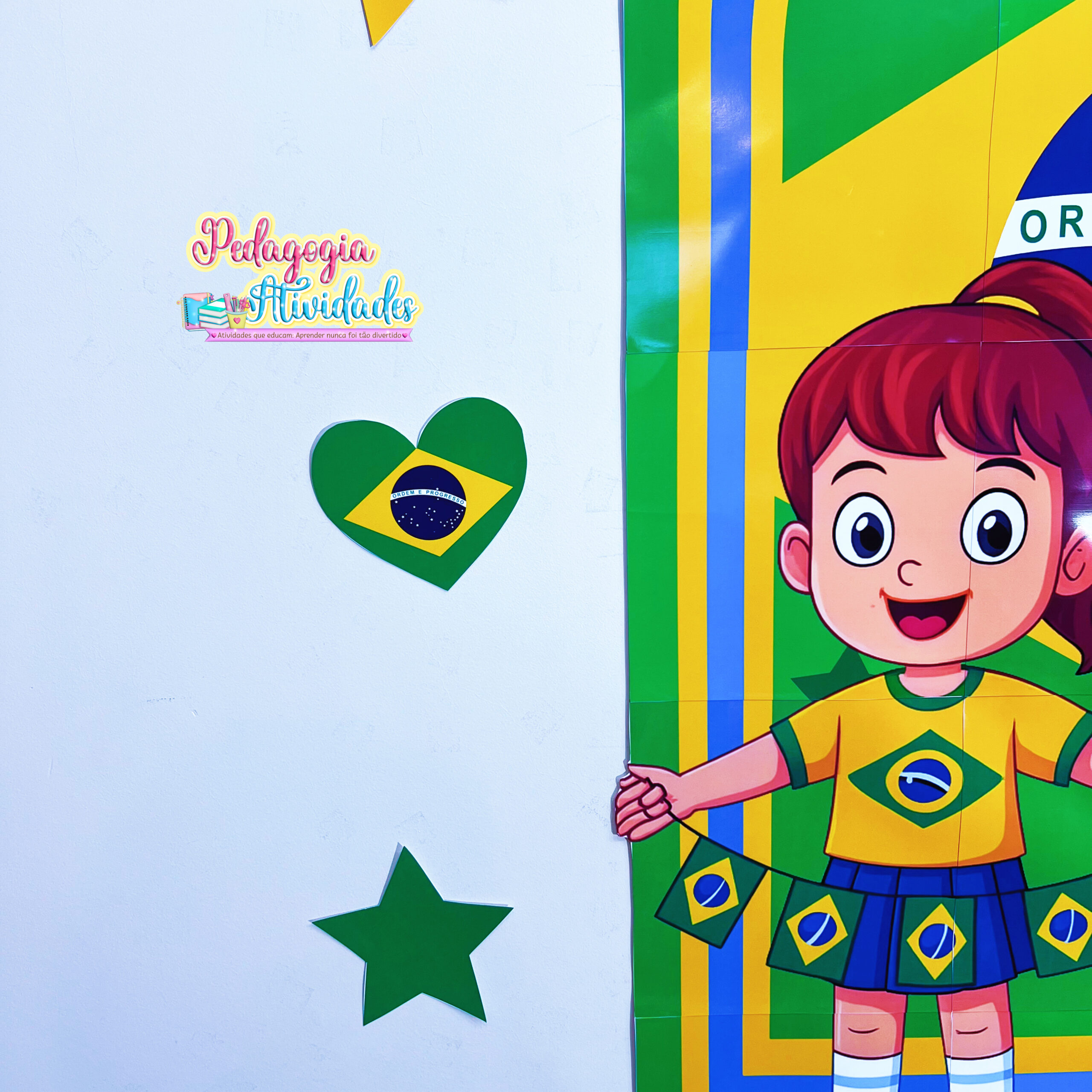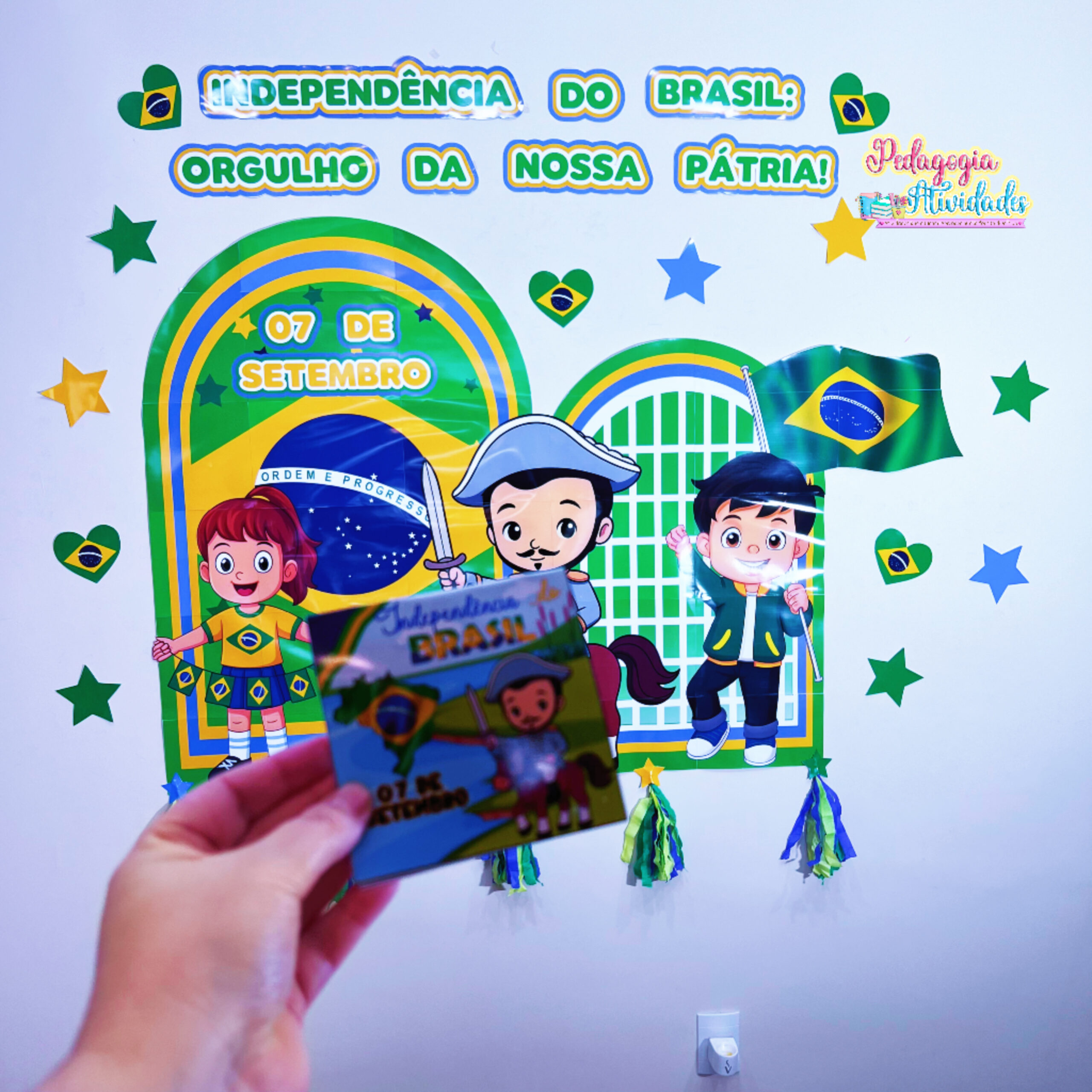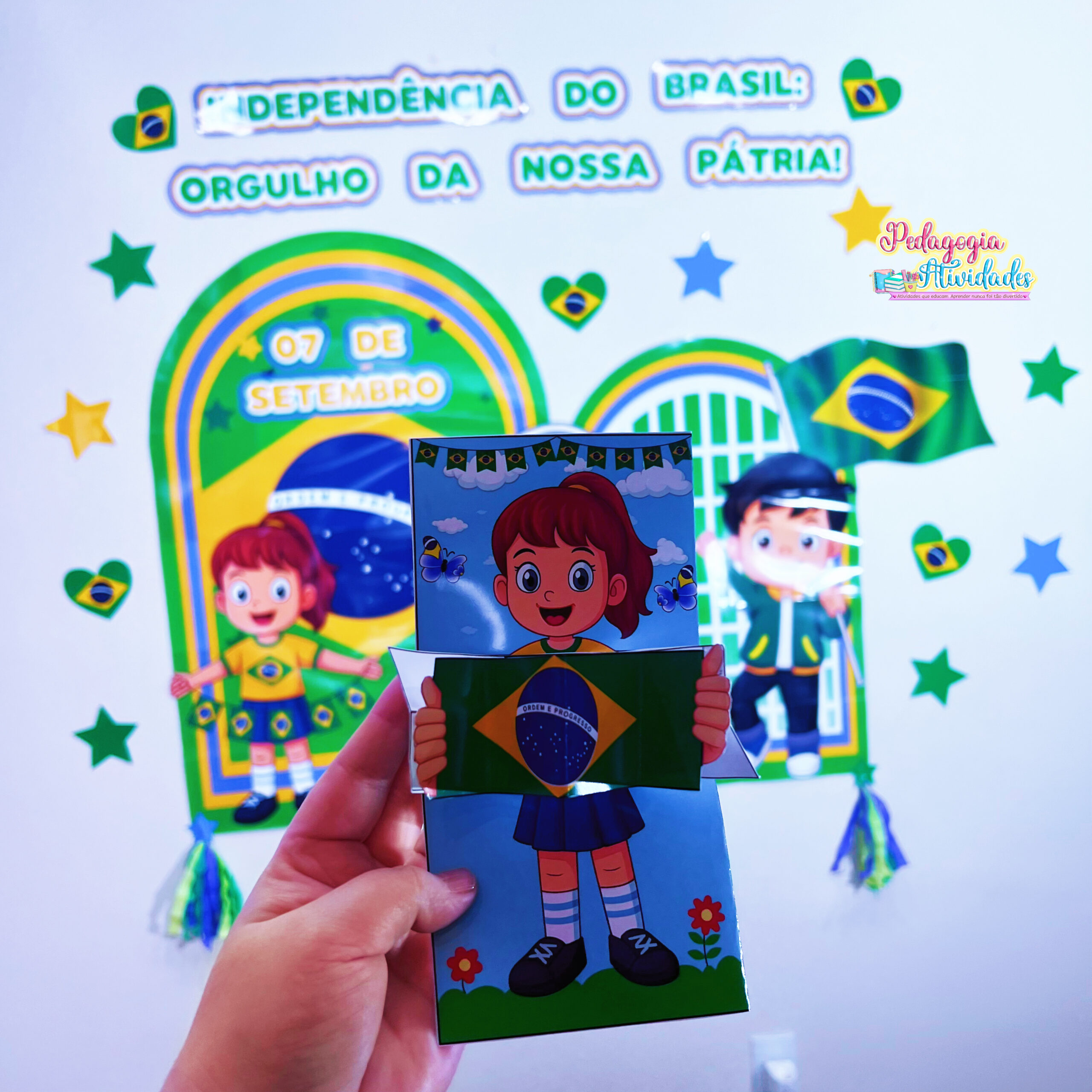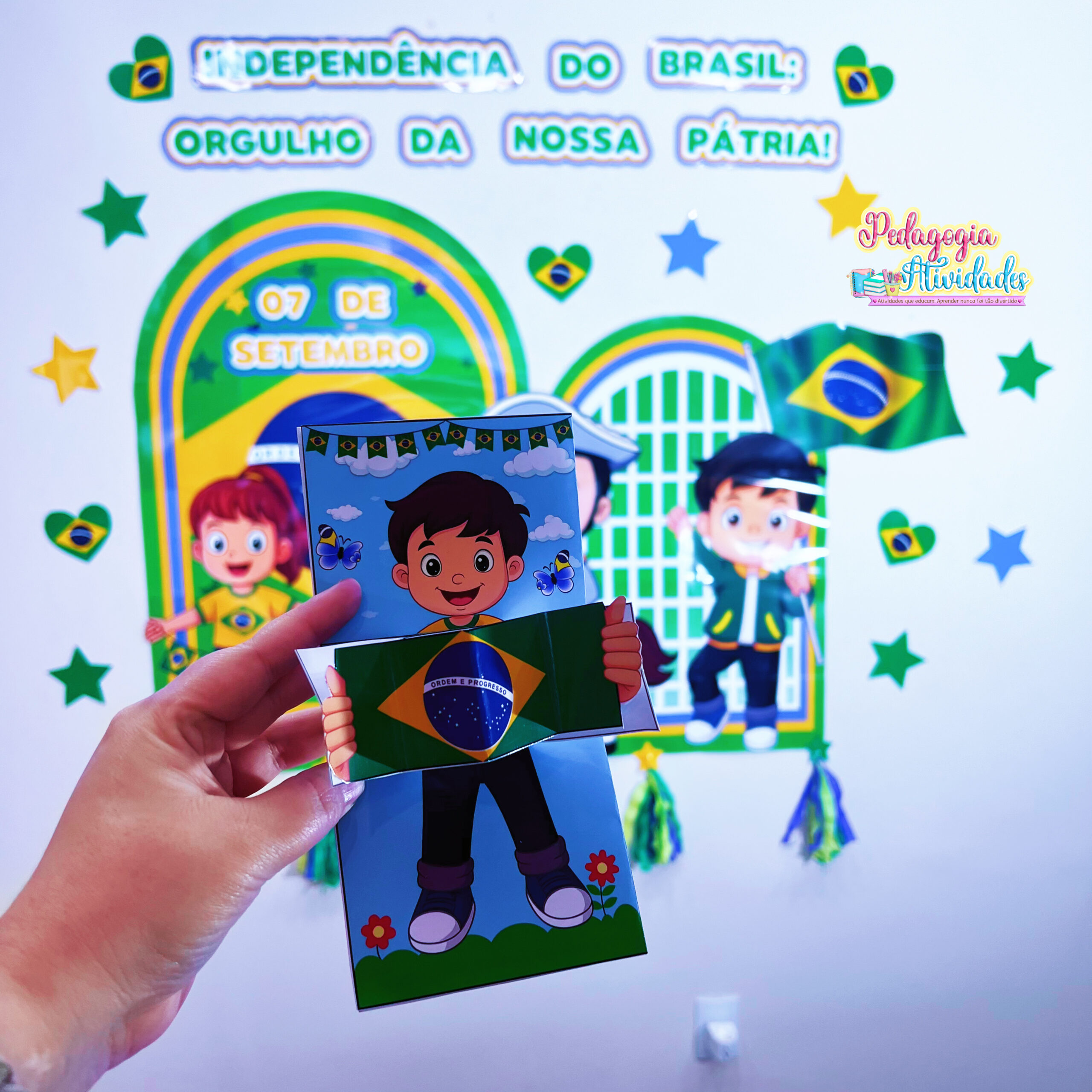 O painel traz toda a atmosfera da data e, para complementar, o cartão em formato 3D revela uma criança segurando a bandeira do Brasil, tornando a atividade interativa e inesquecível.