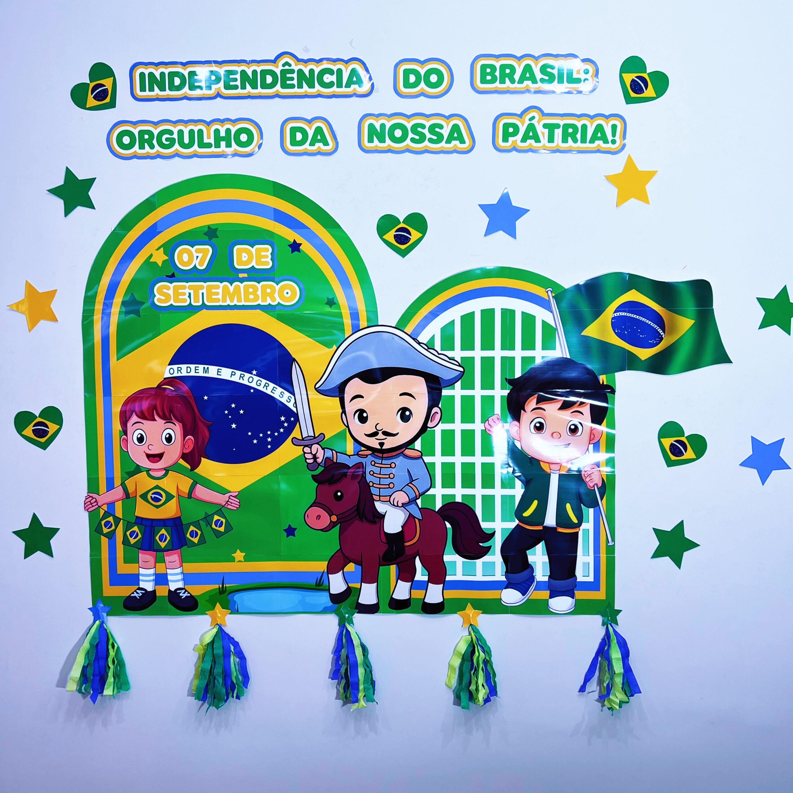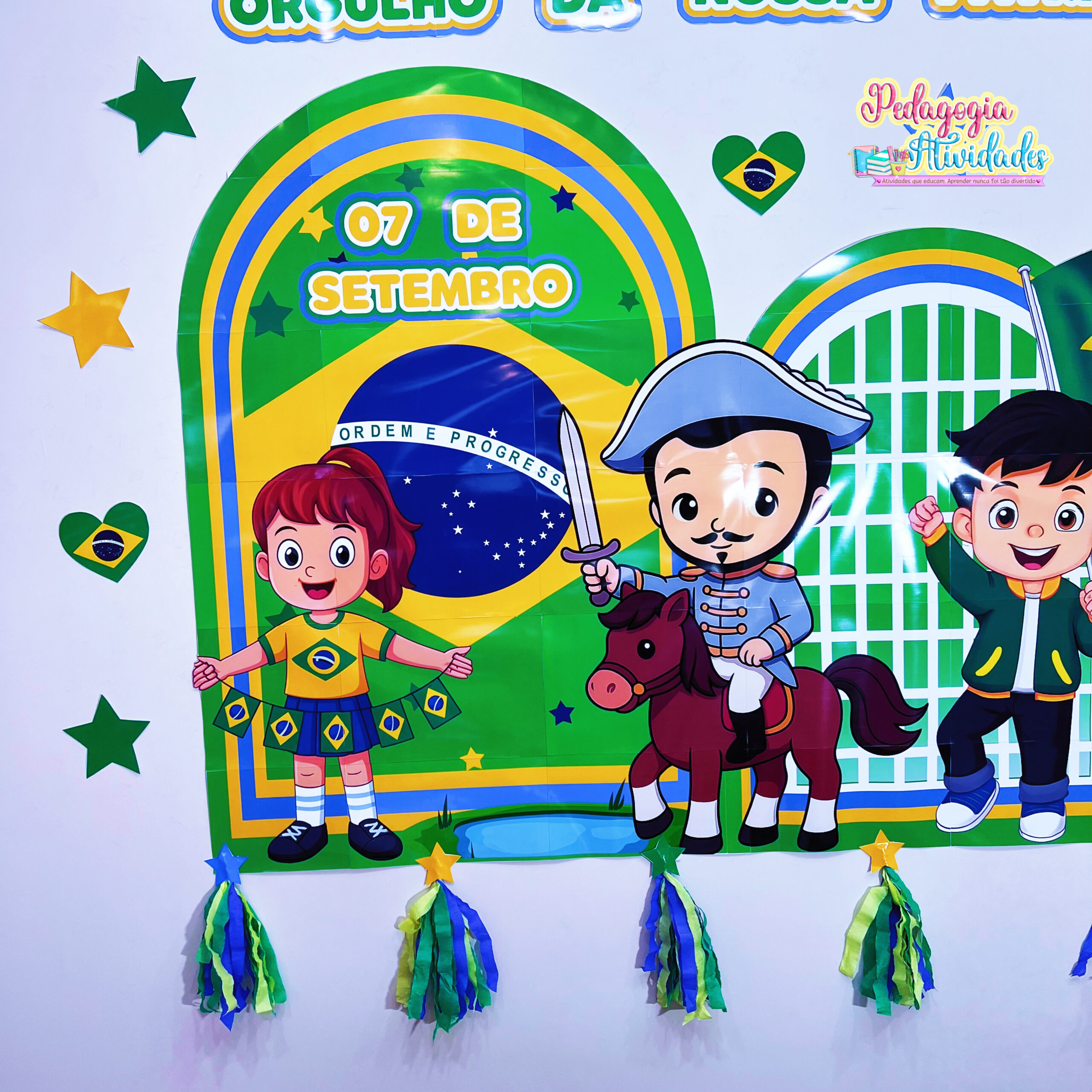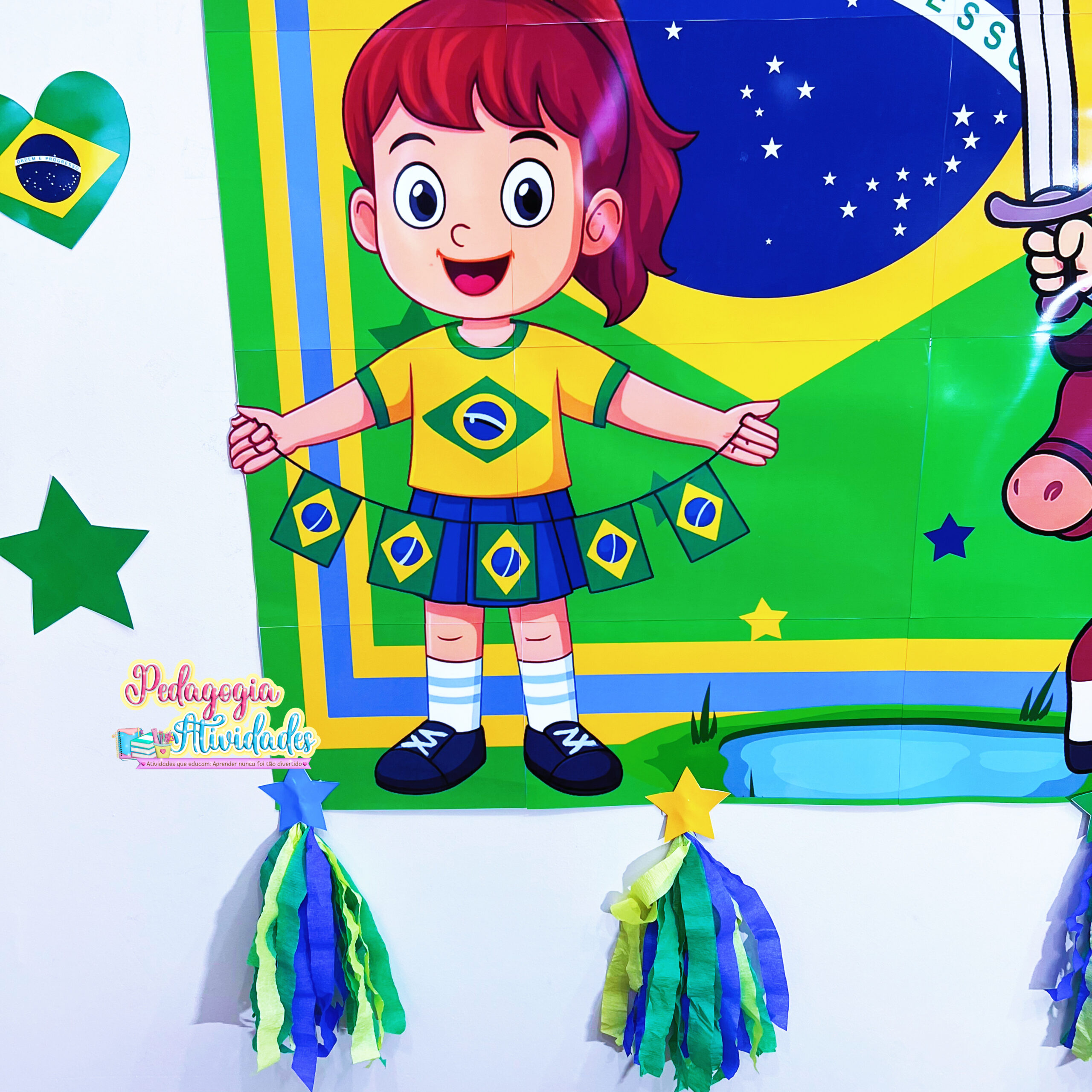 O painel traz toda a atmosfera da data e, para complementar, o cartão em formato 3D revela uma criança segurando a bandeira do Brasil, tornando a atividade interativa e inesquecível.
