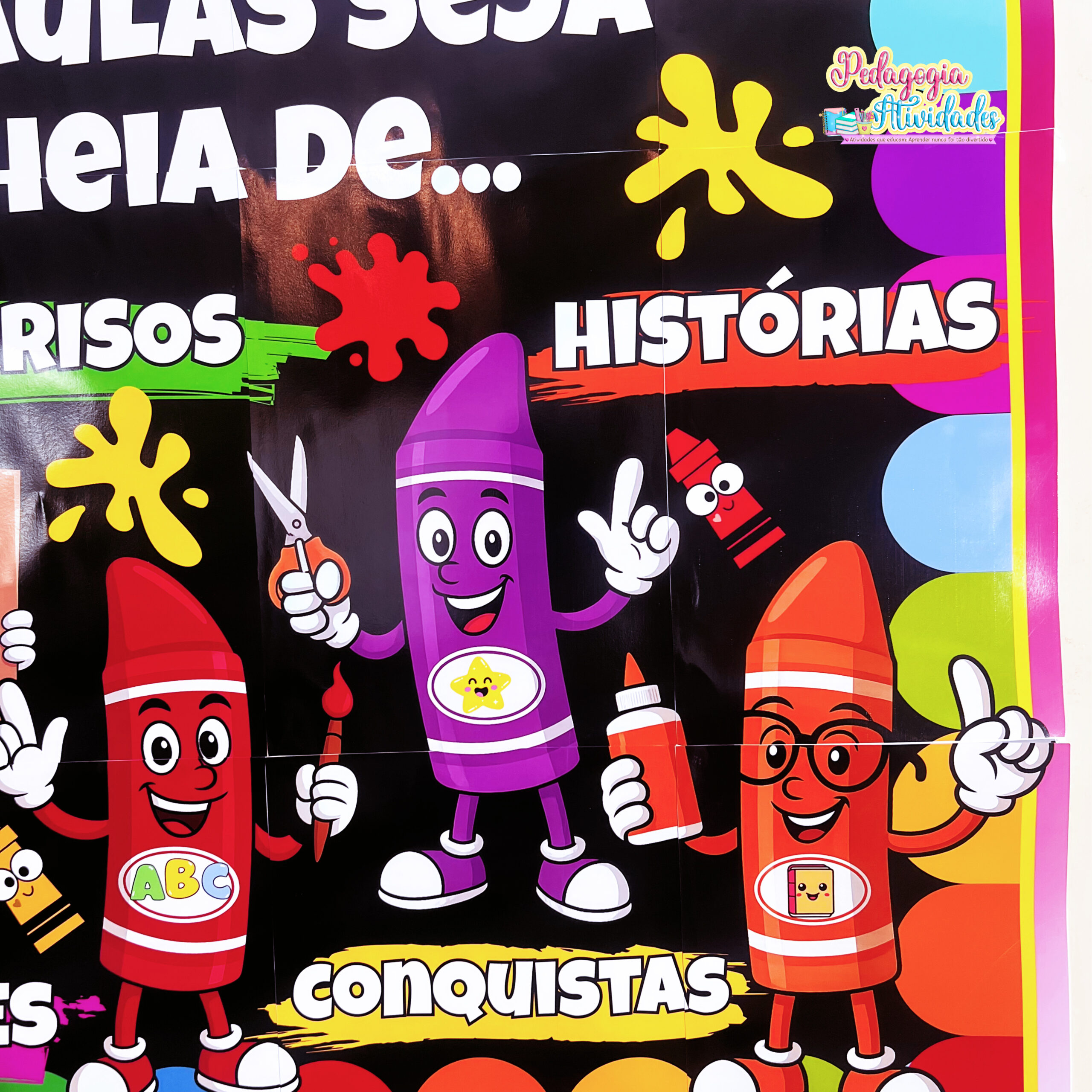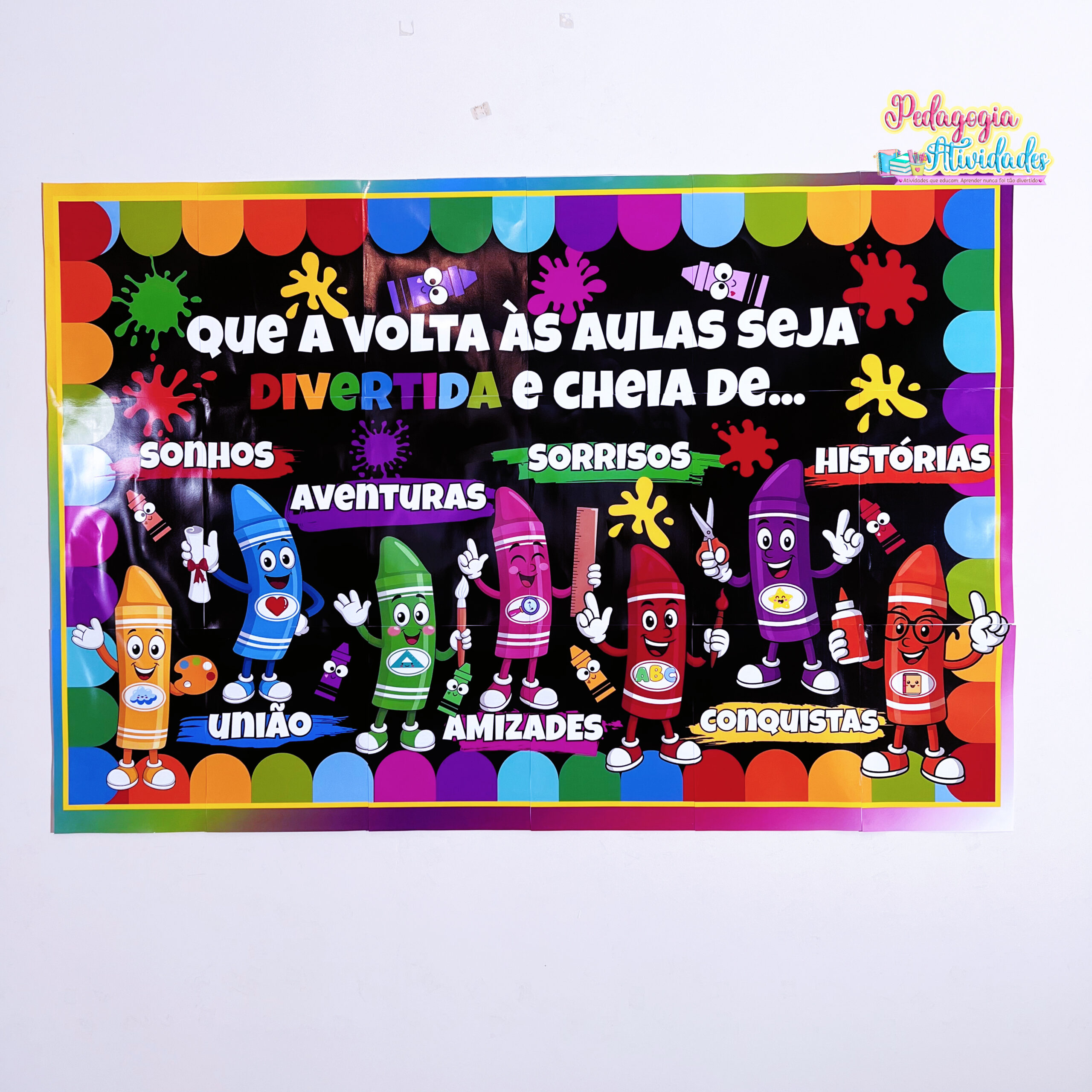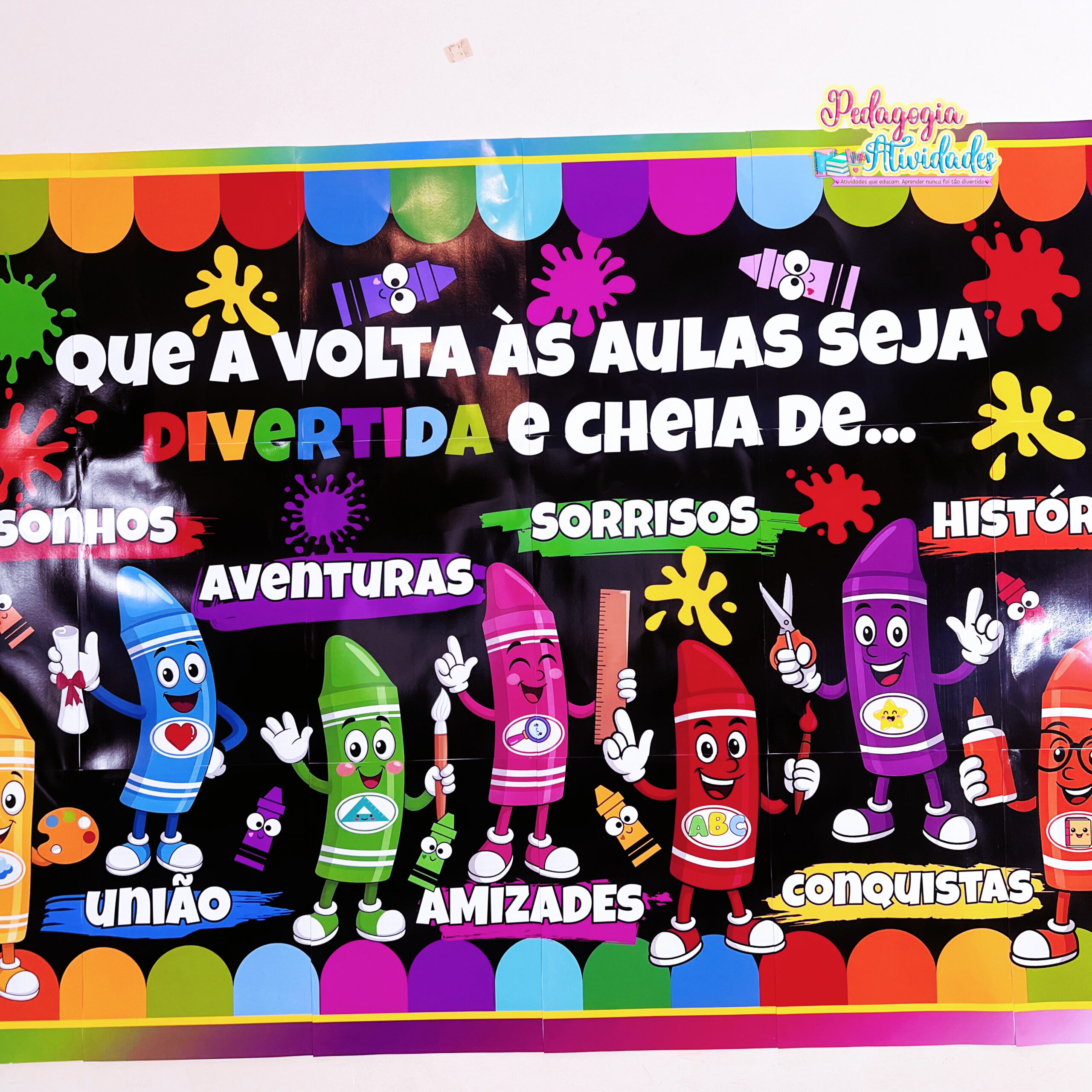 ✔️ Painel temático “Lápis Coloridos” com a frase: