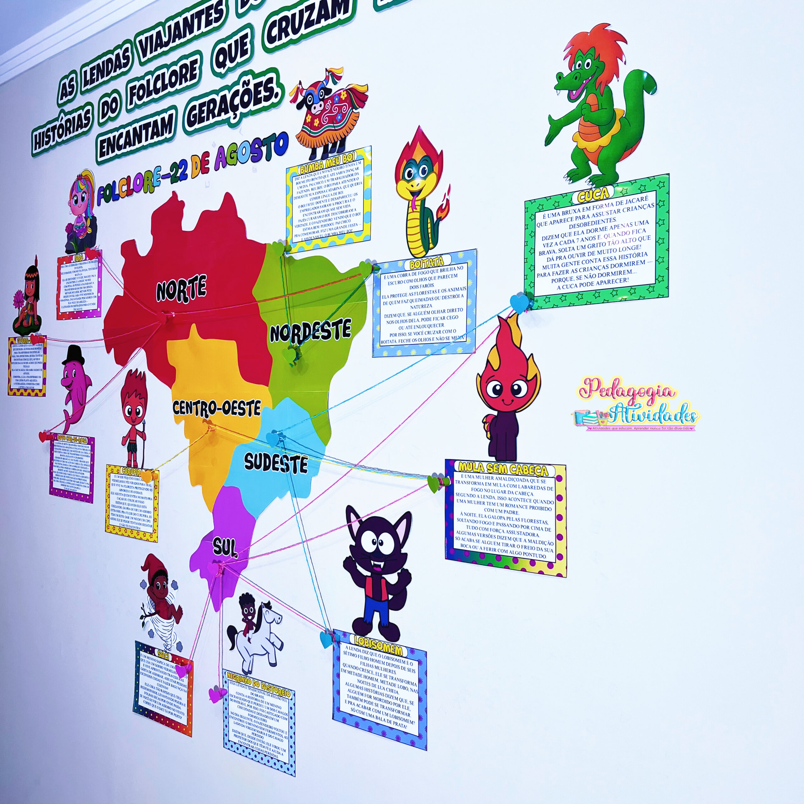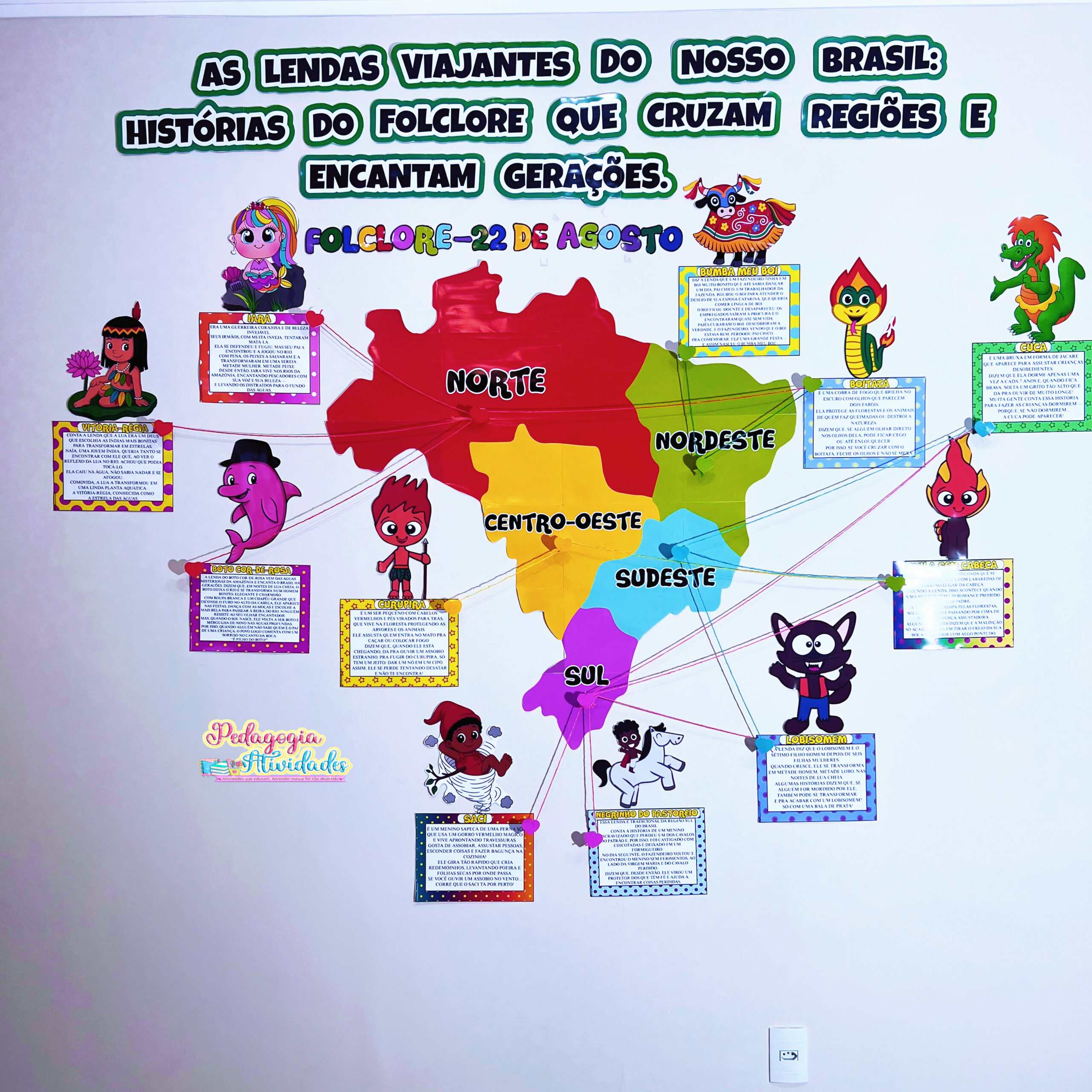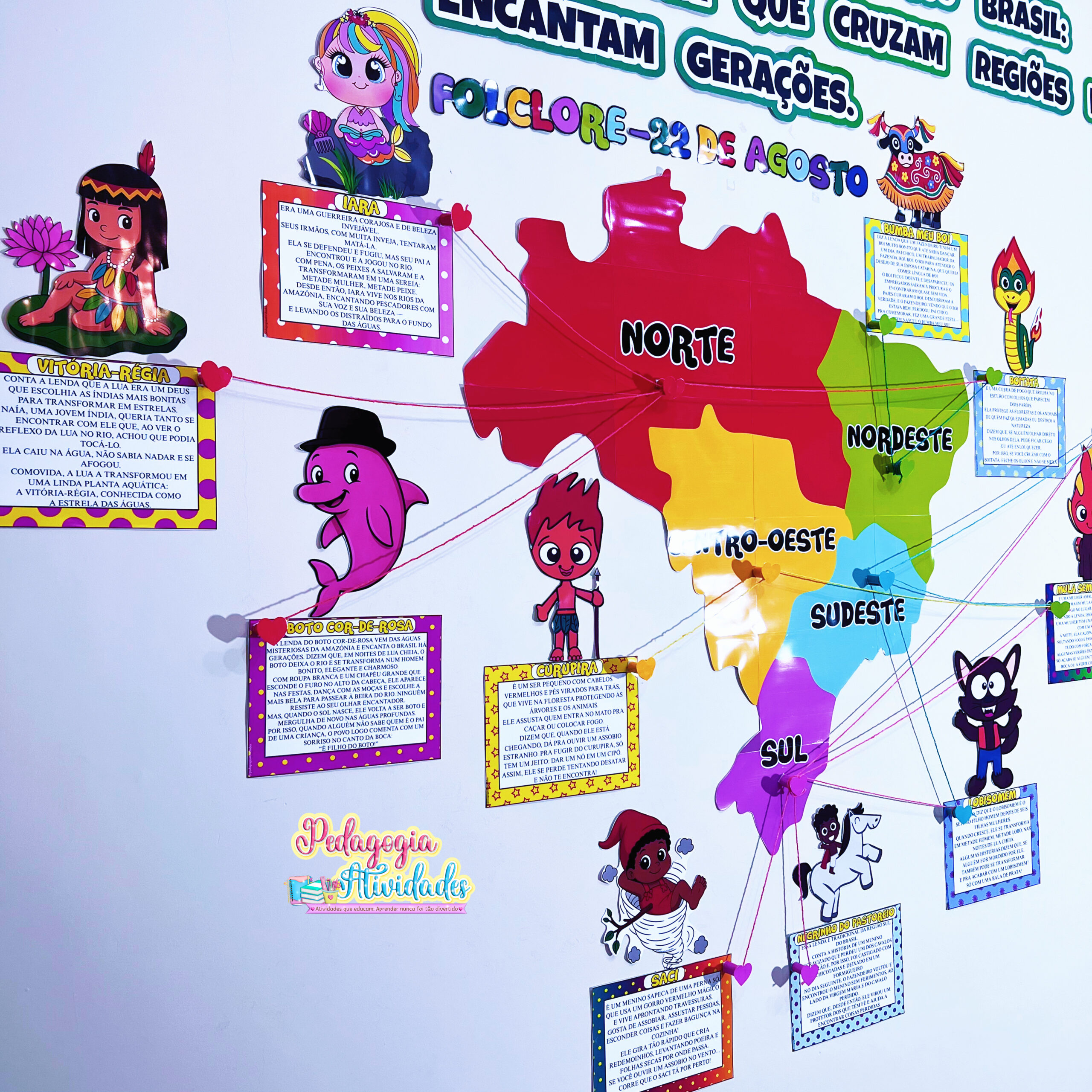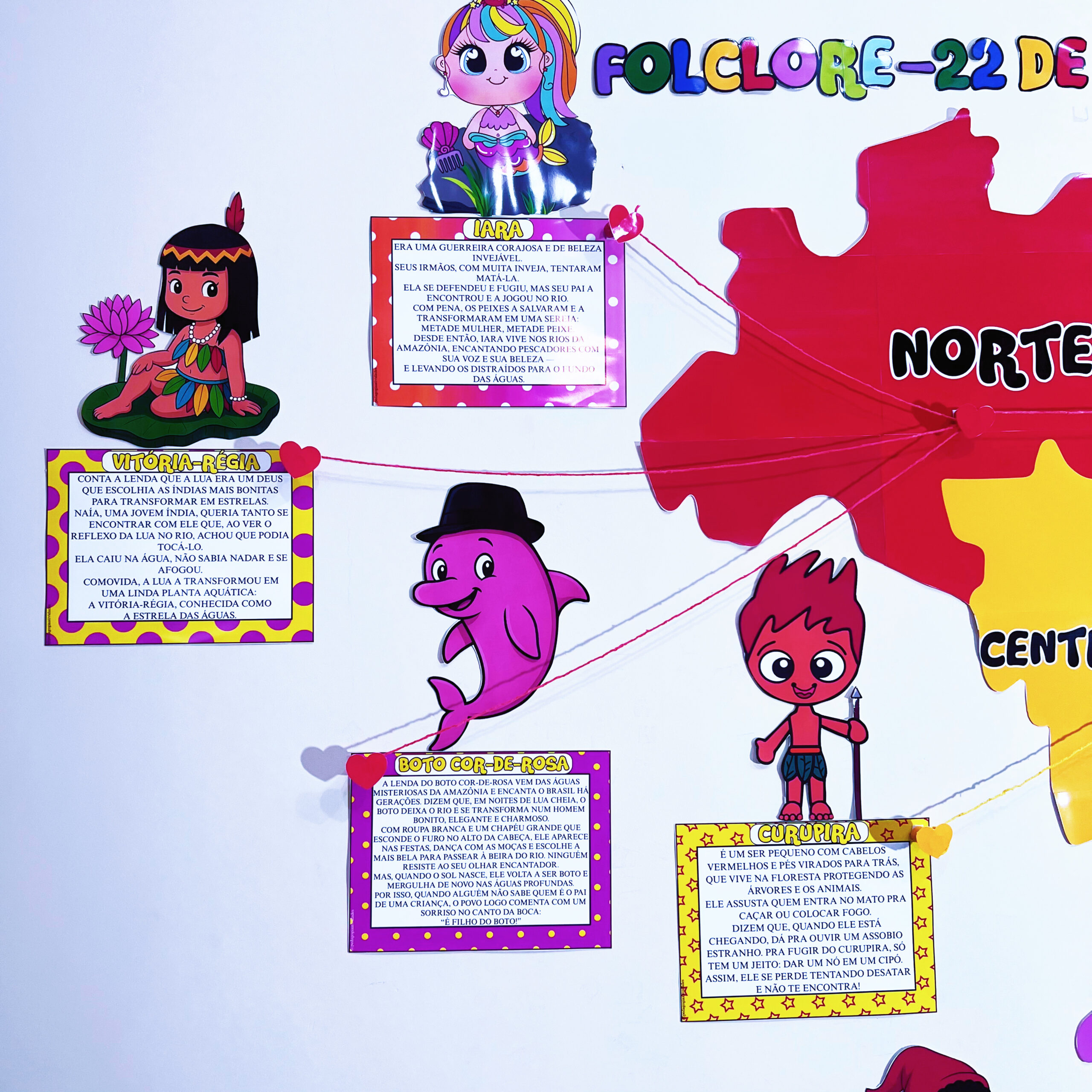 ✔️ Painel com 11 personagens e suas lendas (Iara, Vitória-Régia, Boto Cor-de-Rosa, Curupira, Saci, Negrinho do Pastoreio, Lobisomem, Boitatá, Cuca, Mula sem Cabeça e Boi-Bumbá)