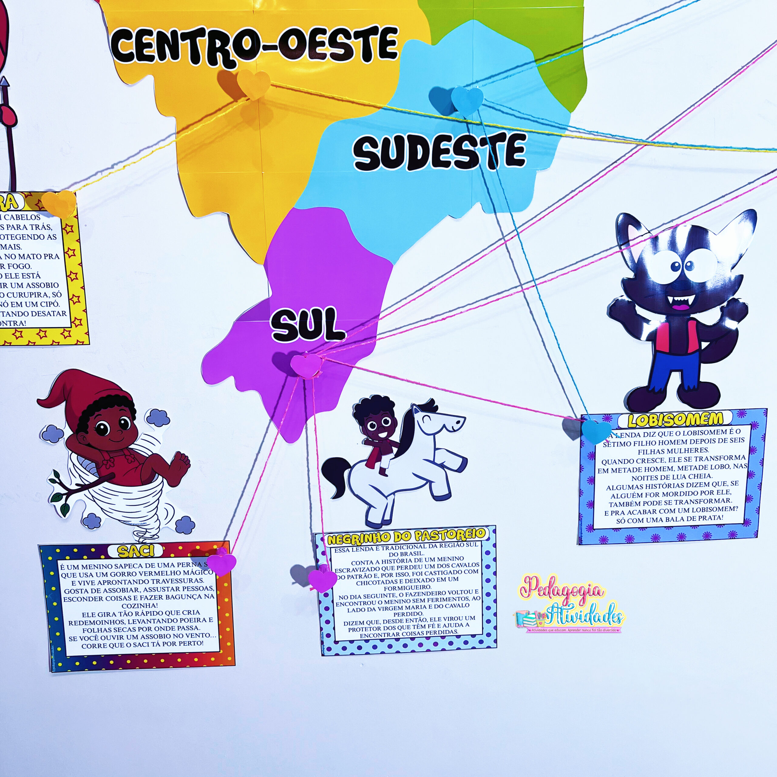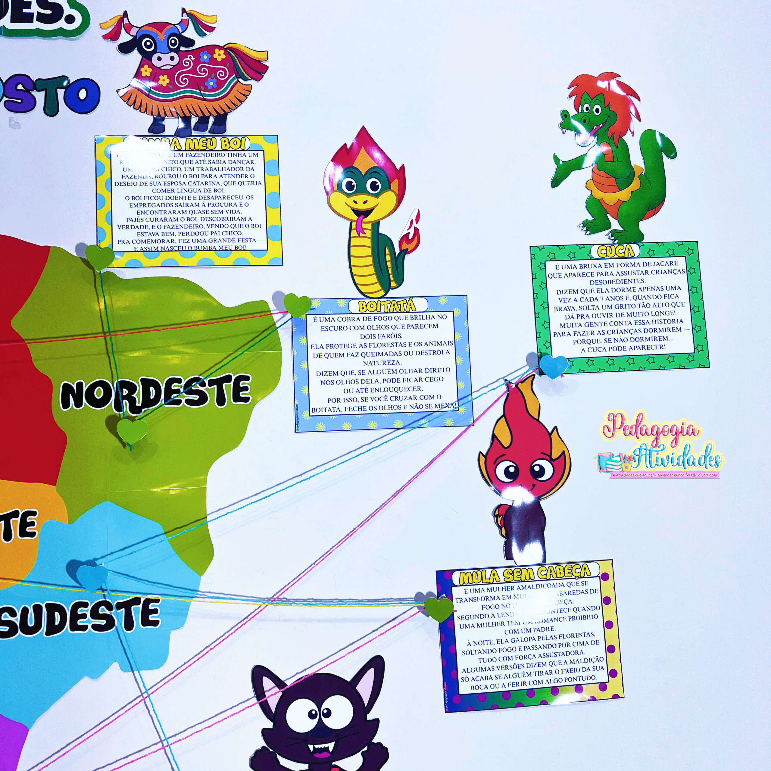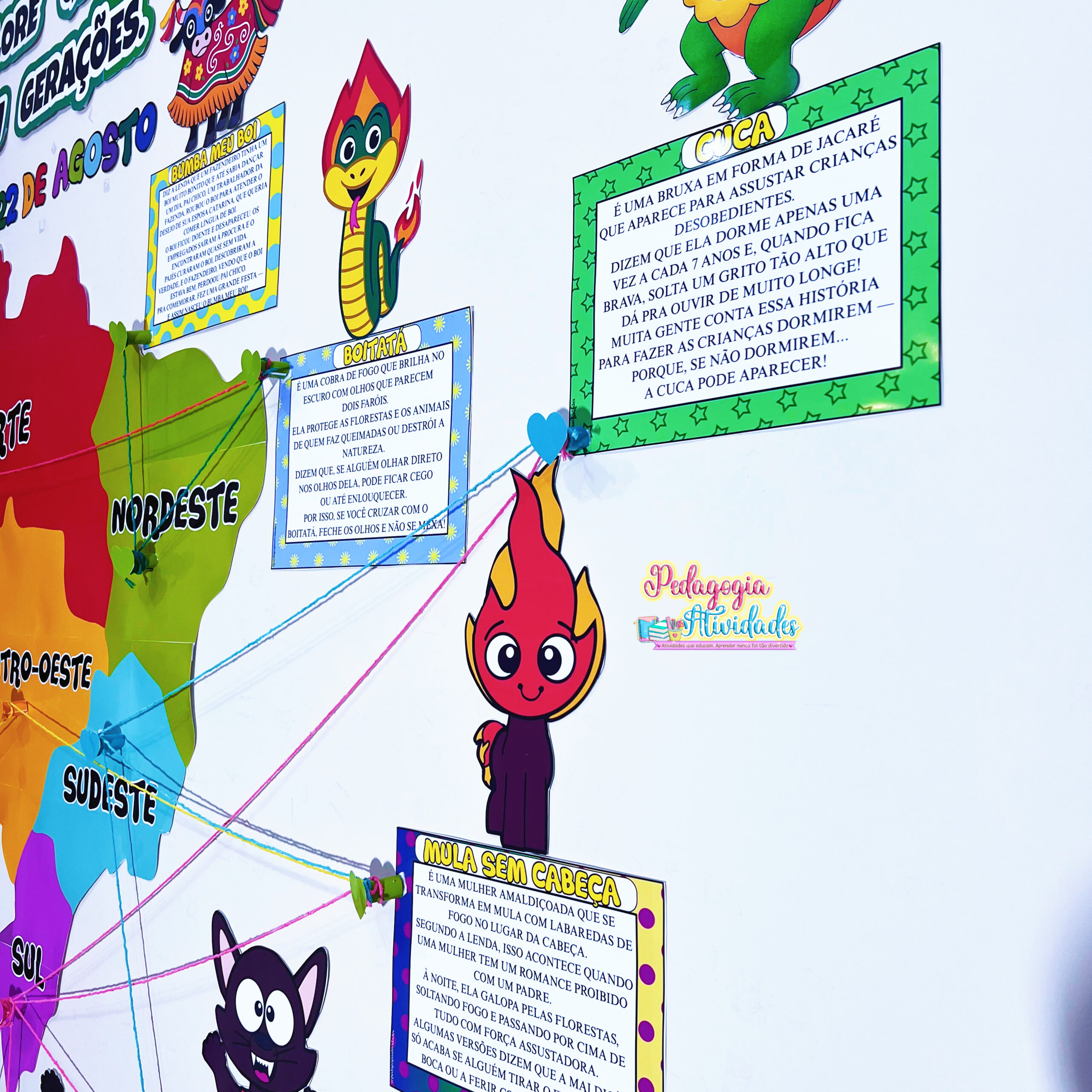 ✔️ Painel com 11 personagens e suas lendas (Iara, Vitória-Régia, Boto Cor-de-Rosa, Curupira, Saci, Negrinho do Pastoreio, Lobisomem, Boitatá, Cuca, Mula sem Cabeça e Boi-Bumbá)