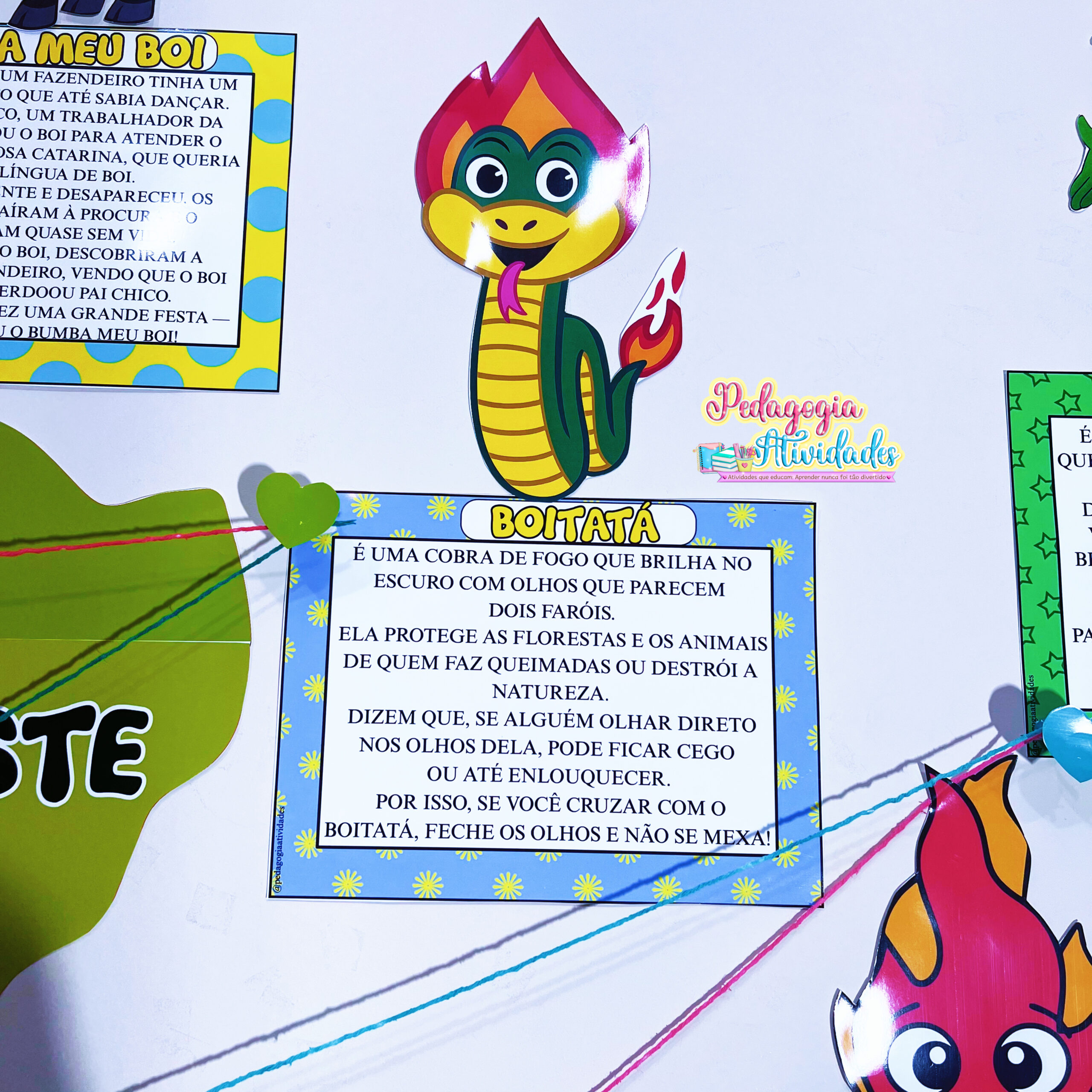 ✔️ Painel com 11 personagens e suas lendas: Iara, Vitória-Régia, Boto Cor-de-Rosa, Curupira, Saci, Negrinho do Pastoreio, Lobisomem, Boitatá, Cuca, Mula sem Cabeça e Boi-Bumbá.