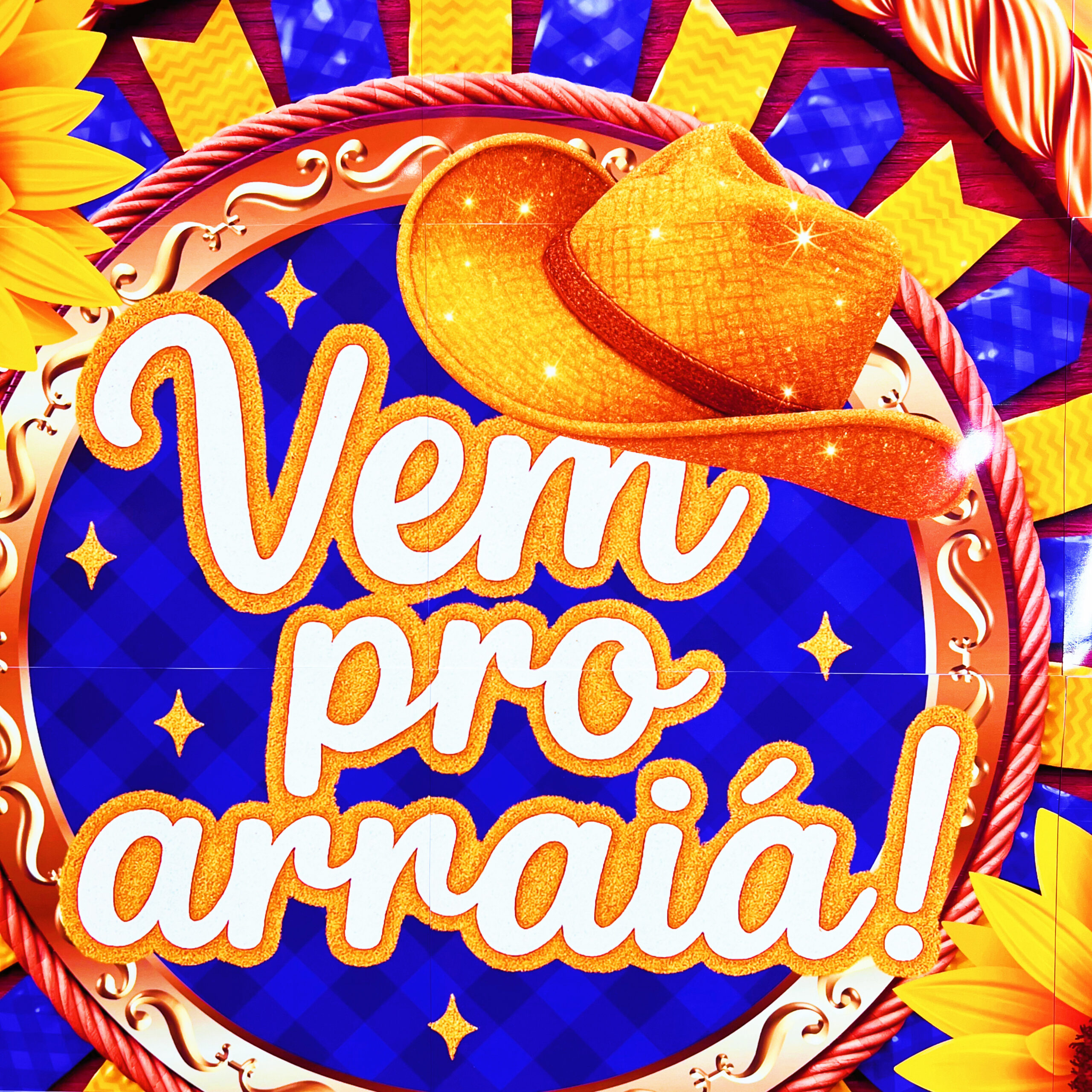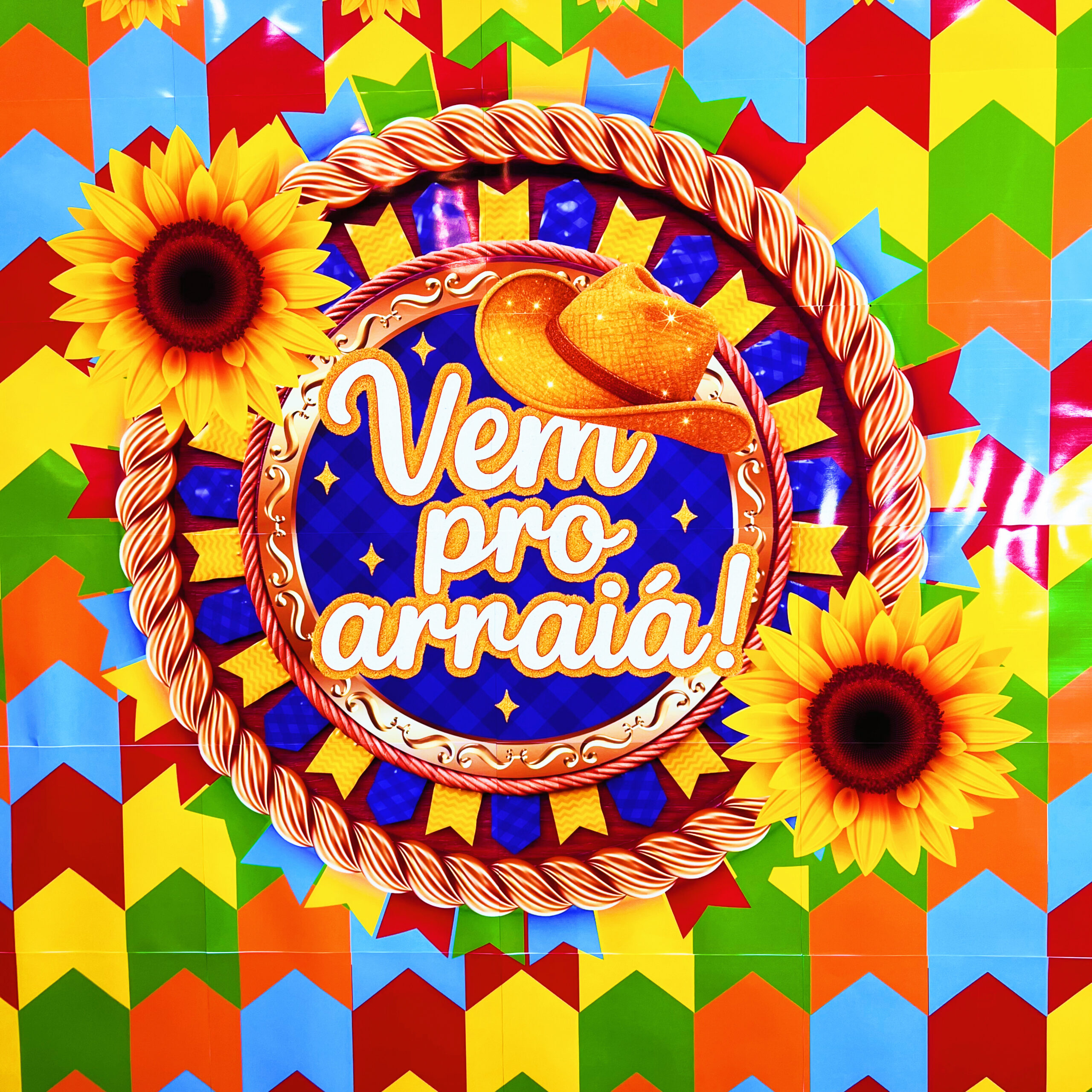 ✔️ Círculo central com a frase “Vem pro Arraiá!”