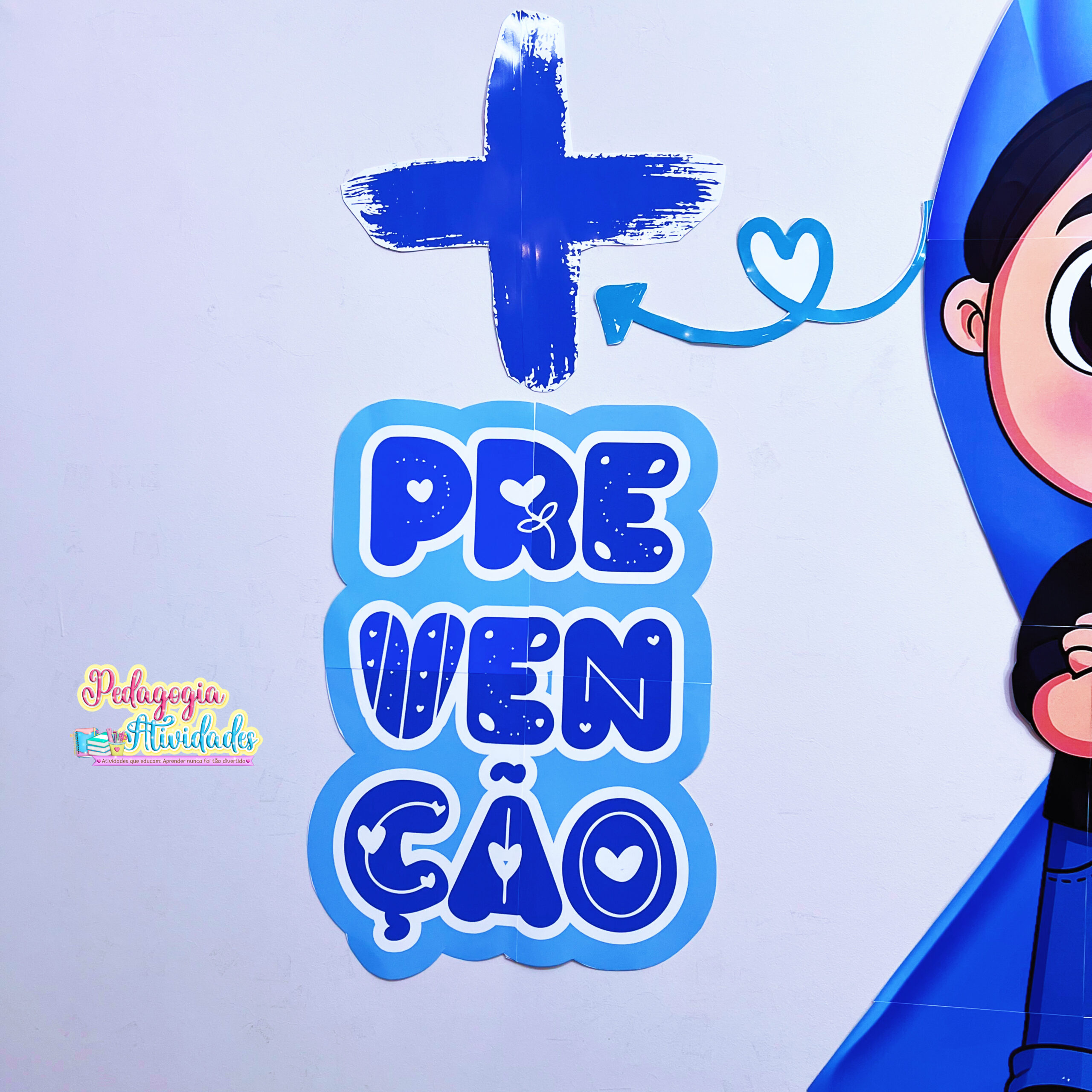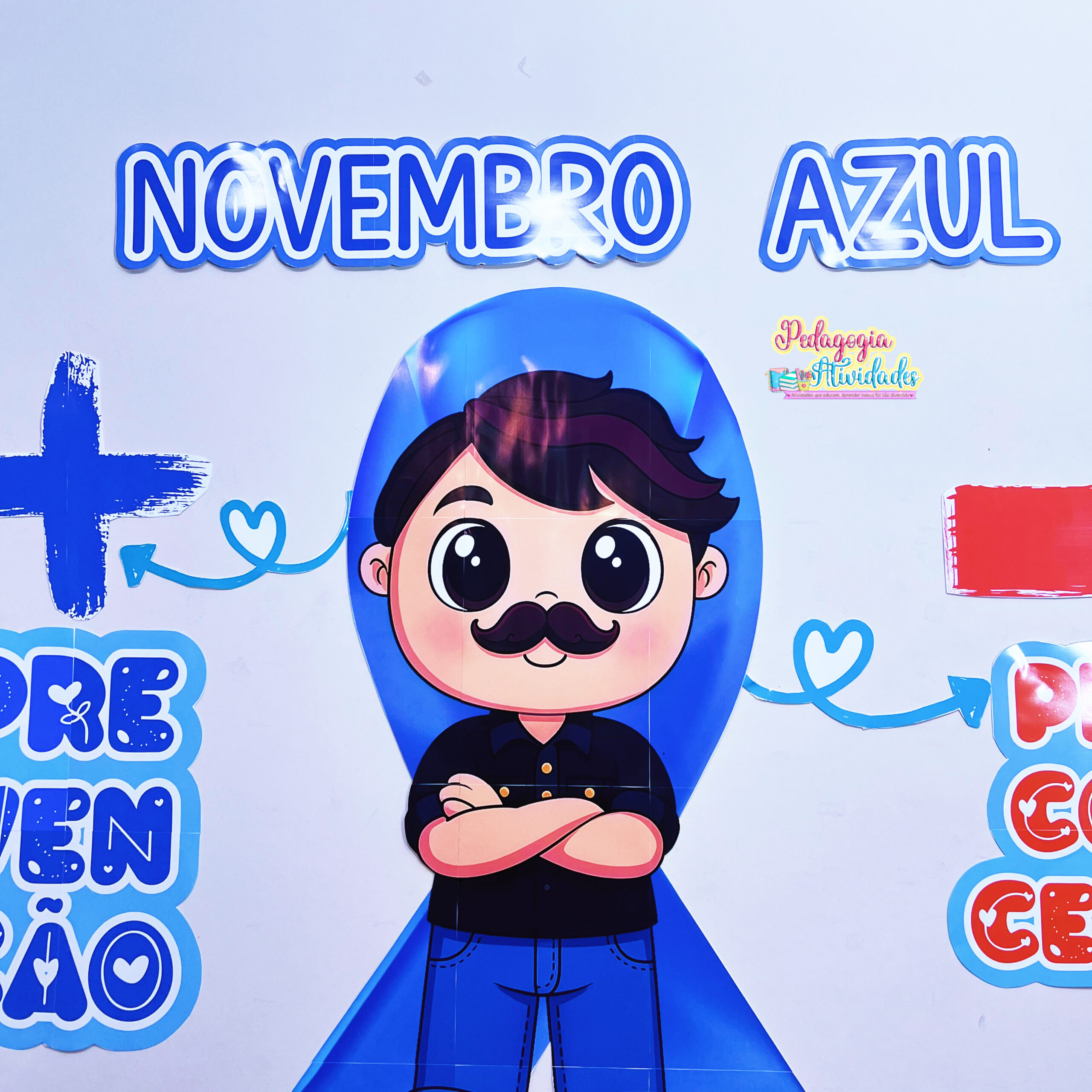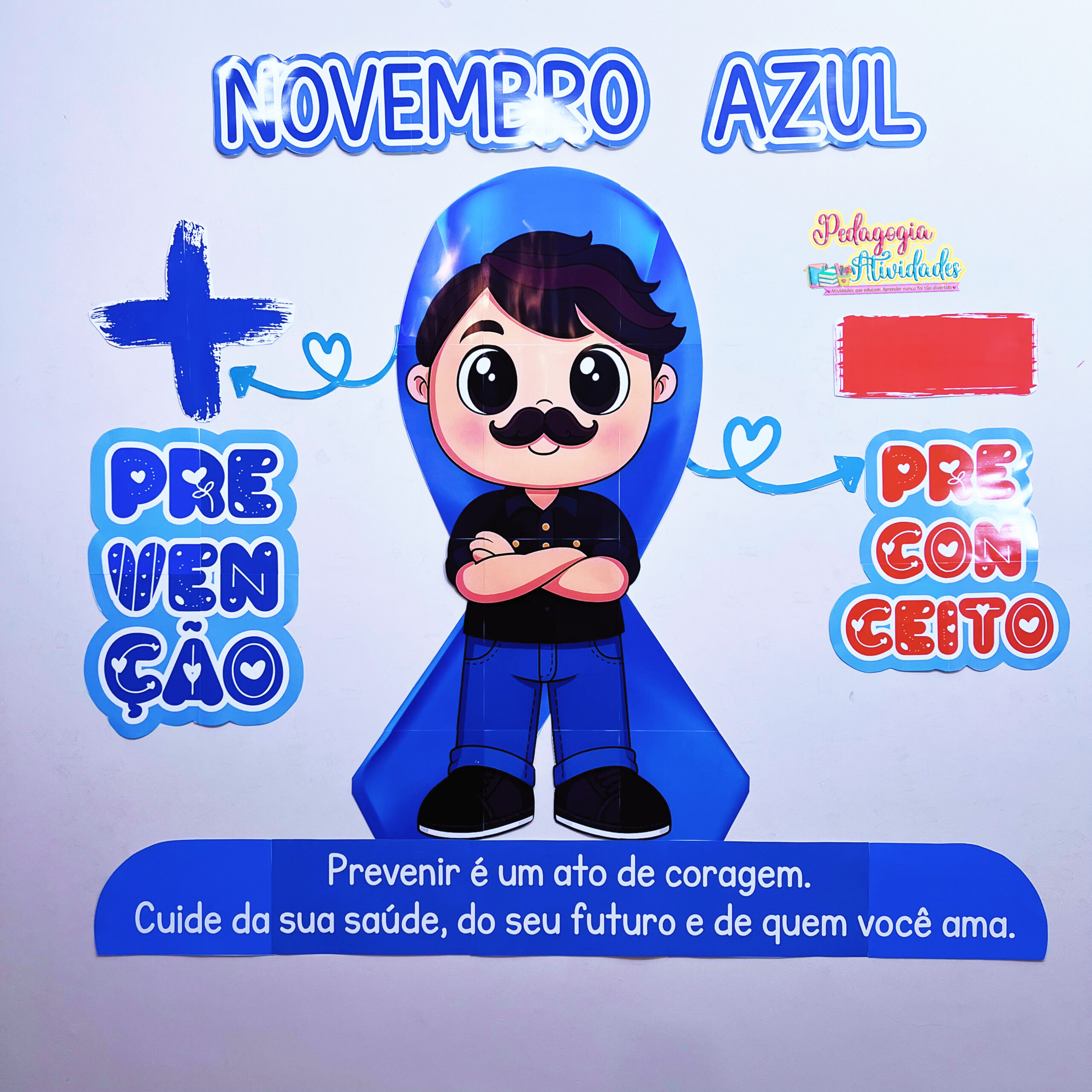 As crianças e alunos vão se engajar com o Painel Novembro Azul: o homem centralizado com os braços cruzados, o laço azul ao fundo, os símbolos “+ Prevenção” e “– Preconceito”, desenvolvendo reflexão sobre saúde masculina, prevenção e combate ao preconceito! 💙