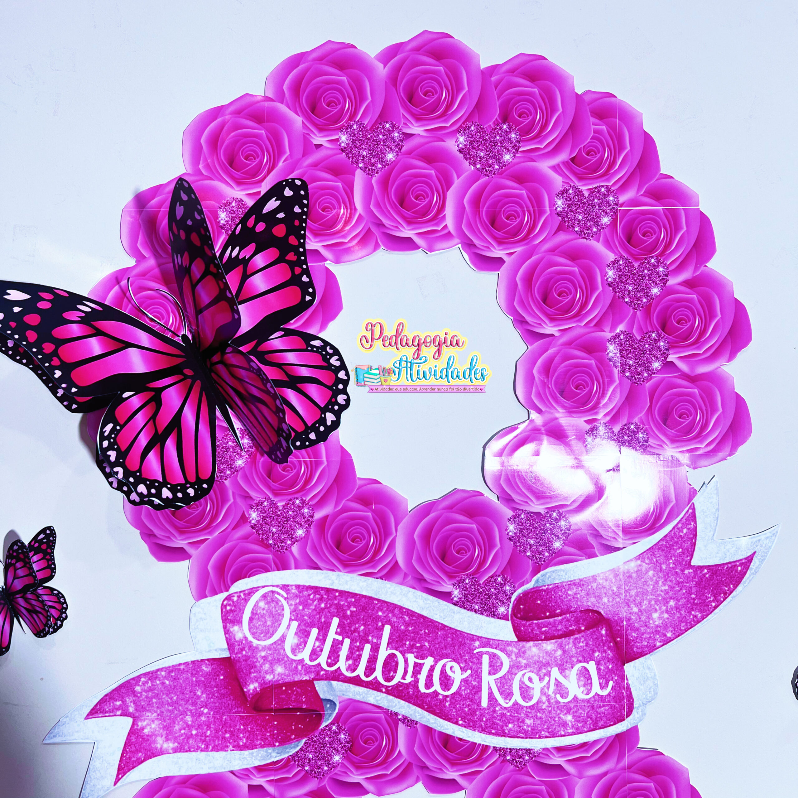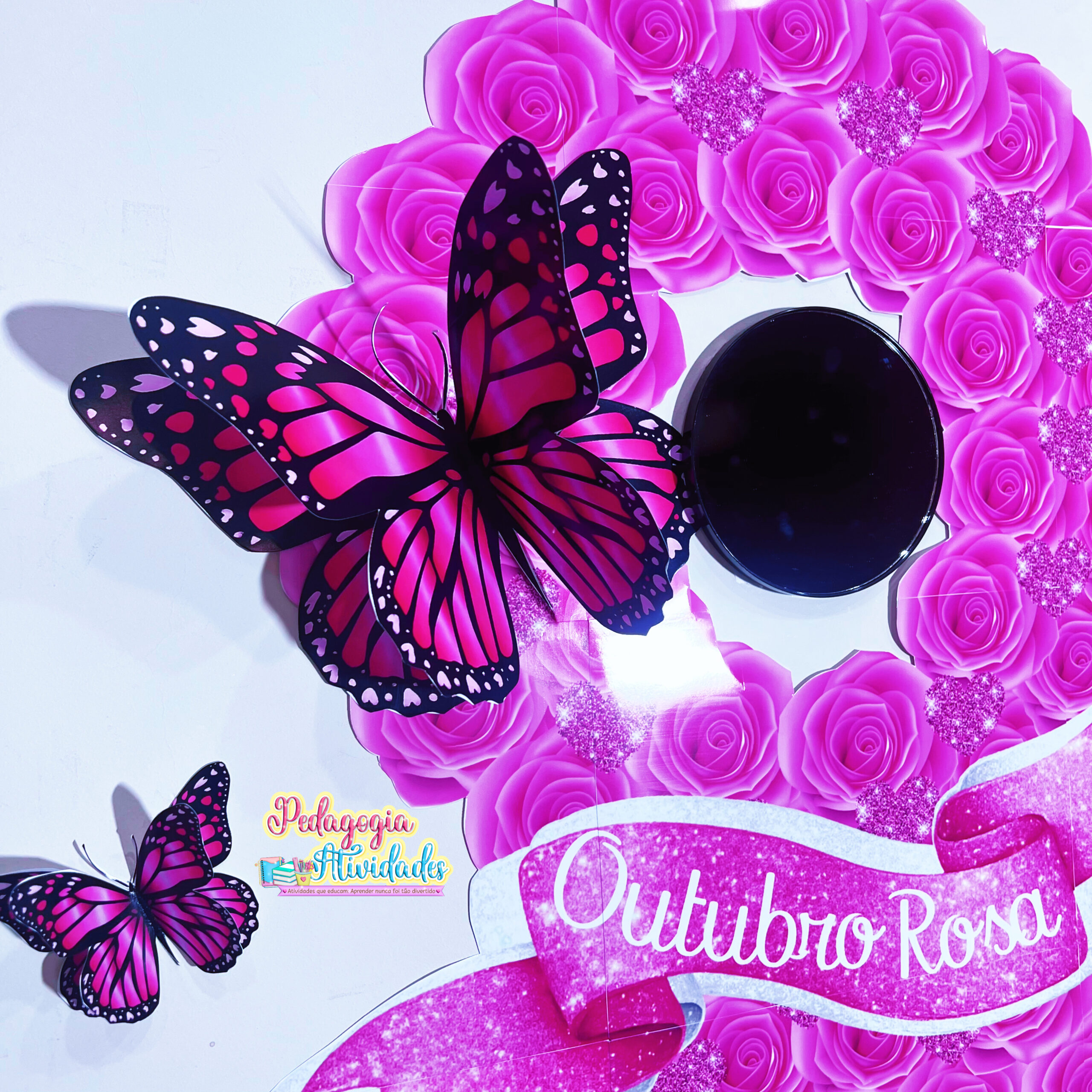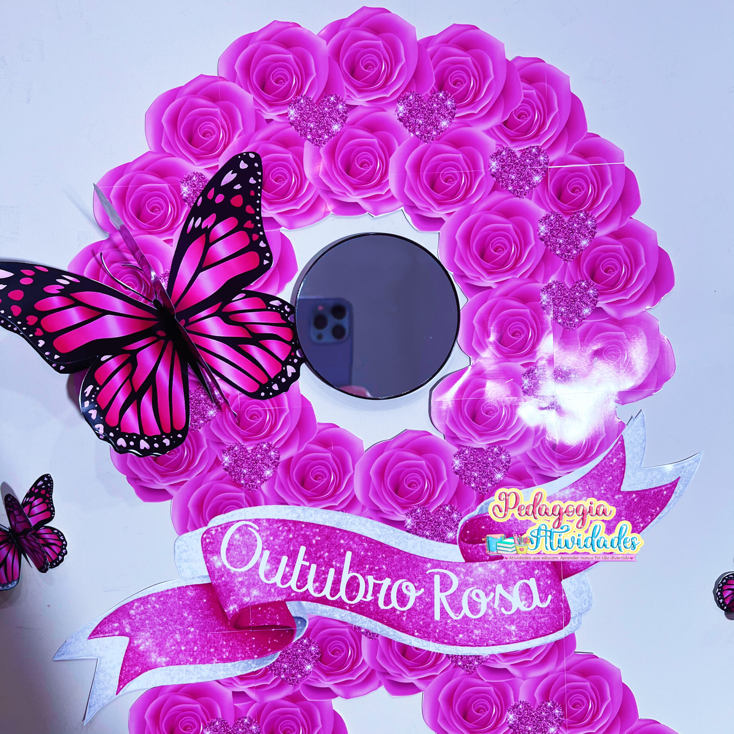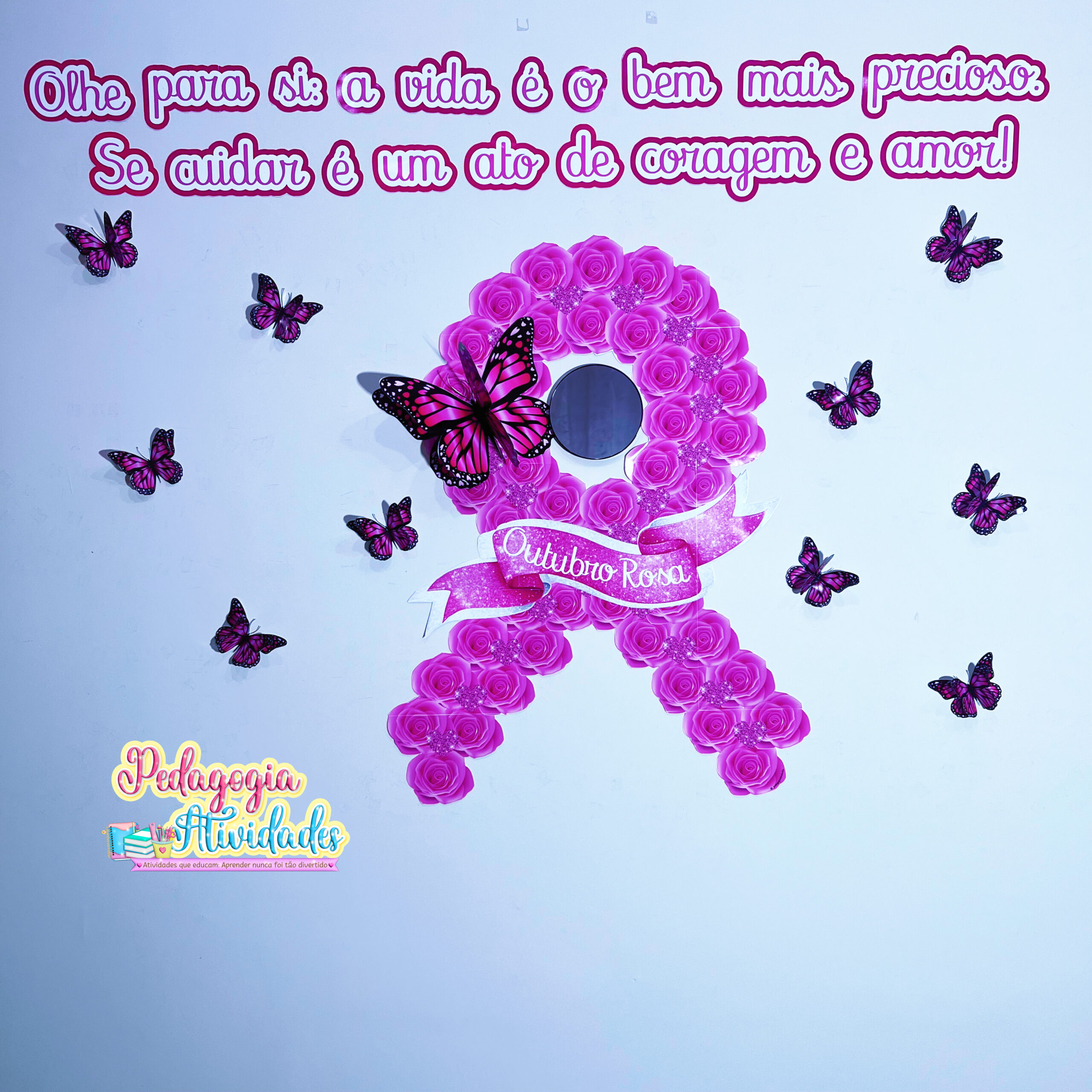 🌸 Esse Painel Outubro Rosa – Laço de Amor e Esperança traz um toque poético e visual encantador: um laço formado por flores, borboletas 3D e até a opção de incluir um espelho, criando um ambiente reflexivo e inspirador!