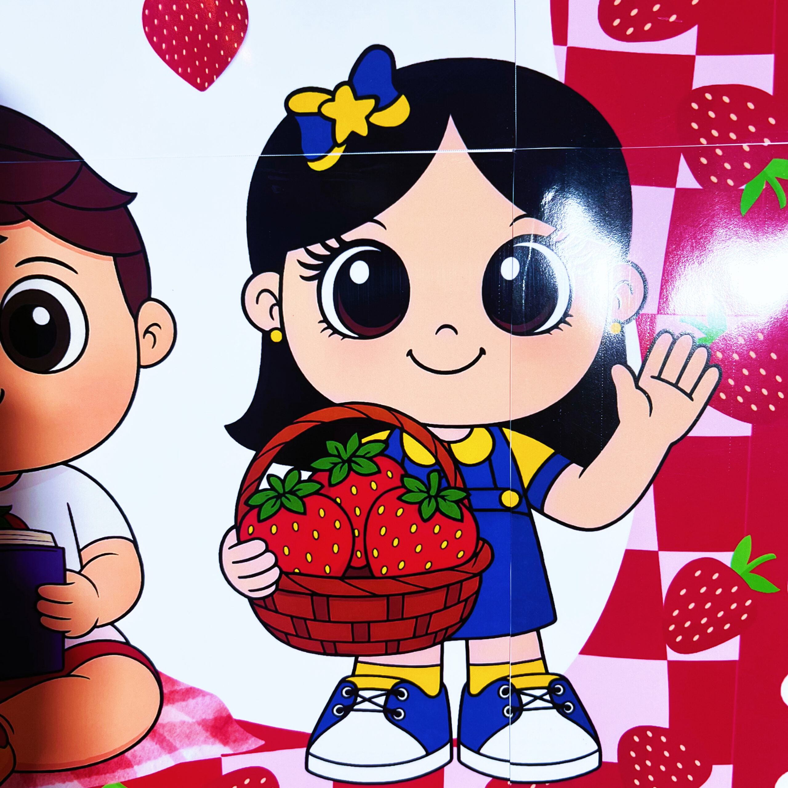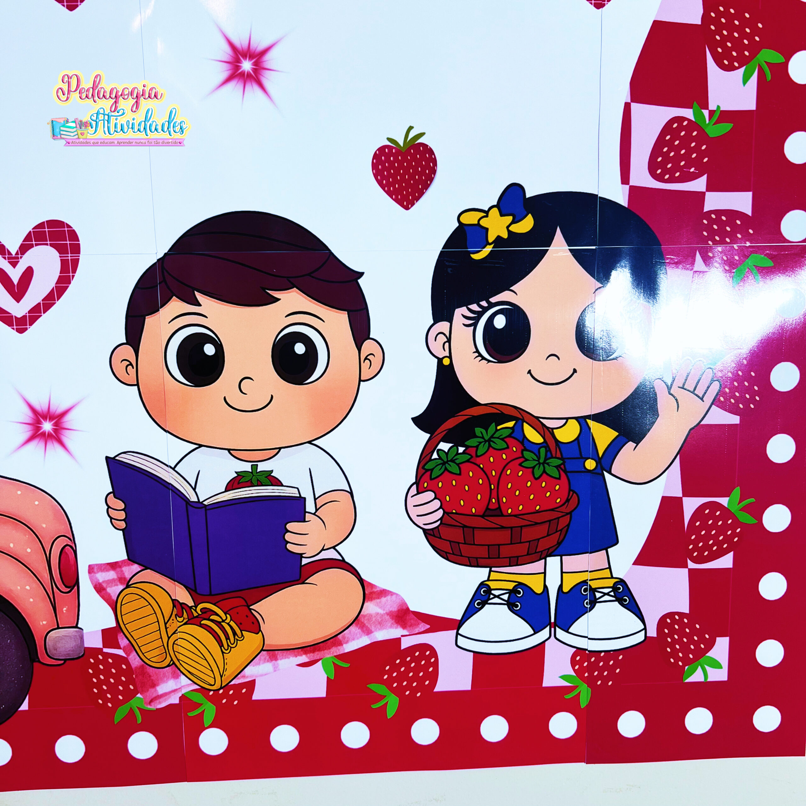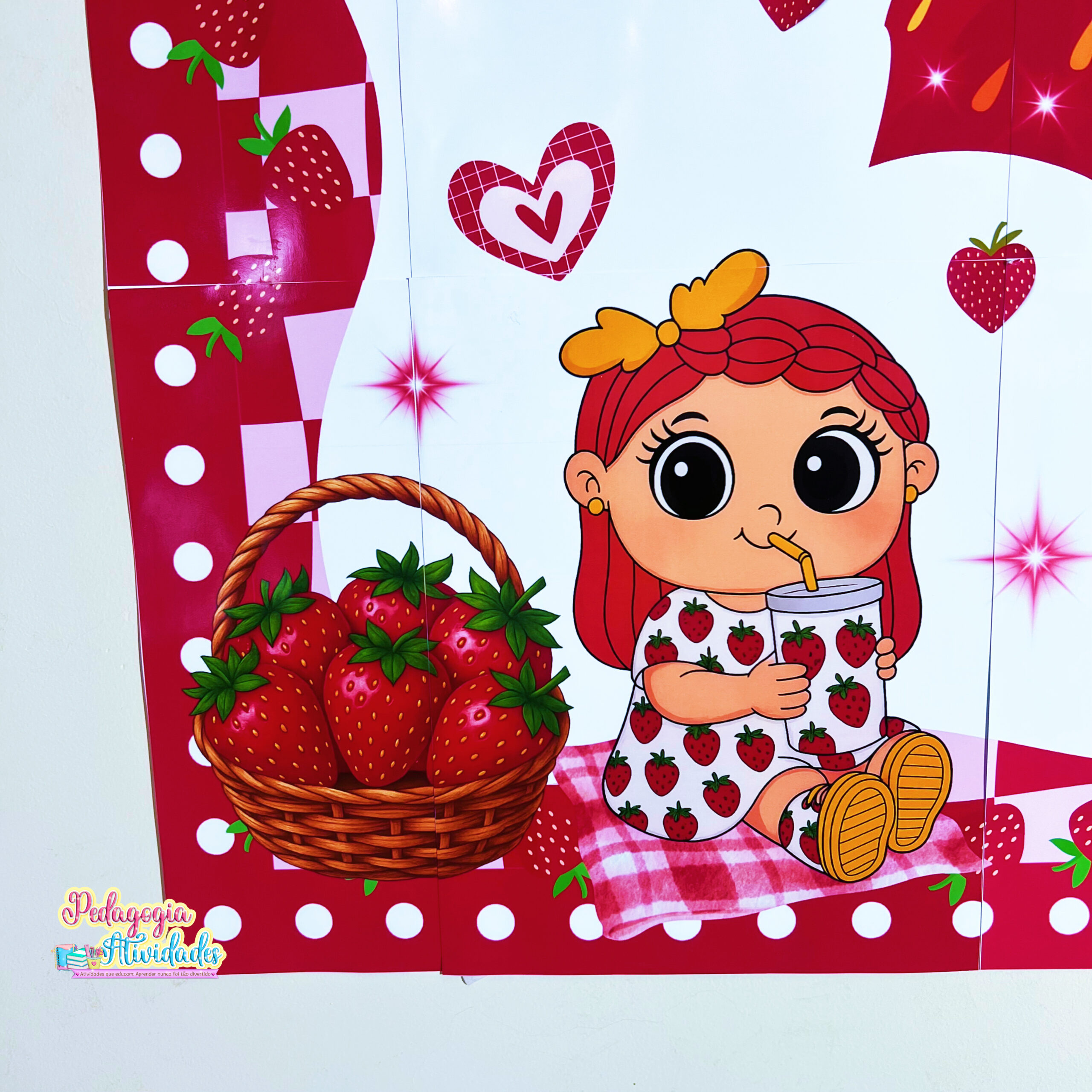✔️ Painel estilo banner com ilustrações de crianças segurando morangos