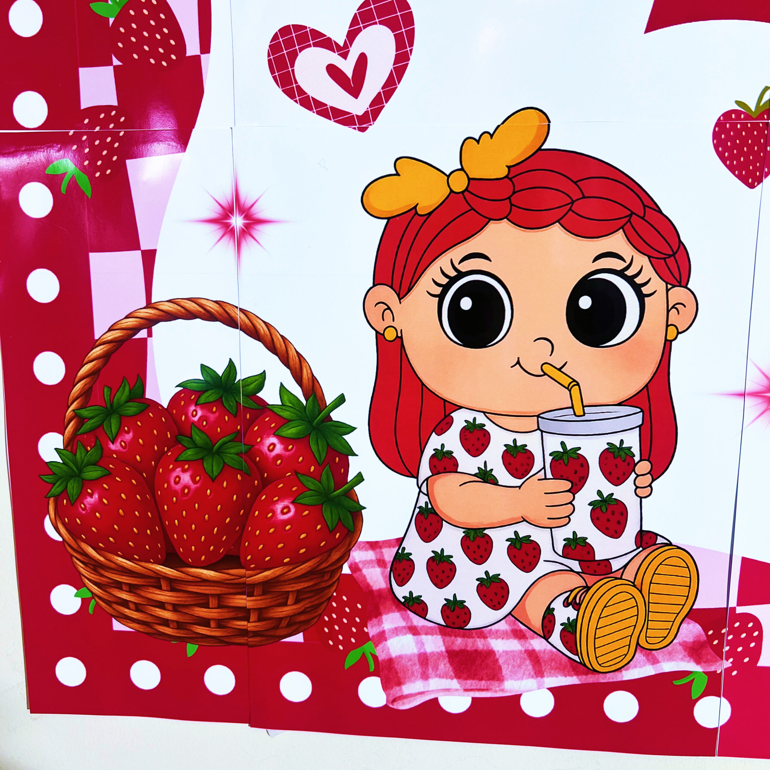• Painel estilo banner com ilustrações de crianças segurando morangos