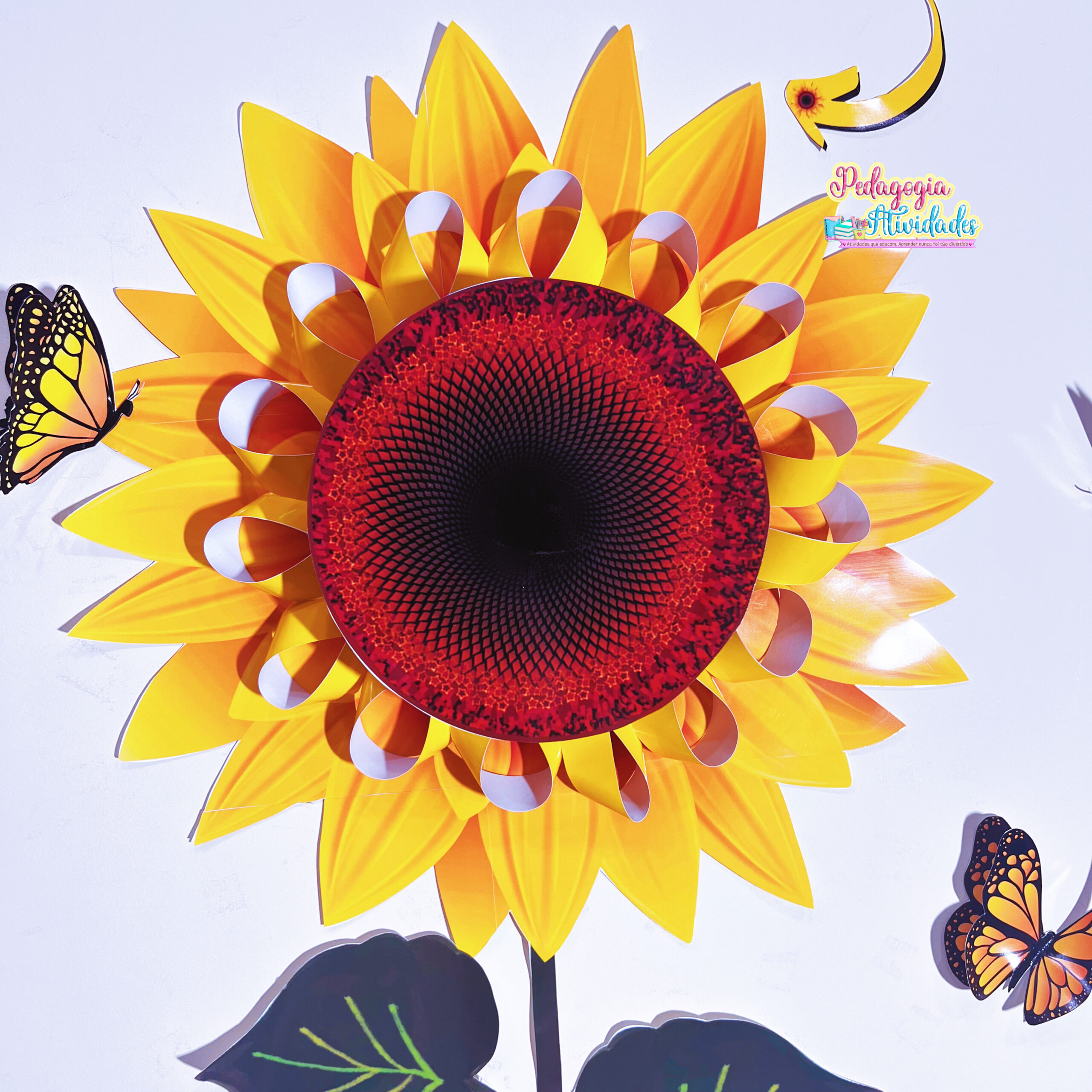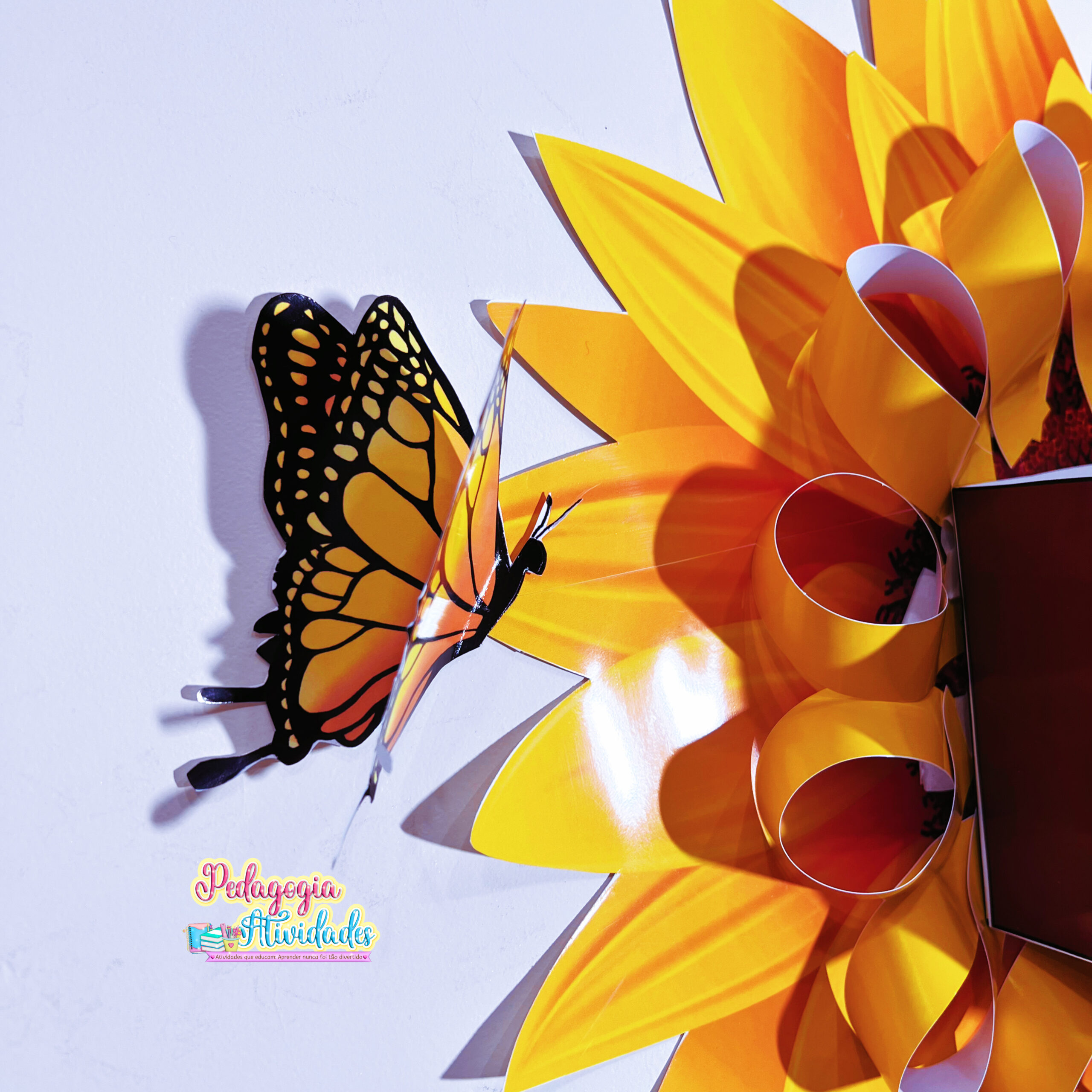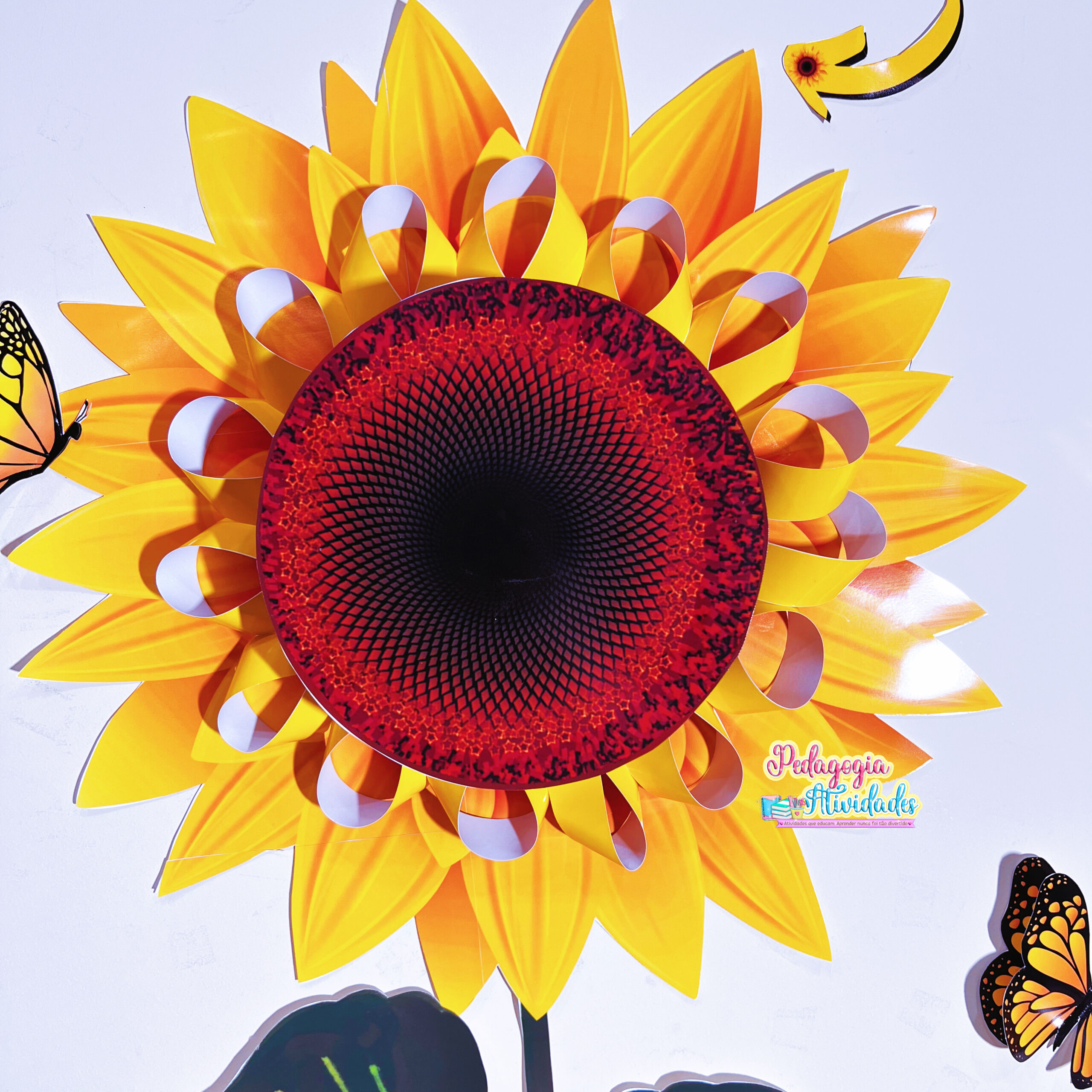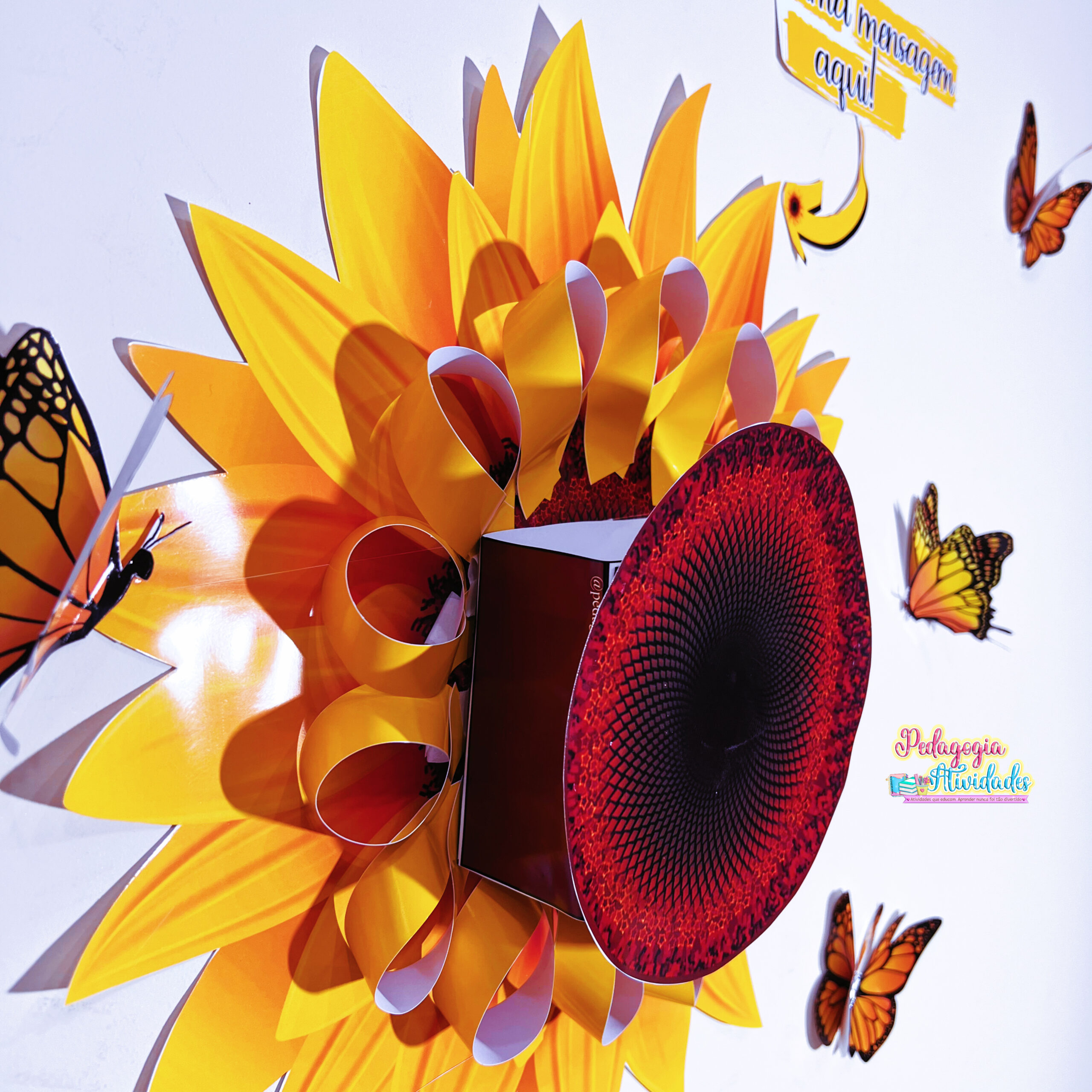 ✔️ Painel com girassol em efeito 3D e caixa no miolo contendo 32 mensagens de valorização da vida.