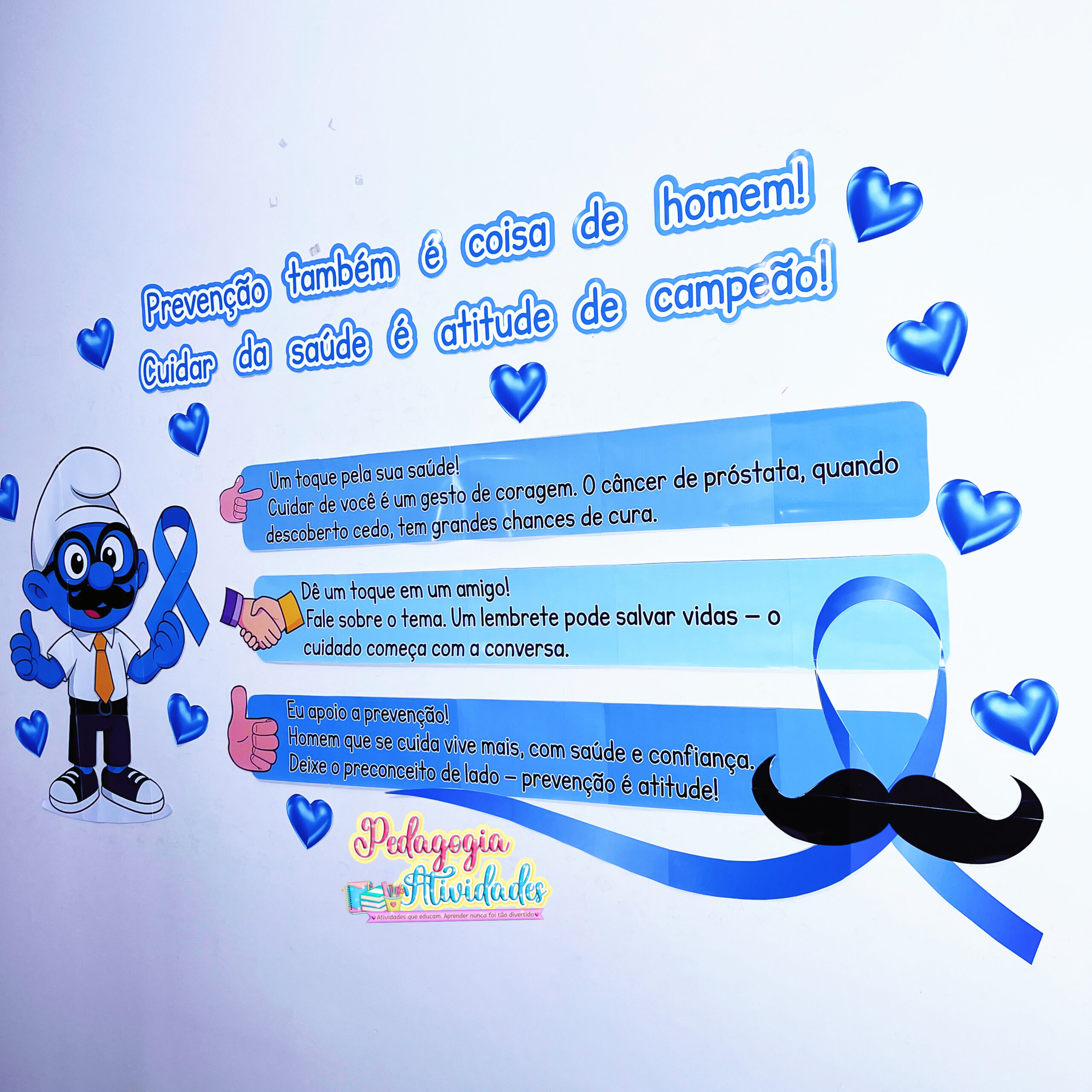 Com o Smurf da Conscientização e frases sobre prevenção e autocuidado masculino, este material transforma o aprendizado em um momento de reflexão e empatia — perfeito para escolas, murais e campanhas! 💪💙