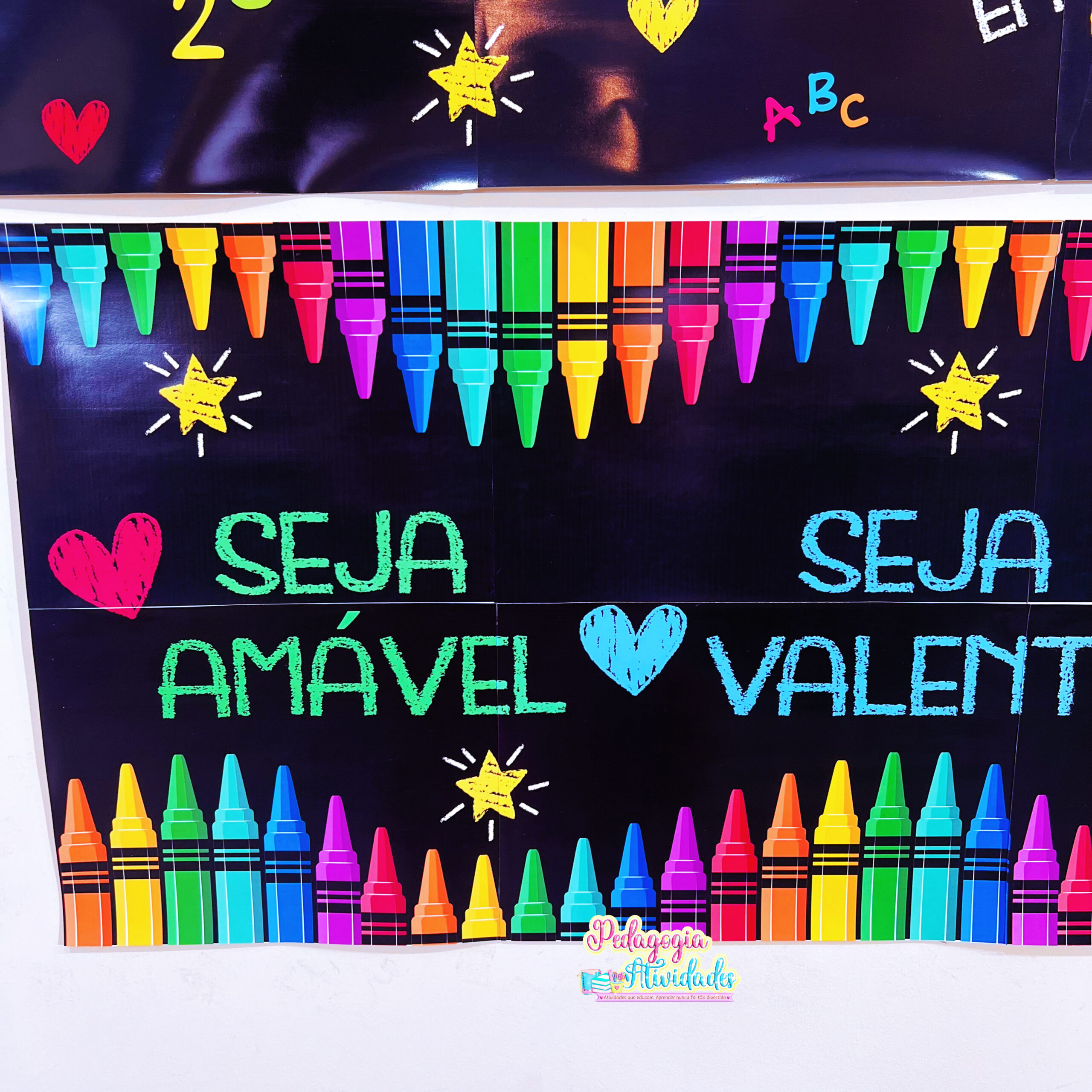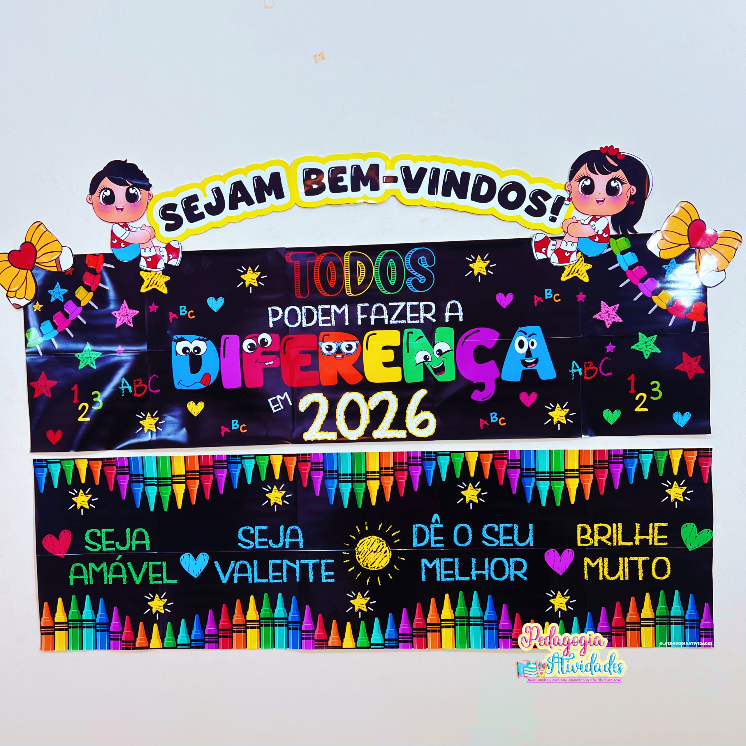 Com ilustração divertida, cores vibrantes e mensagens positivas, o painel cria um ambiente que inspira, motiva e faz cada aluno se sentir parte da escola desde o primeiro olhar 💛📚