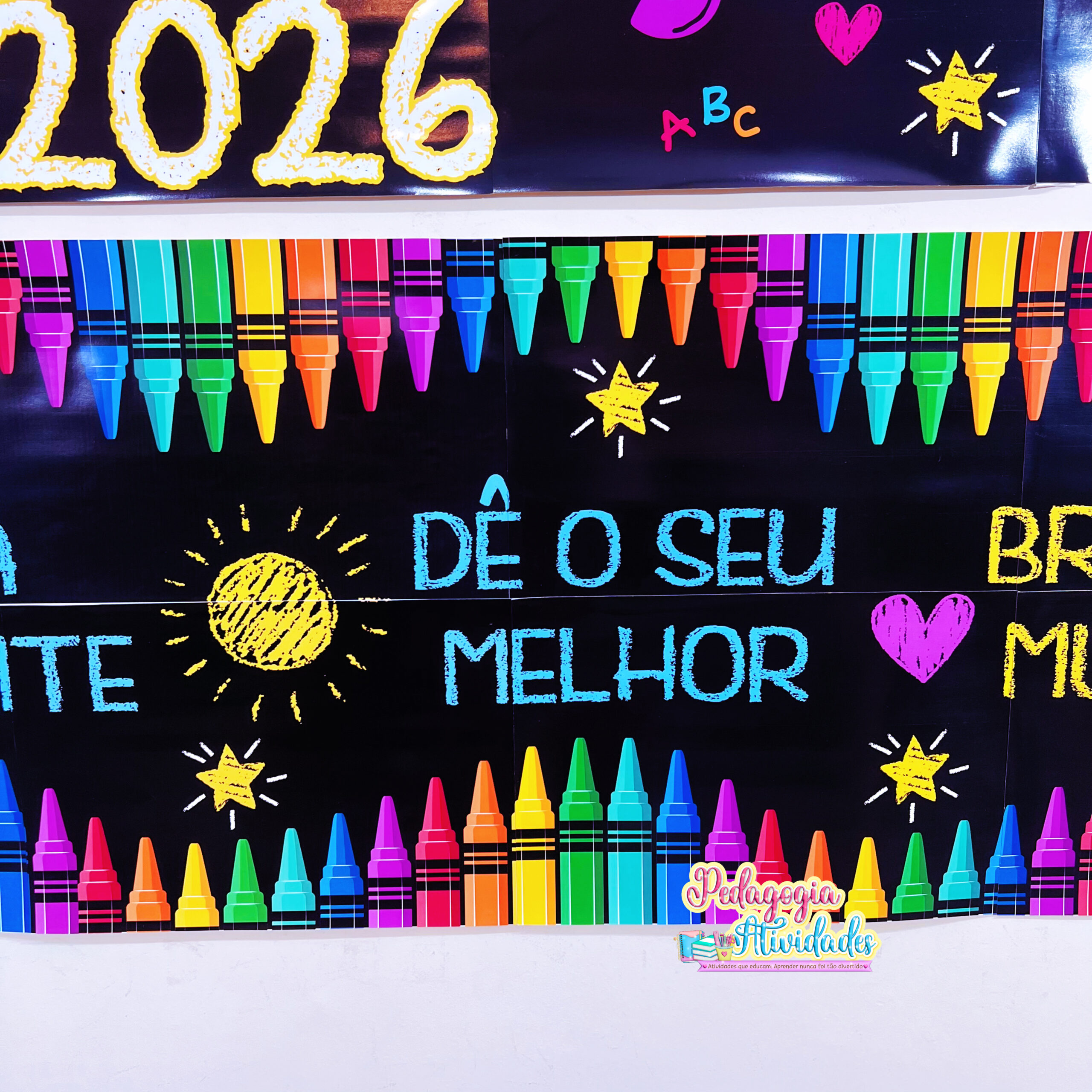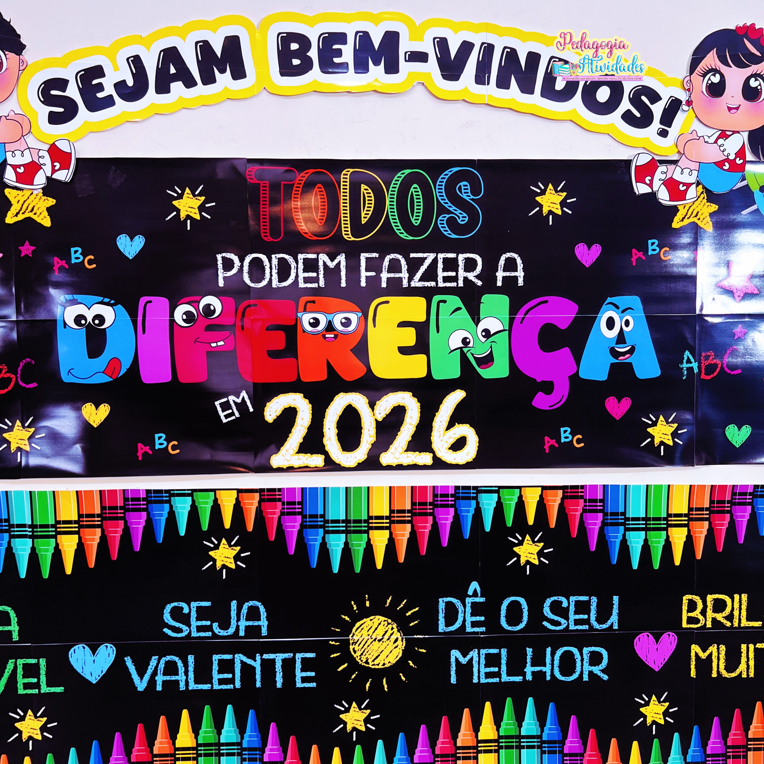 O Painel Volta às Aulas 2026 encanta com sua ilustração colorida, frases motivadoras e visual alegre, criando um ambiente acolhedor, inspirador e cheio de boas energias para o novo ano letivo ✨📚